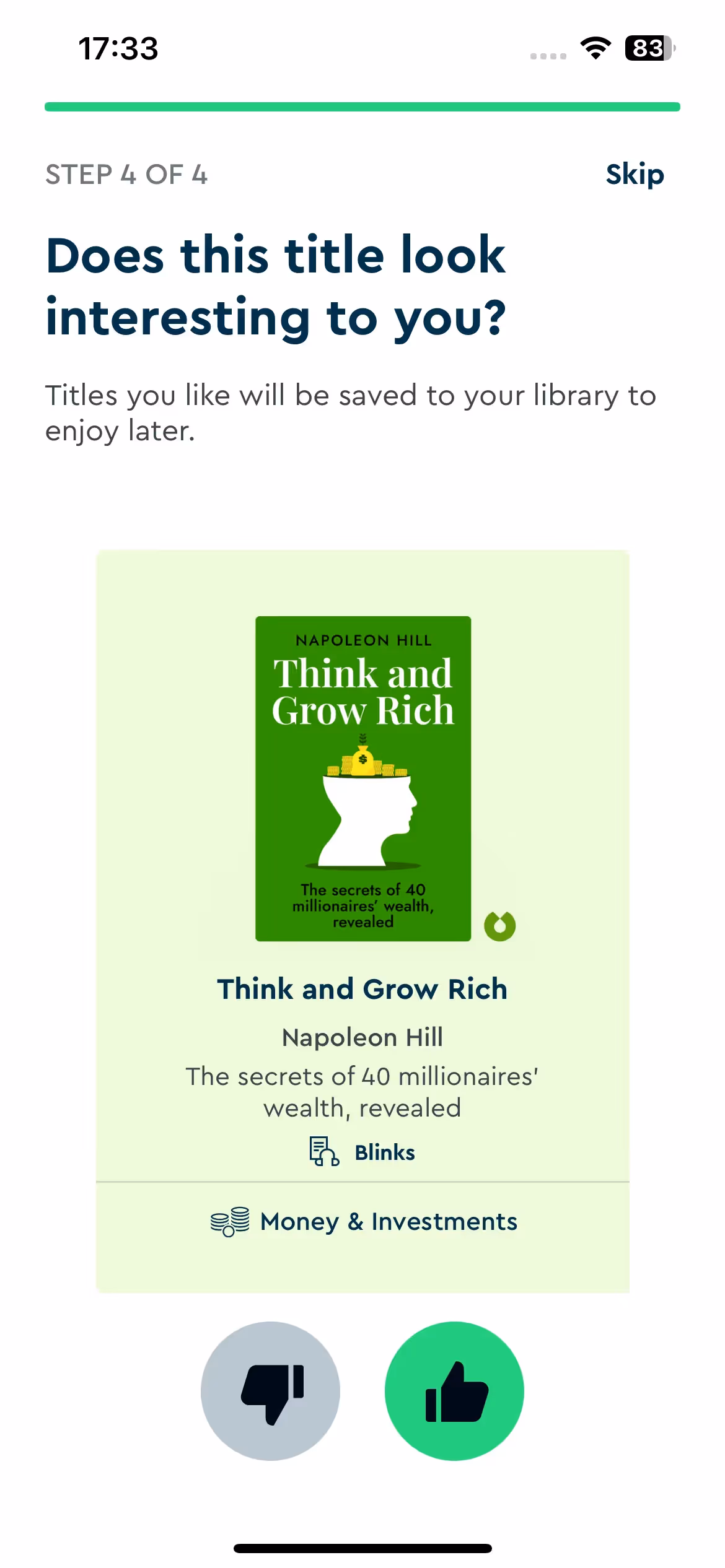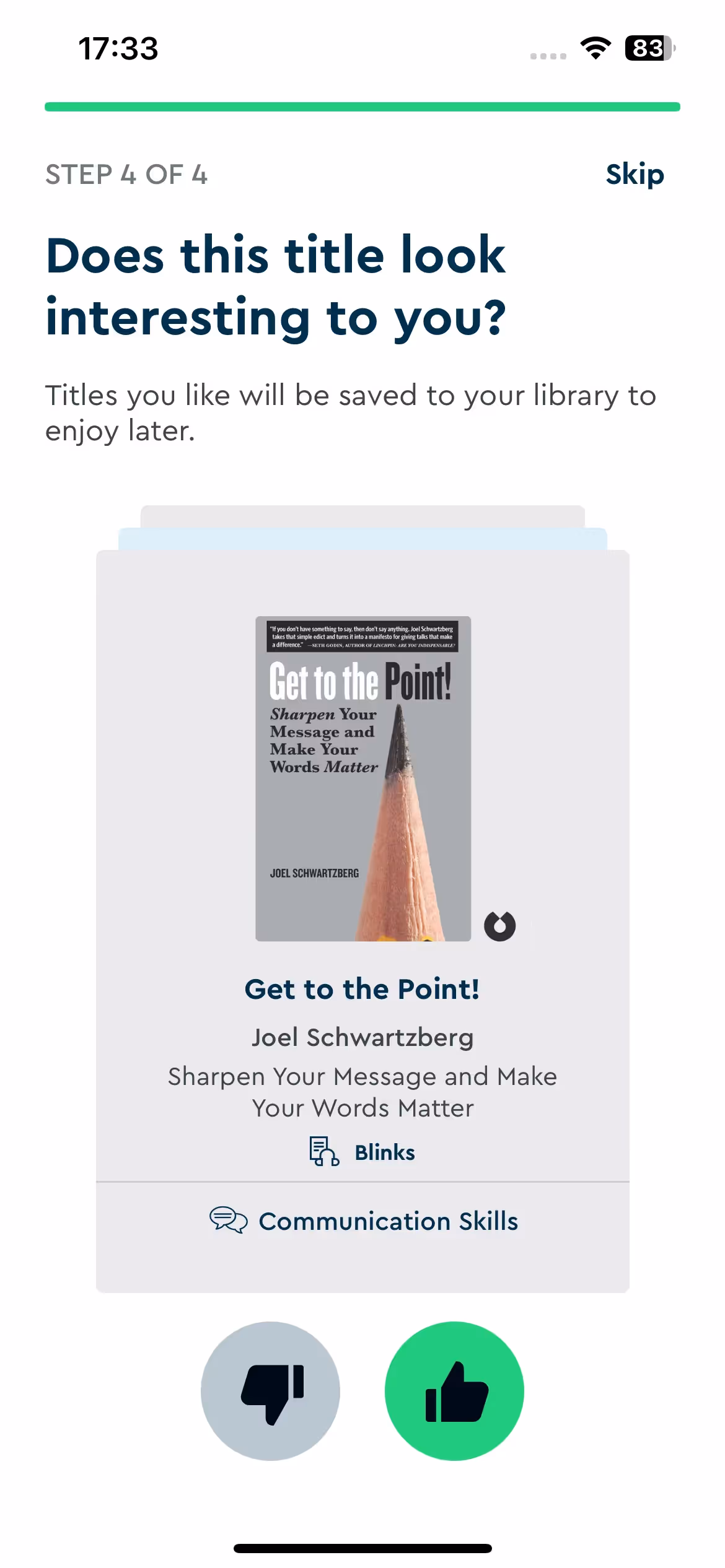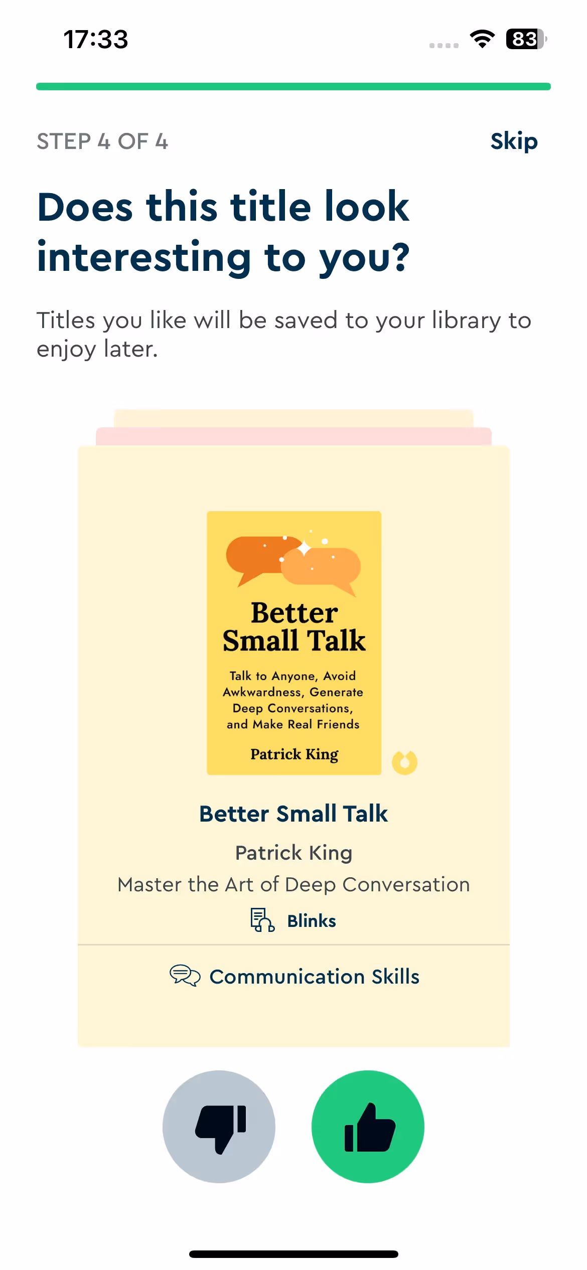 Blinkist's strength lies in reading goal assessment during setup. The onboarding explores whether users seek professional development, personal growth, or general knowledge to recommend appropriate book categories.