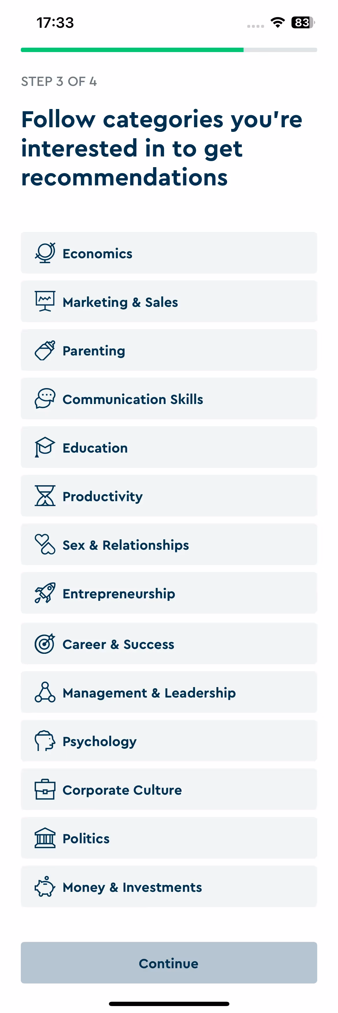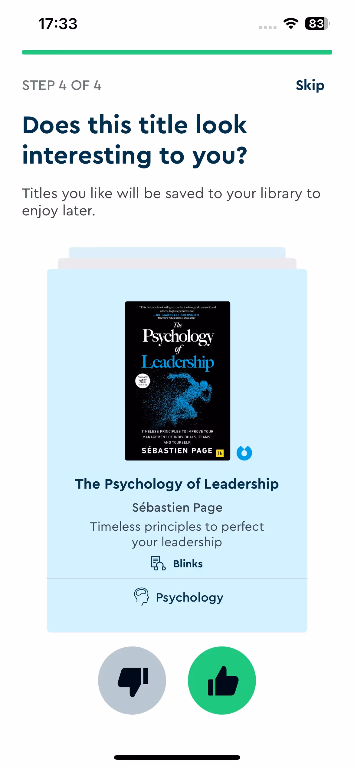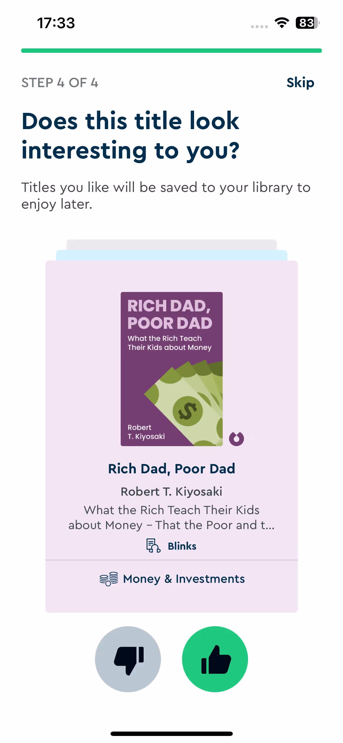 Blinkist's strength lies in reading goal assessment during setup. The onboarding explores whether users seek professional development, personal growth, or general knowledge to recommend appropriate book categories.
