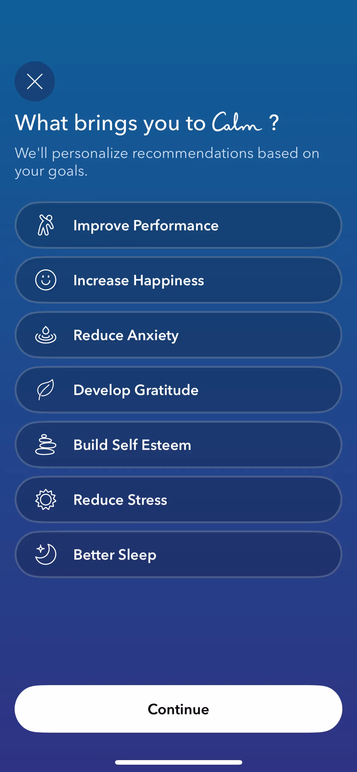 Their goal selection process covers diverse user needs—sleep improvement, anxiety reduction, focus enhancement, or general meditation practice. The onboarding adapts content recommendations based on these initial preferences.