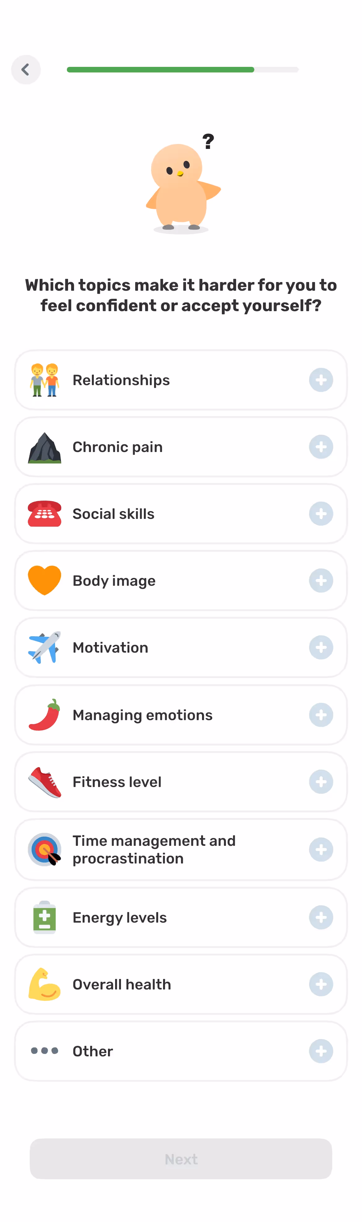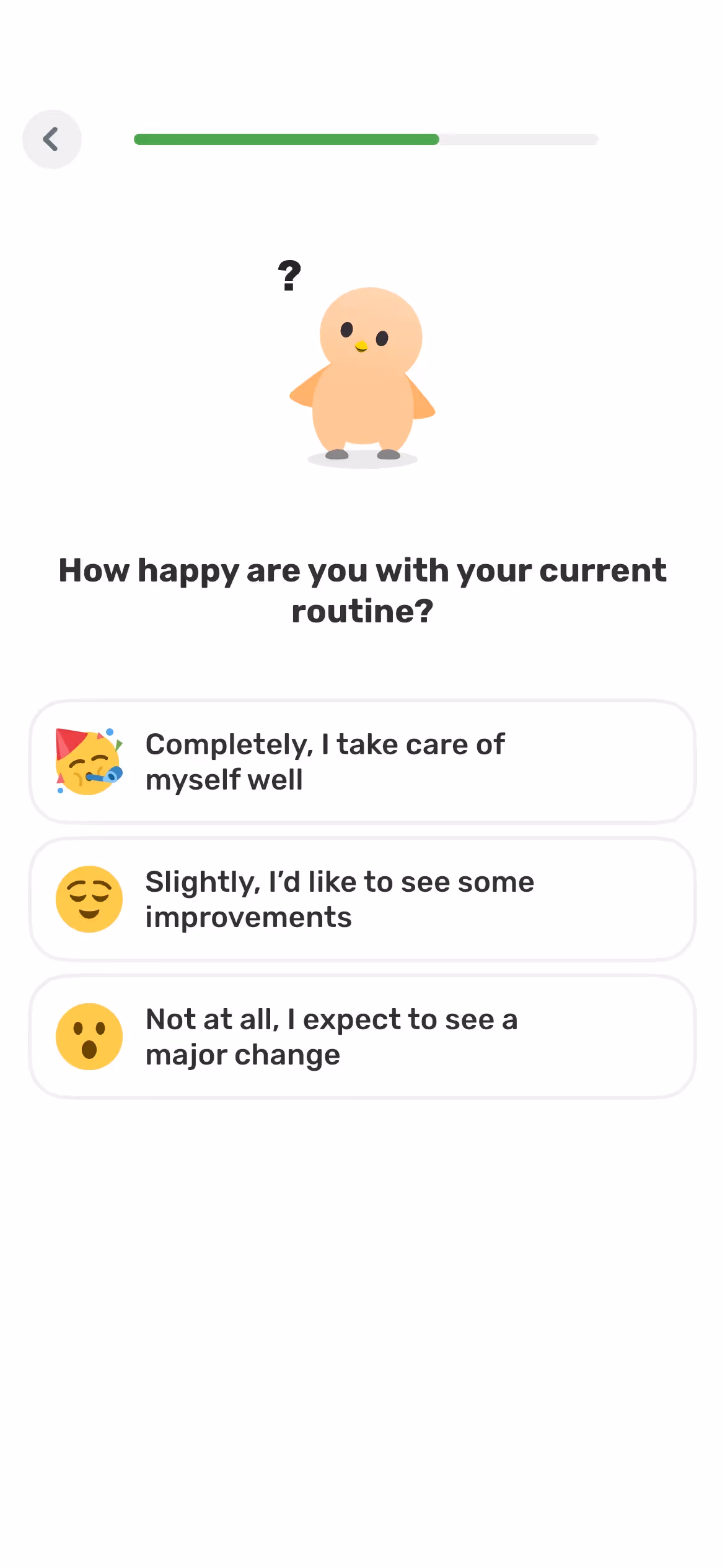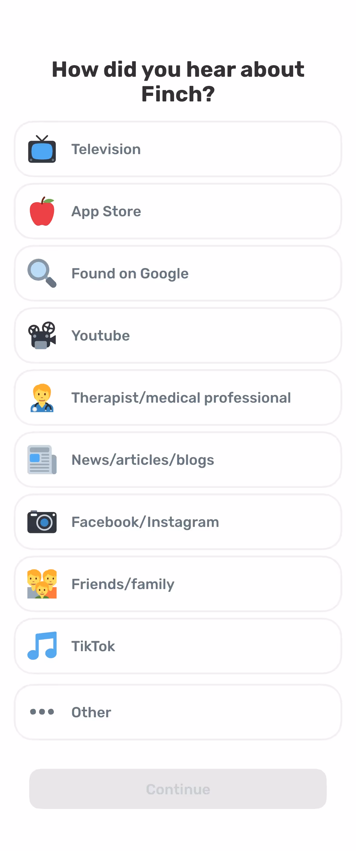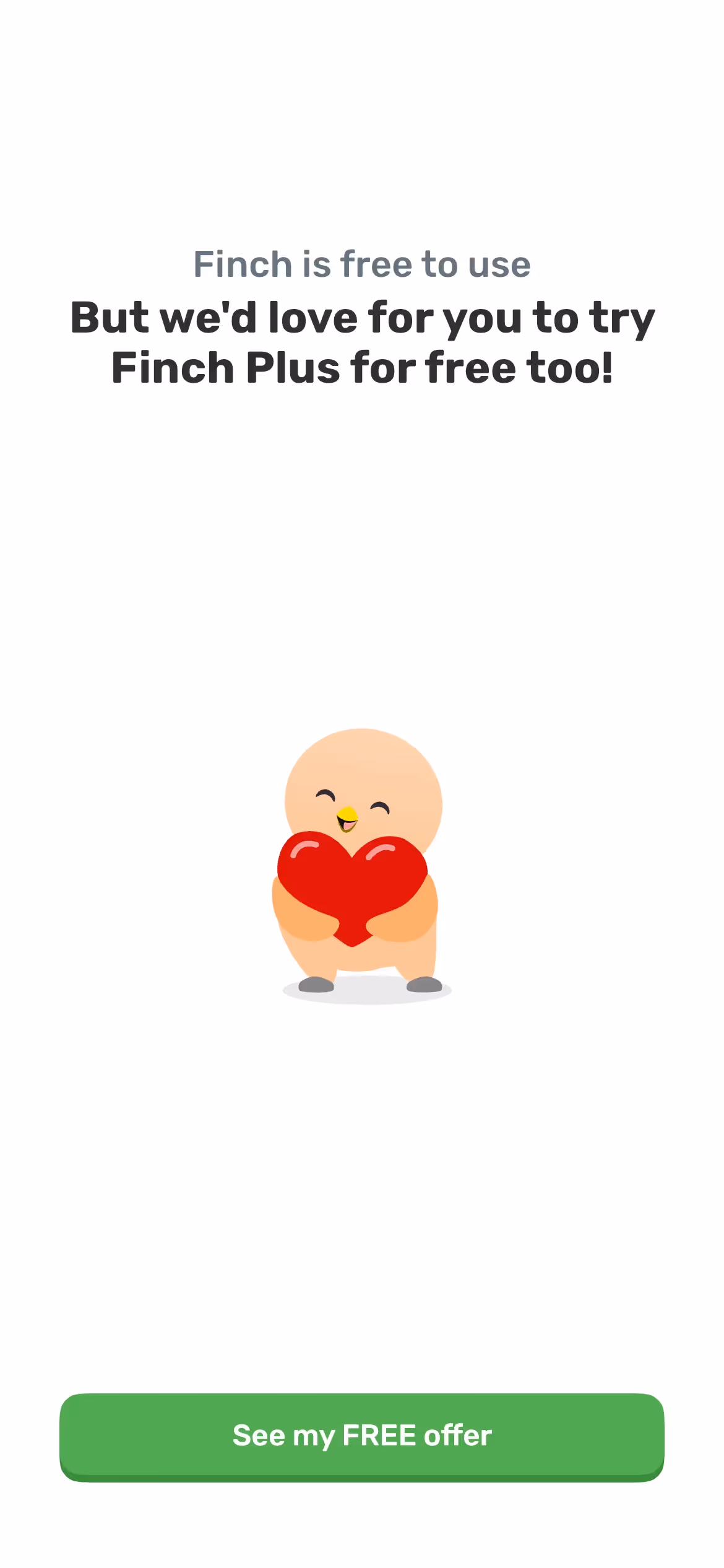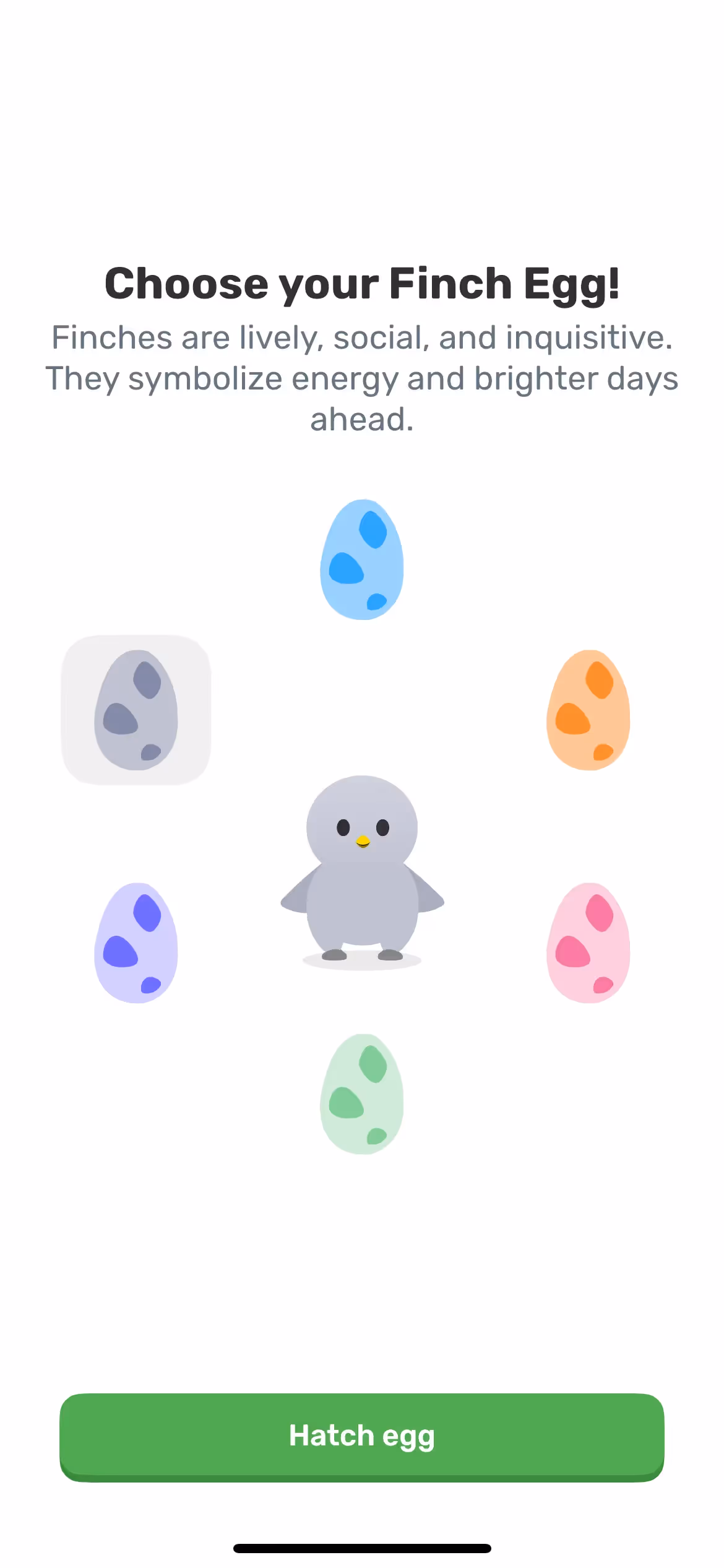 Finch's approach focuses on habit selection and pet customization during setup. The onboarding helps users choose realistic self-care goals while creating emotional connection to their virtual companion.