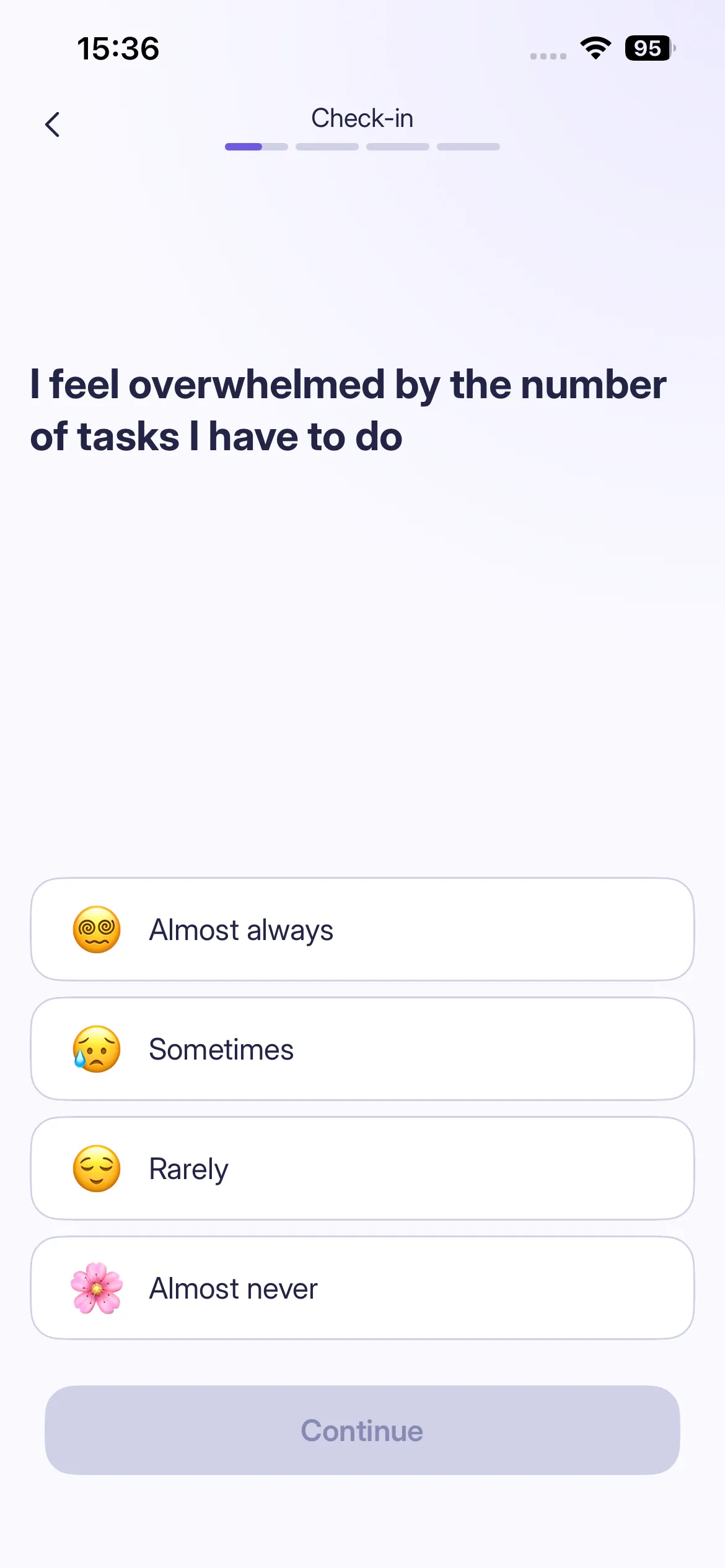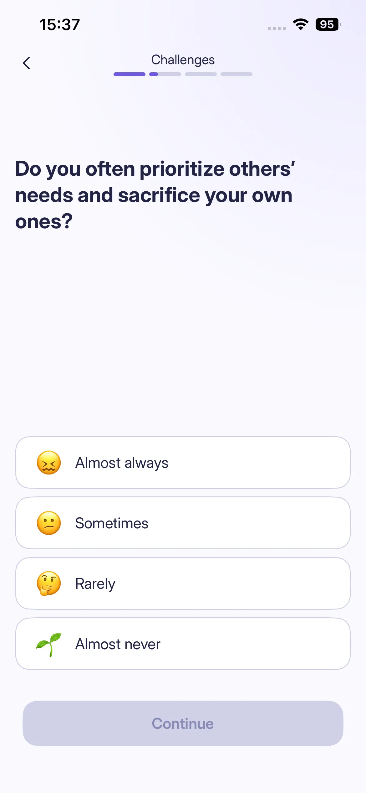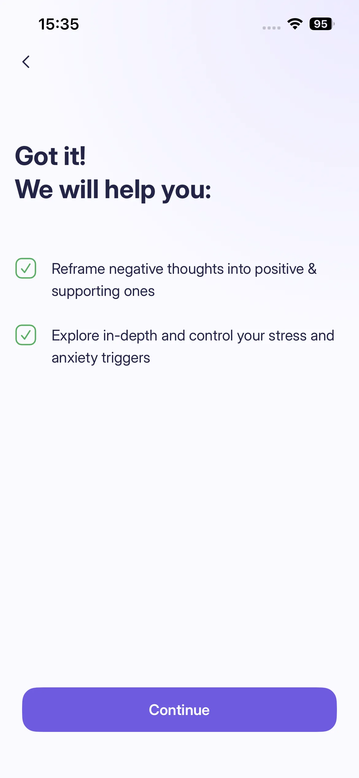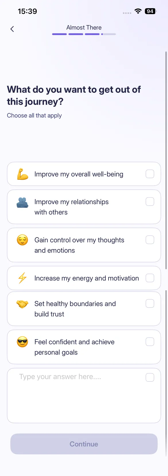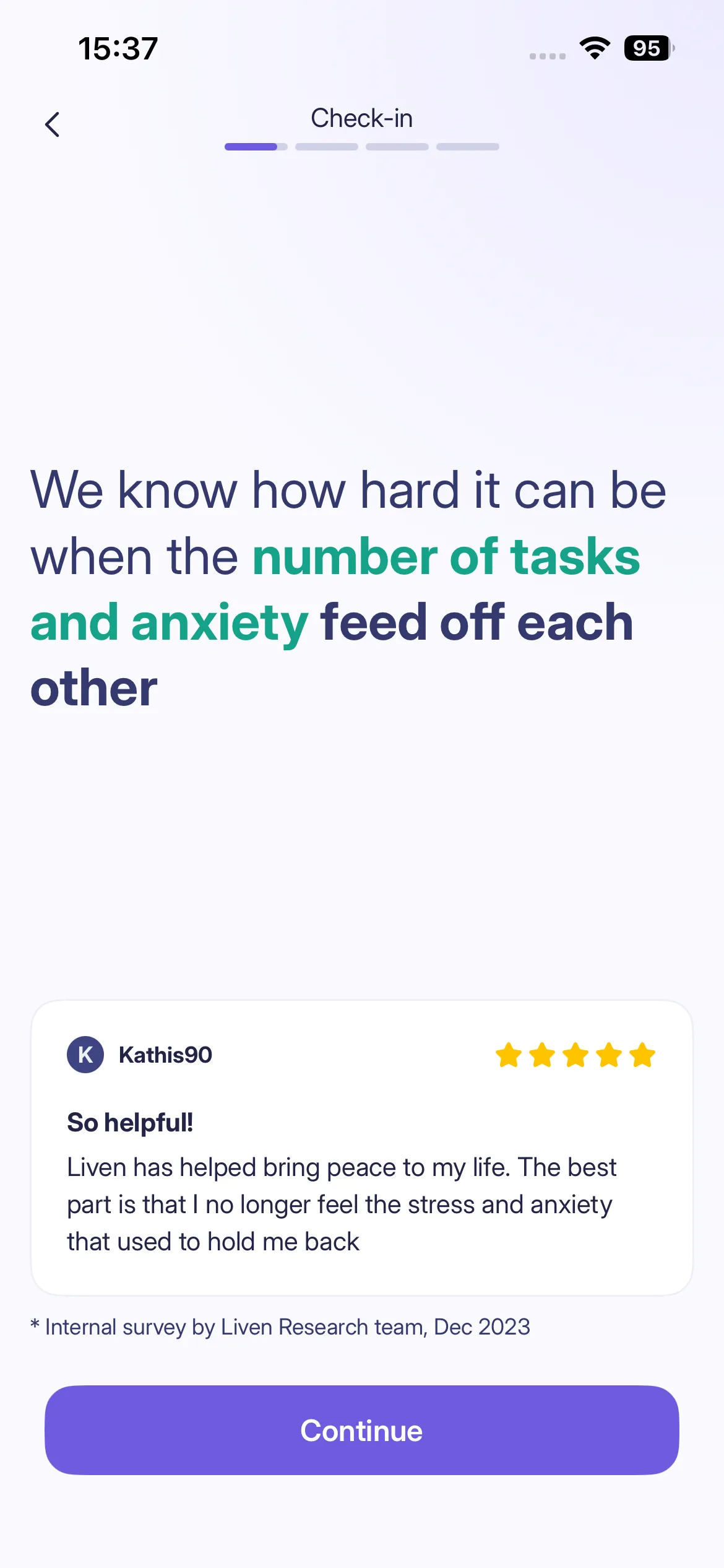 These screens show Liven’s App Onboarding Flow. It begins with a short test to understand user’s well-being goals (e.g. emotional triggers, stress levels), then offers a personalized program of journaling, mood tracking, and mindfulness tools. Daily tasks and self-reflection features are introduced early.