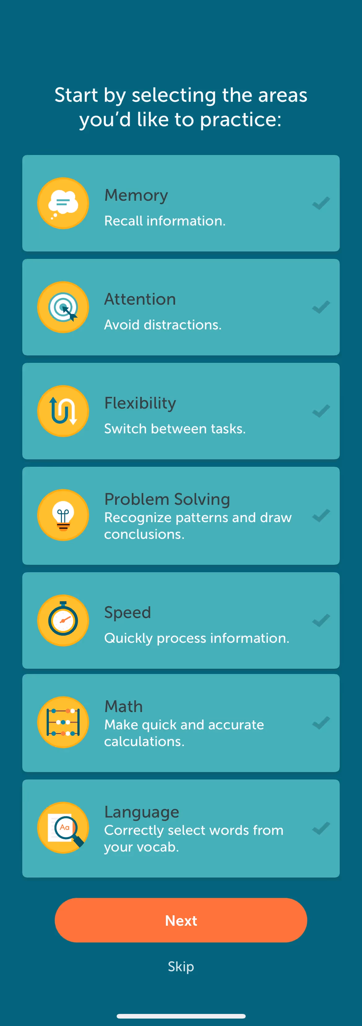 The cognitive domains and skill tracking get clear explanation during setup. Users learn how memory, attention, flexibility, speed, and problem-solving abilities are developed through targeted exercises.