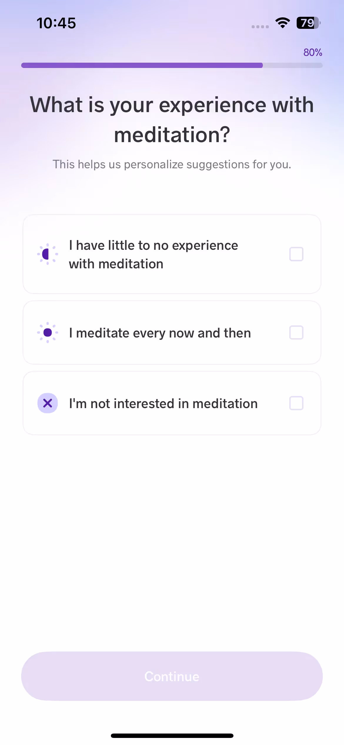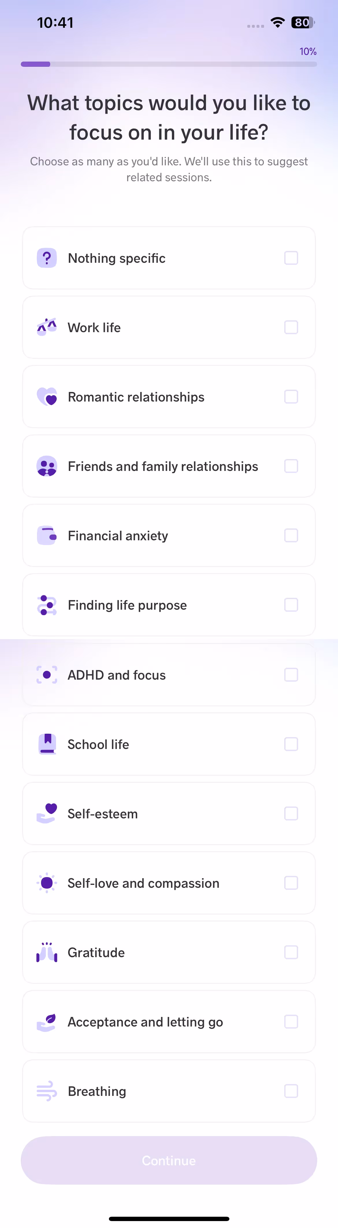 Meditopia excels at emotional needs assessment during setup. The onboarding explores current life challenges and stress sources to recommend relevant meditation topics and sleep story themes.