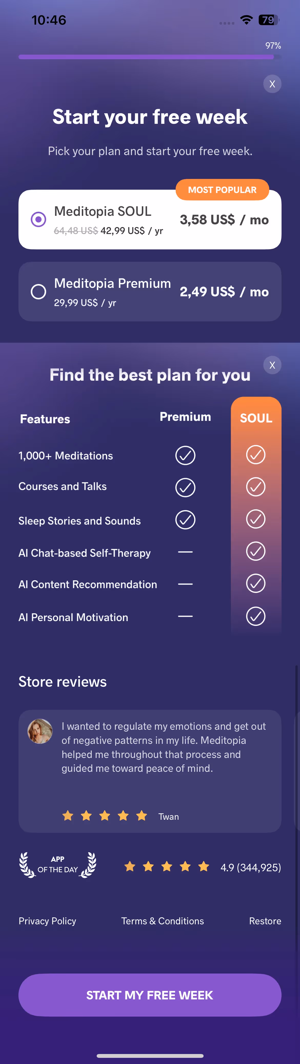 Our detailed screenshots reveal how Meditopia uses warm visual design and personal language to create emotional safety and openness to vulnerable mental health work.
