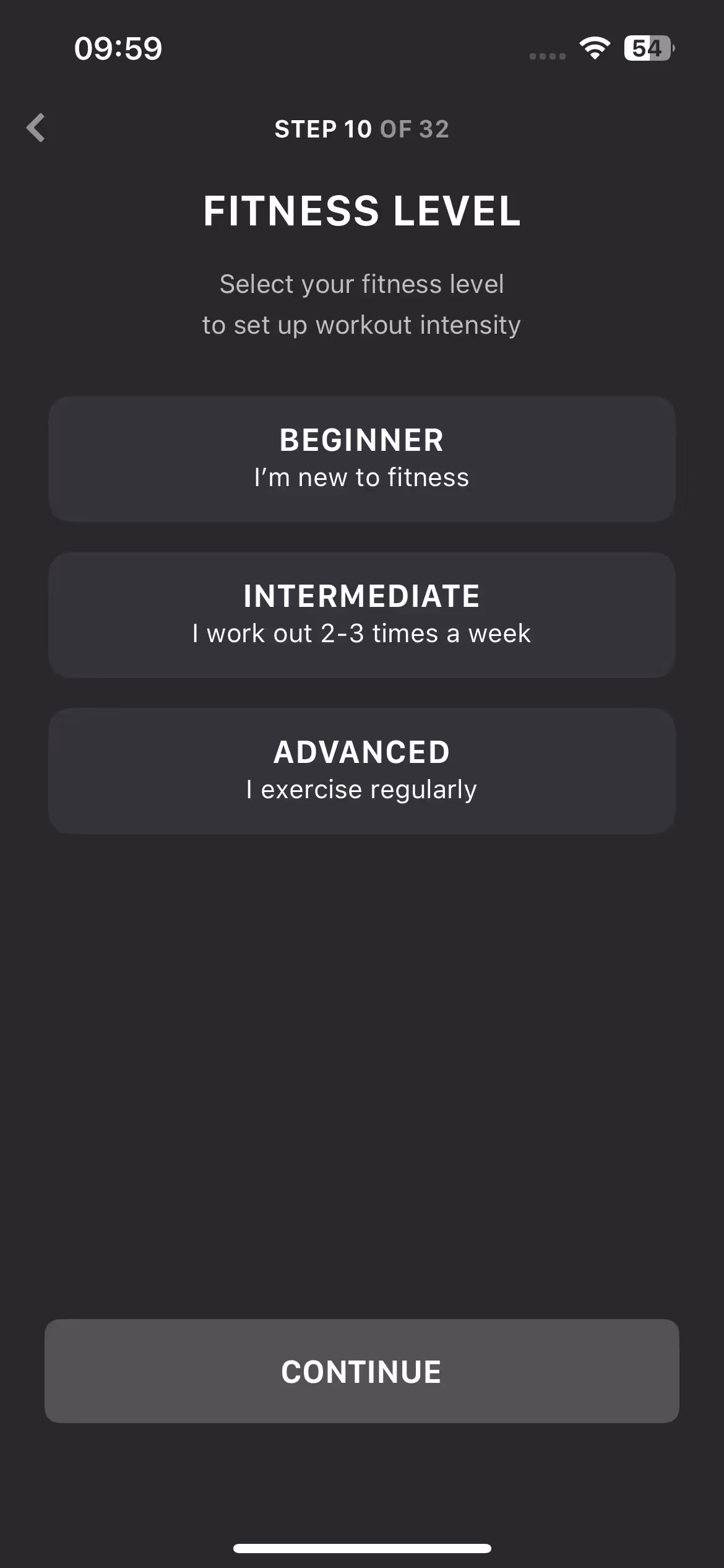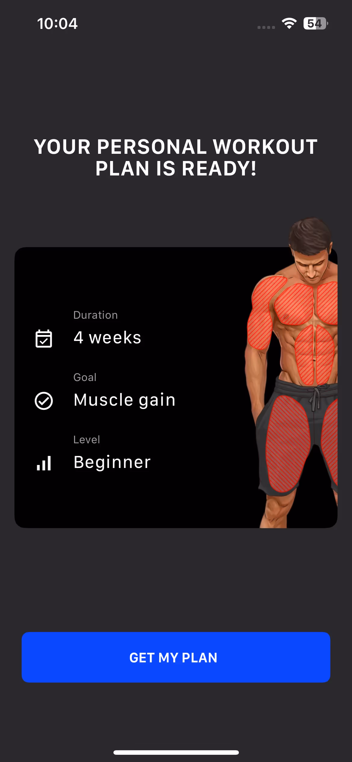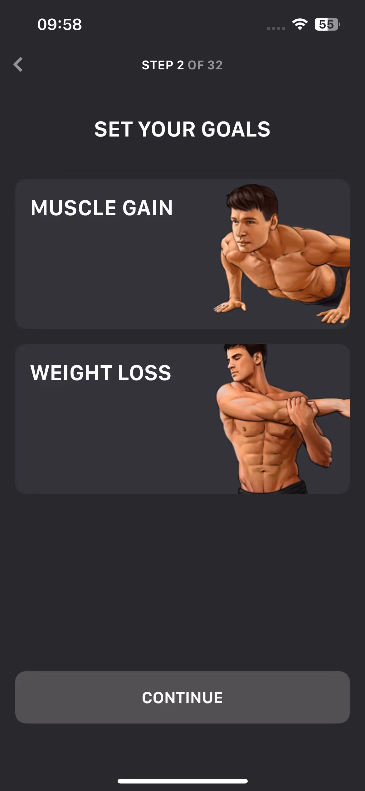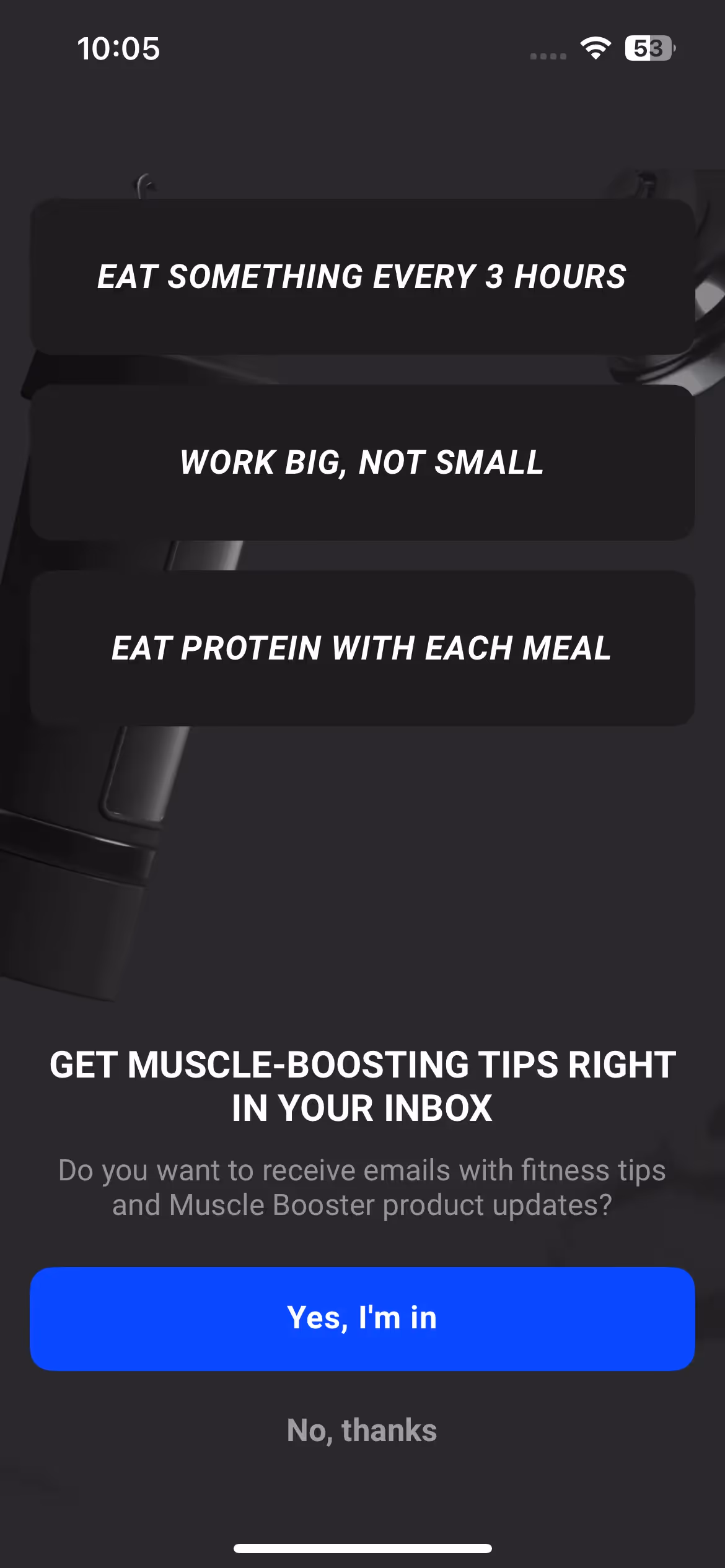 Muscle Booster excels at physique goal identification during setup. The onboarding explores whether users want general fitness, muscle size, strength gains, or specific body part development to recommend appropriate programs.