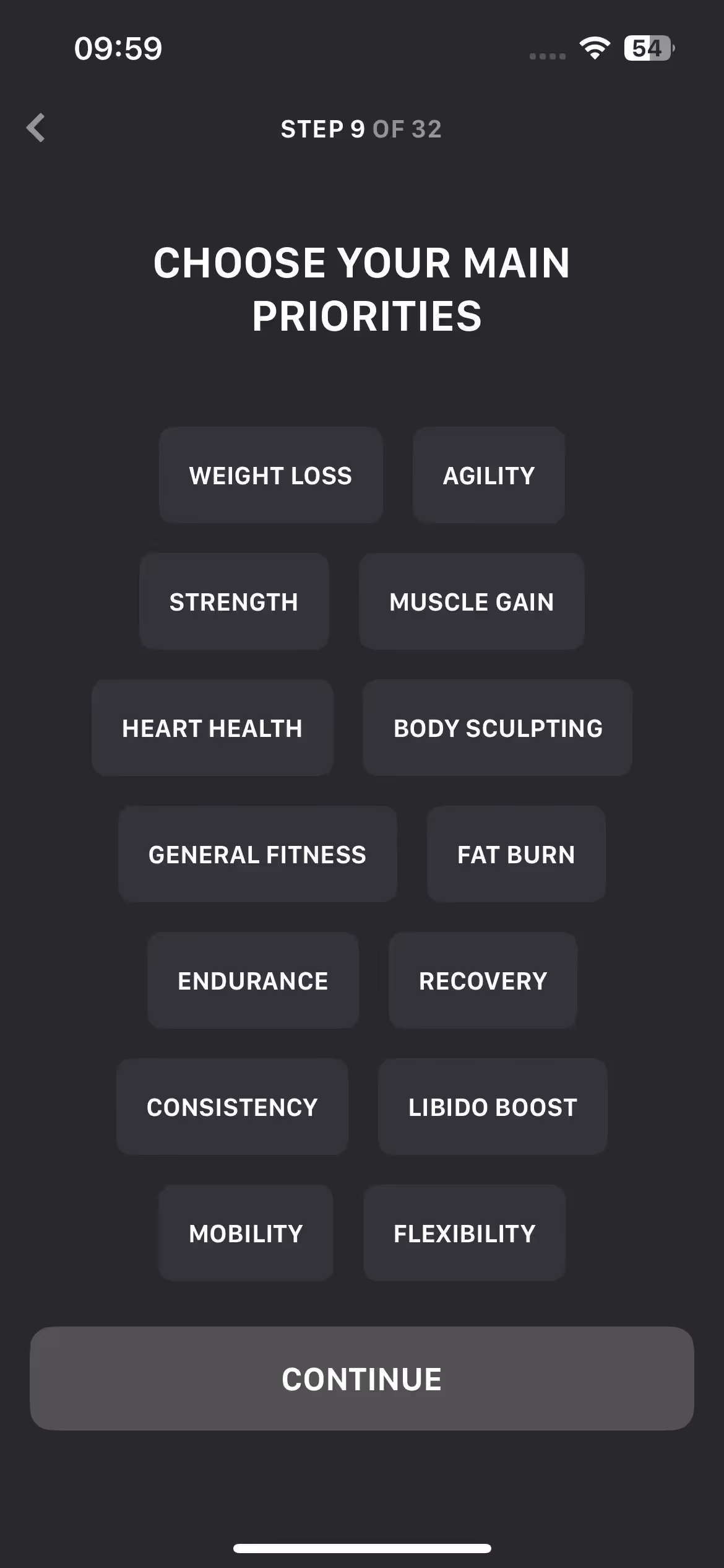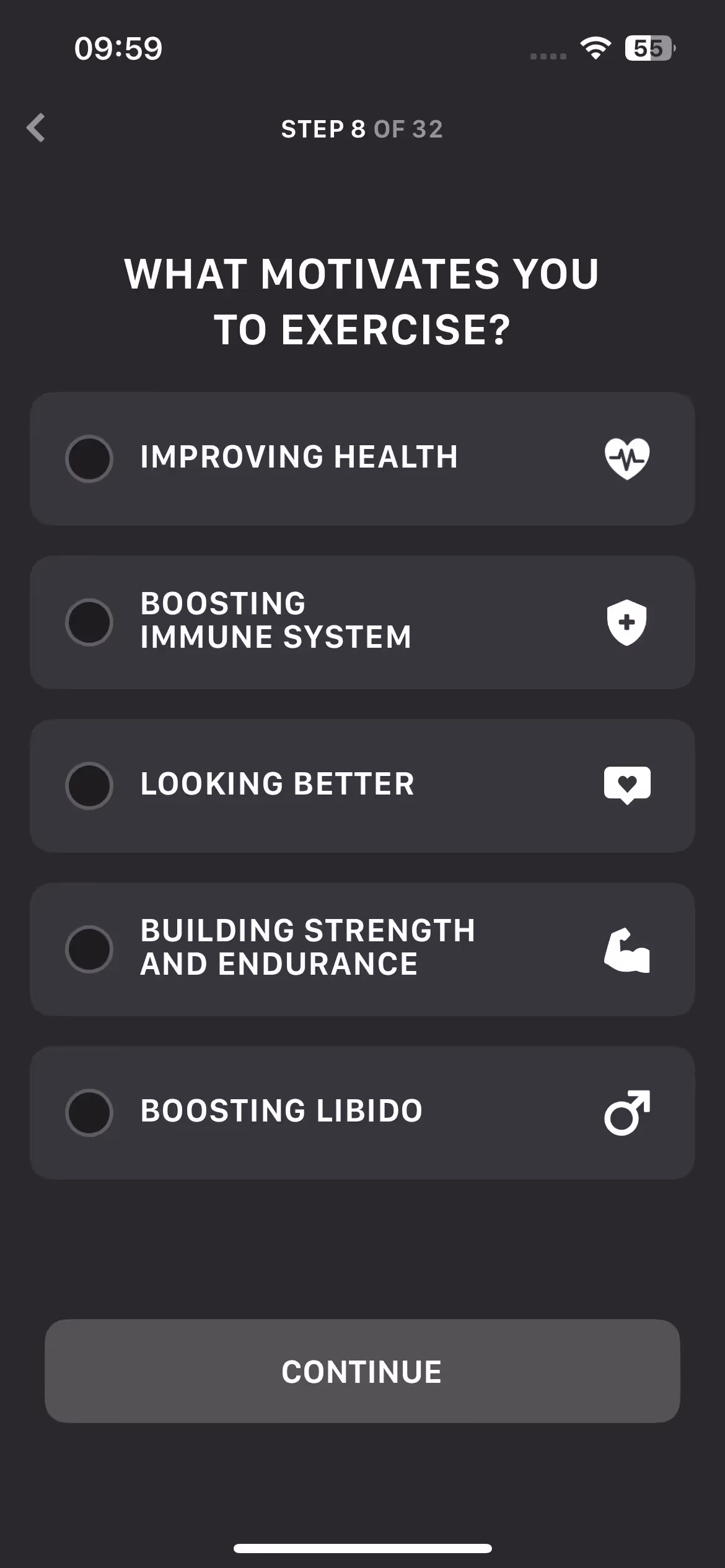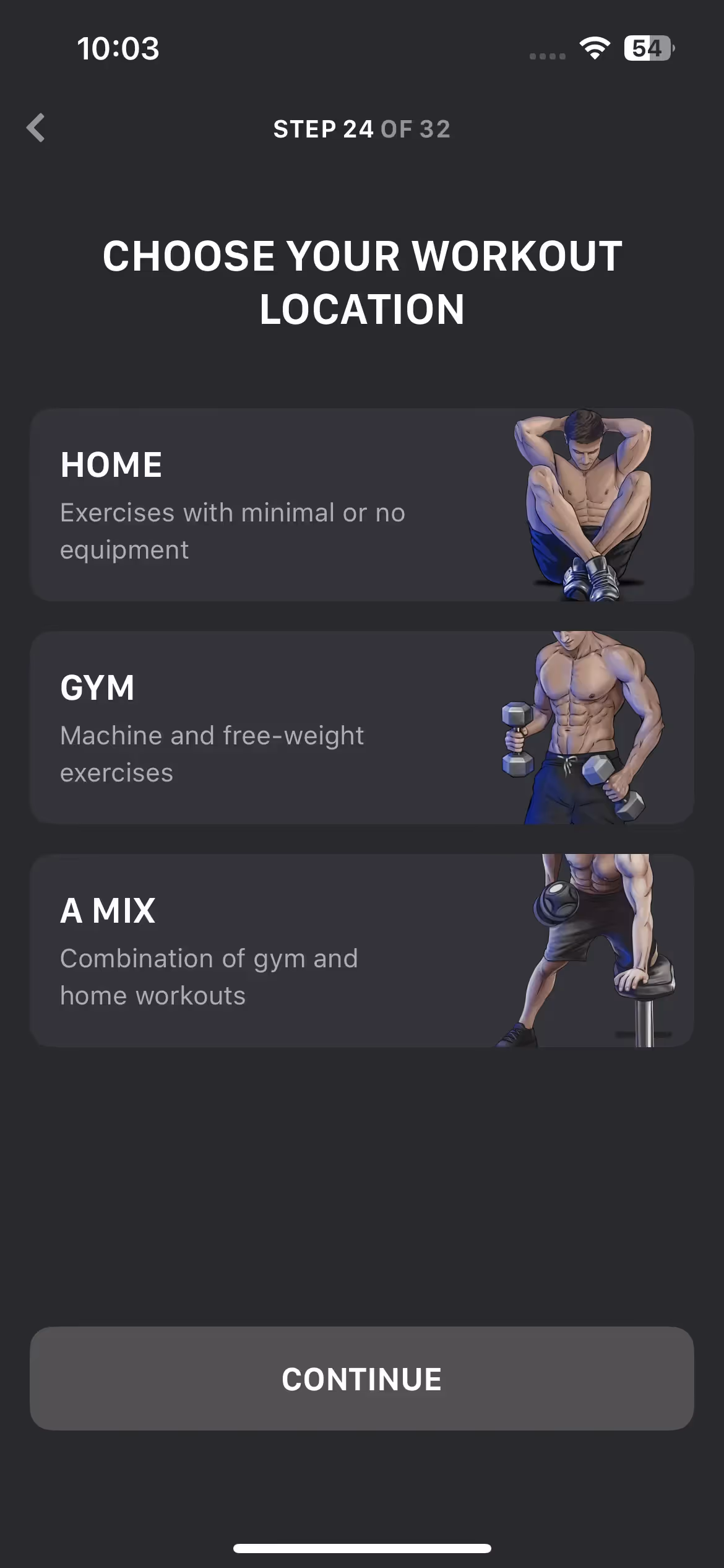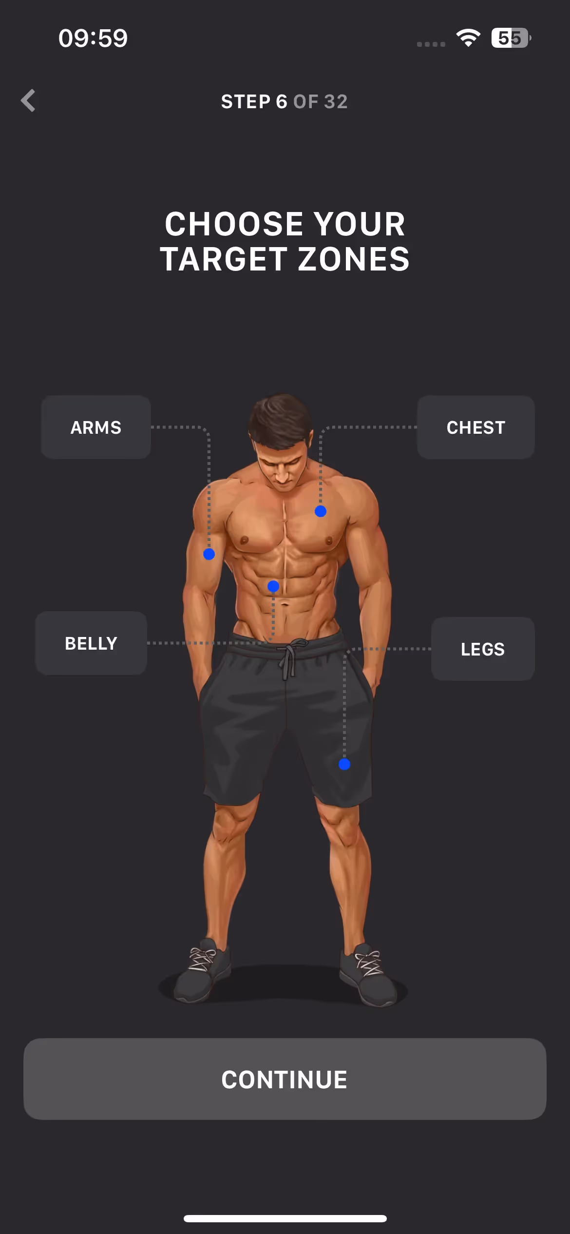 Muscle Booster excels at physique goal identification during setup. The onboarding explores whether users want general fitness, muscle size, strength gains, or specific body part development to recommend appropriate programs.