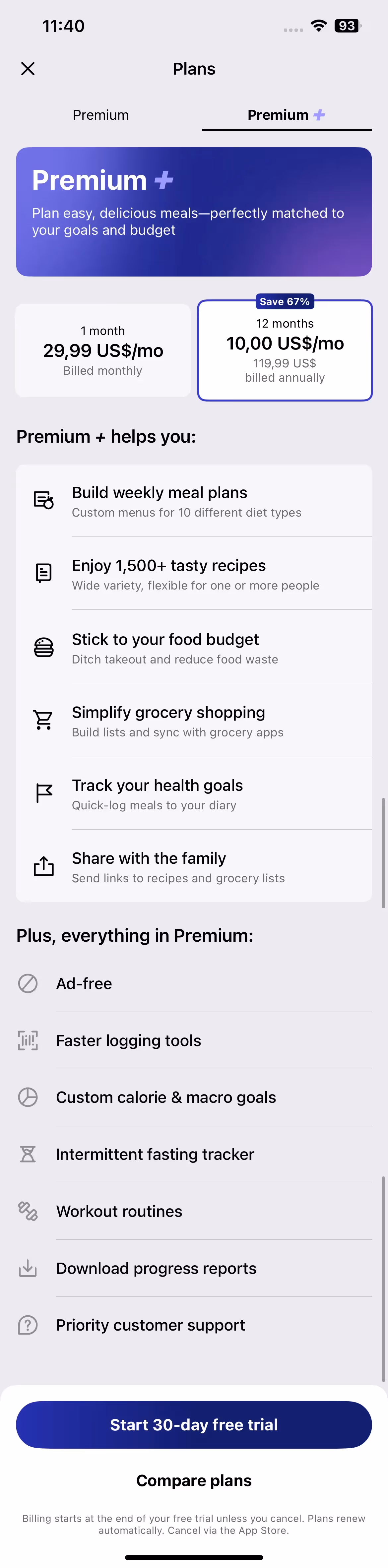 The food logging introduction uses familiar concepts first. Users learn basic entry methods before discovering advanced features like barcode scanning, recipe creation, or macro tracking. This progression reduces cognitive load while building confidence.