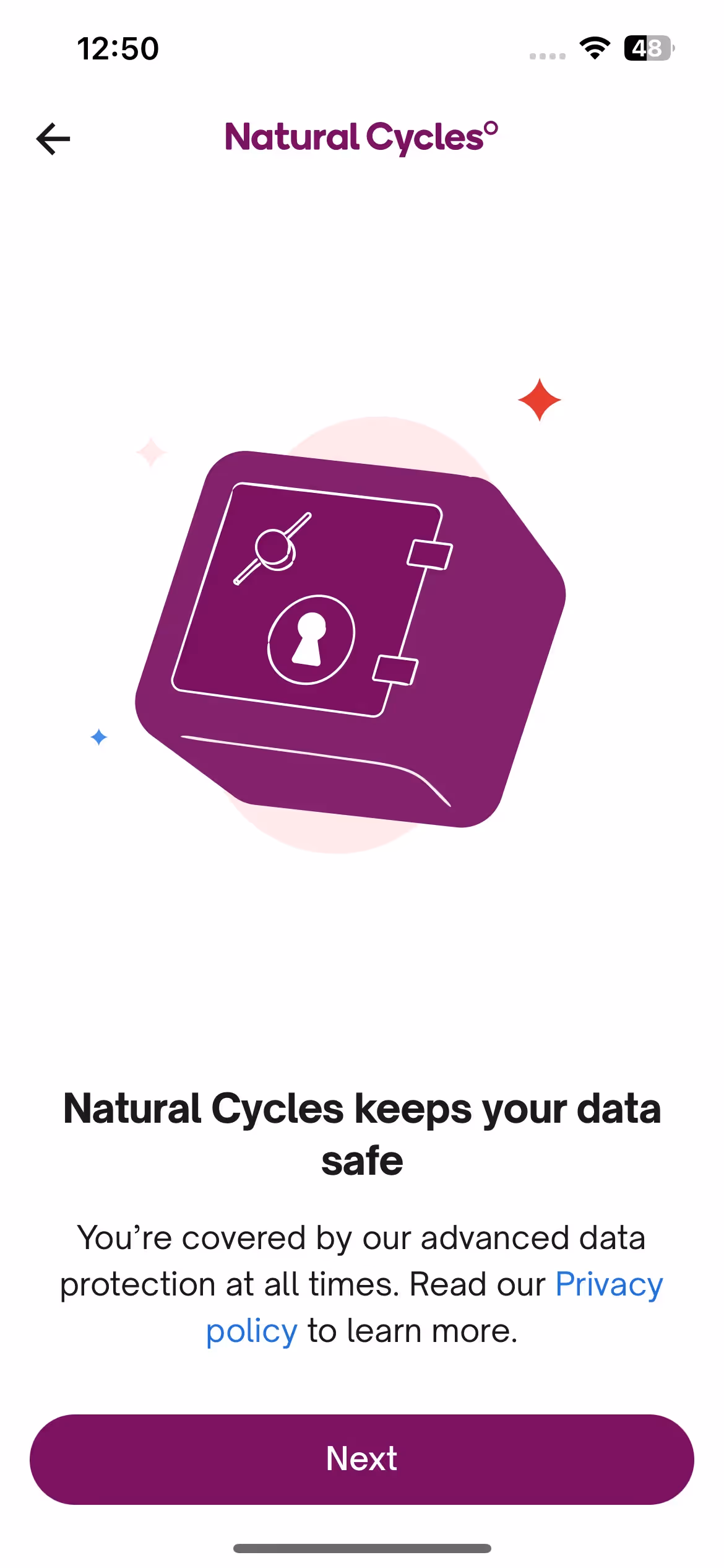 Our detailed screenshots show how Natural Cycles handles sensitive health data with robust privacy controls and clear data usage explanations during initial setup.