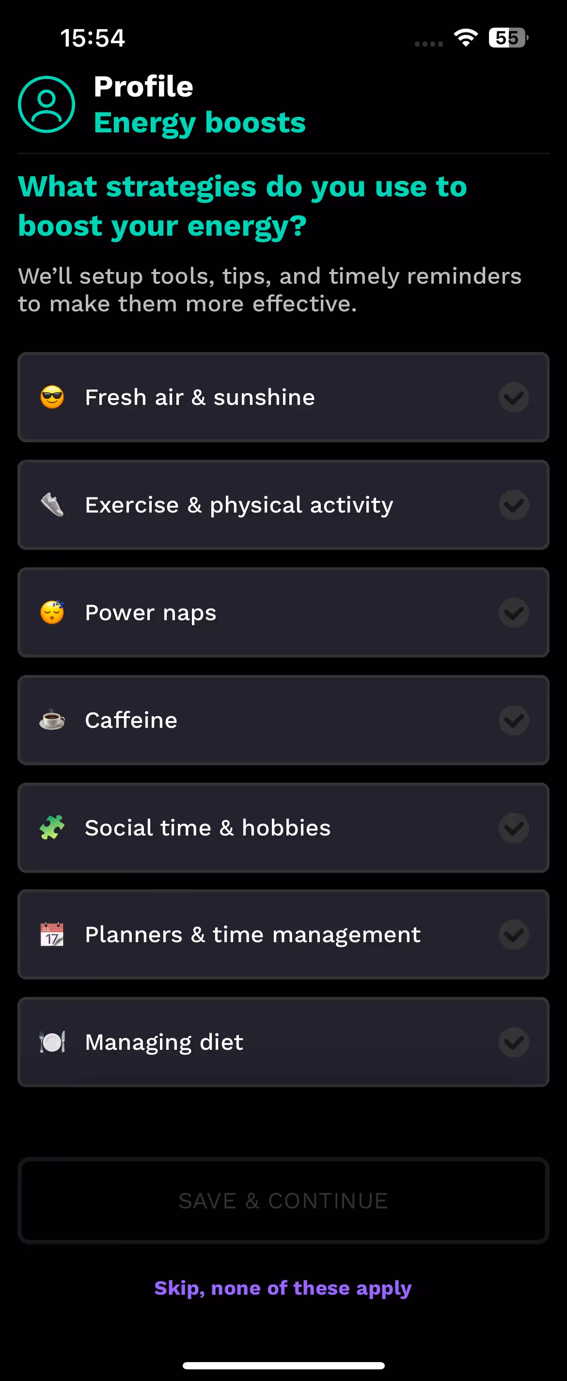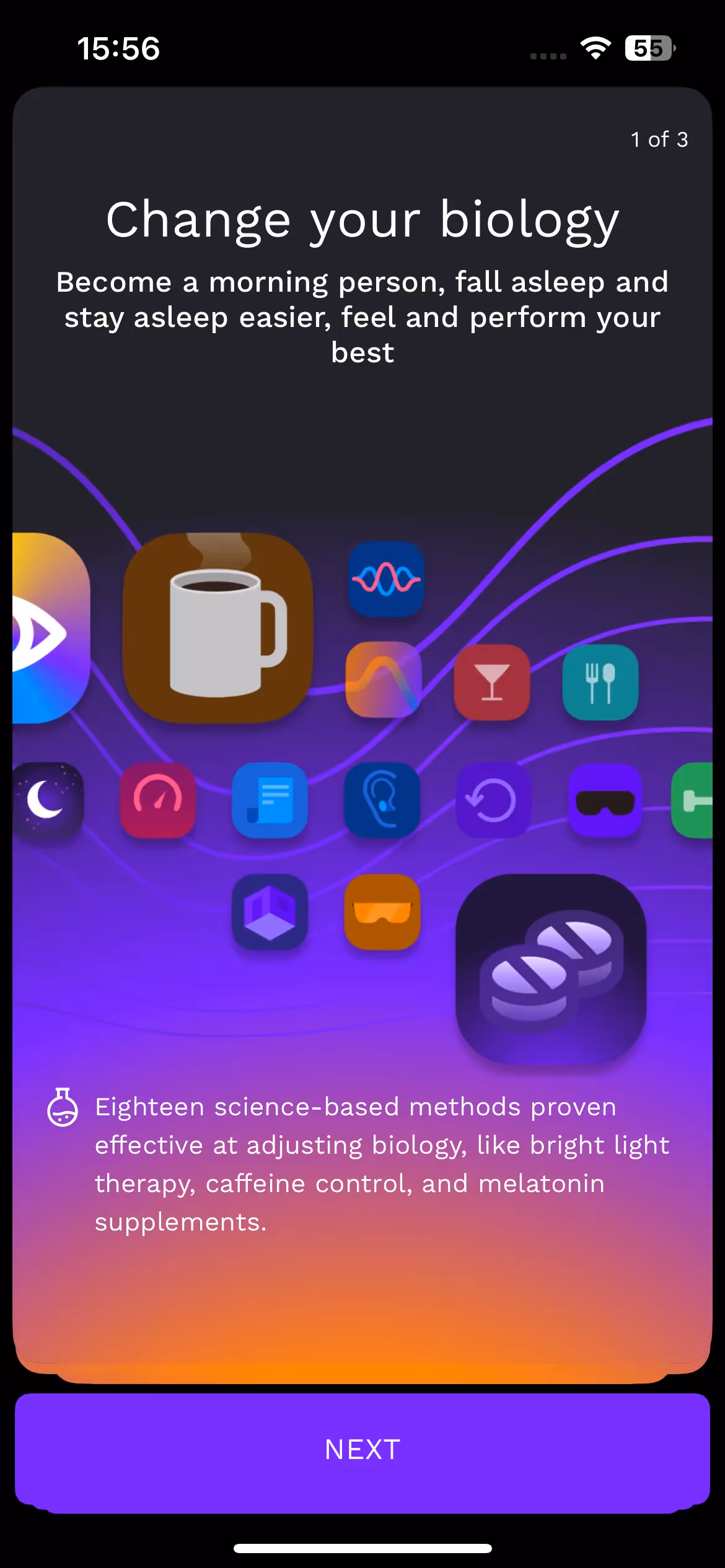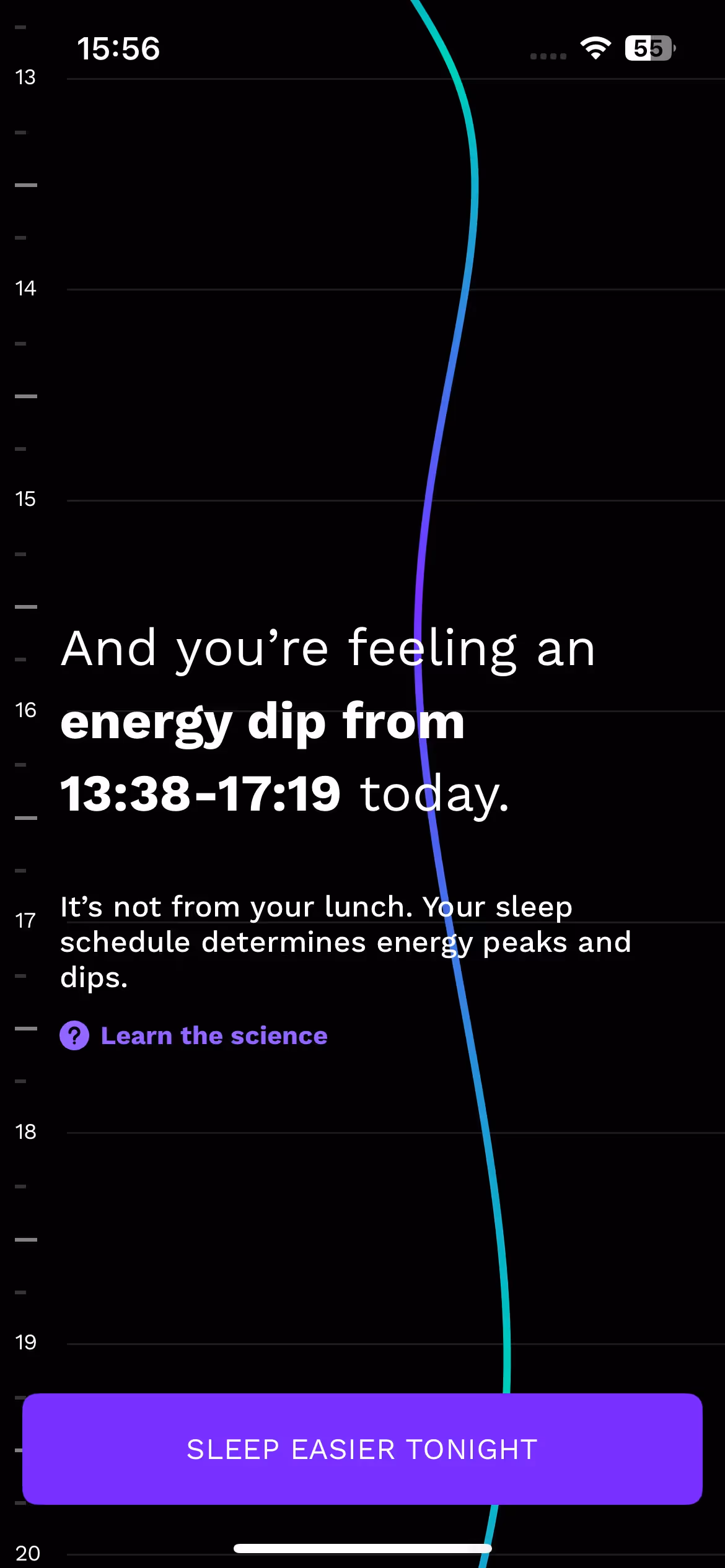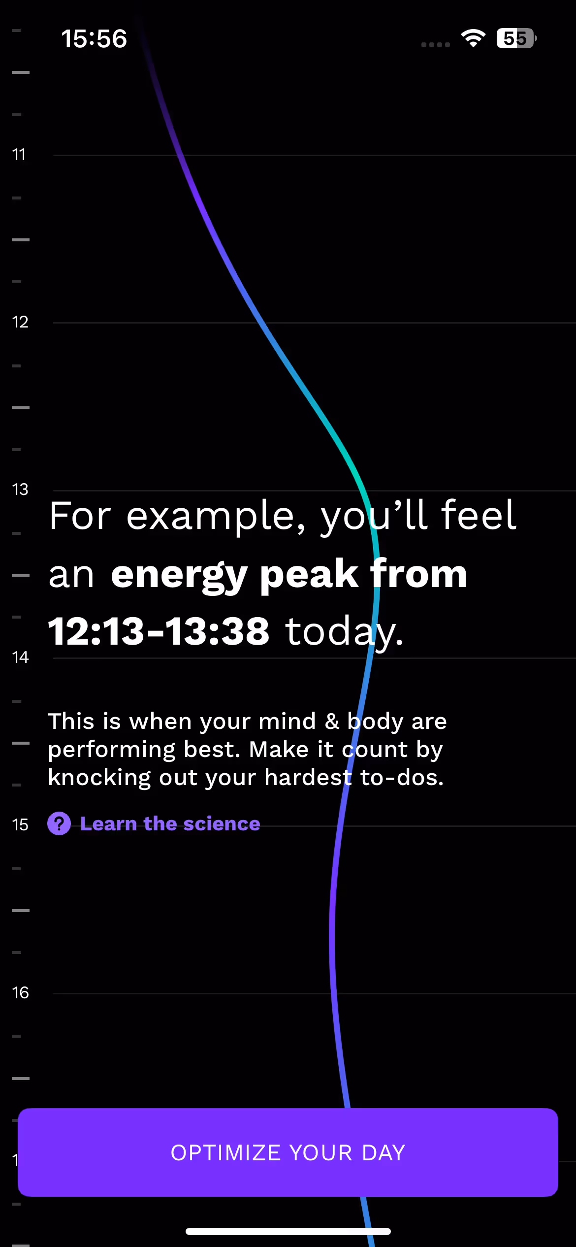 Their energy timeline feature receives detailed introduction during onboarding. Users learn how circadian rhythms predict natural energy peaks and valleys throughout the day for optimal scheduling.
