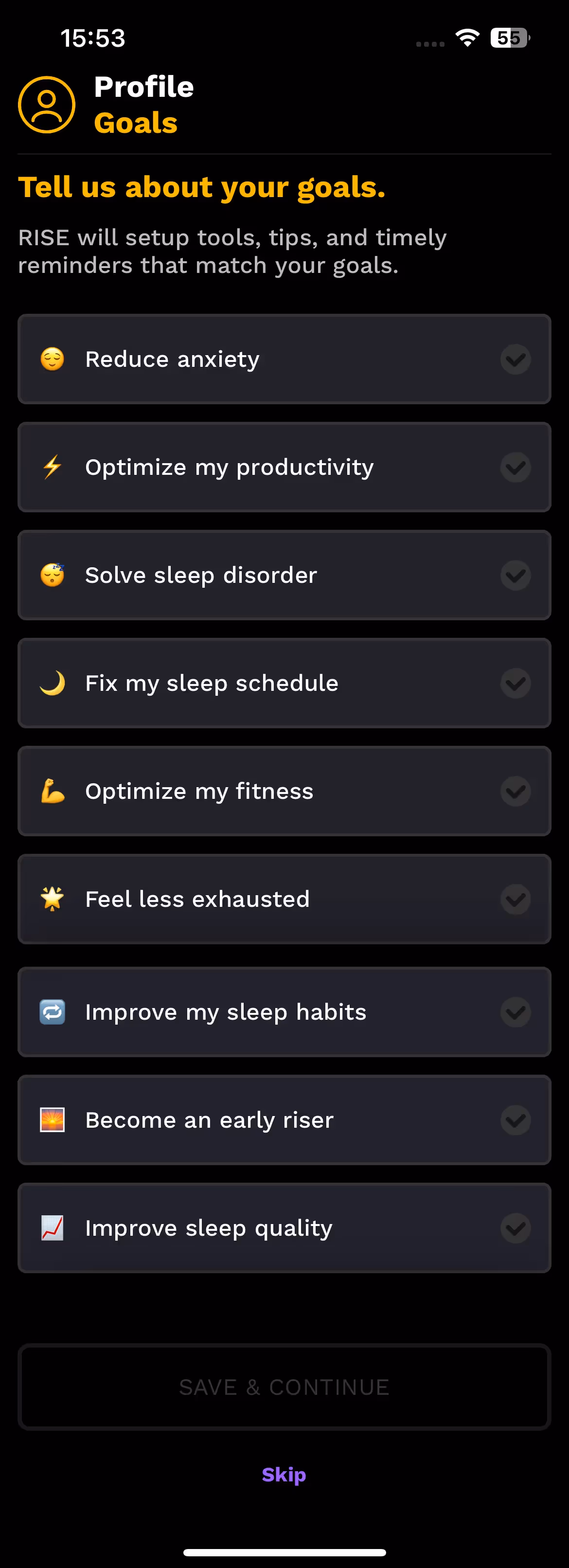 RISE's approach emphasizes sleep debt calculation during setup. The onboarding explains how cumulative sleep loss affects performance while showing how the app tracks and recommends recovery strategies.
