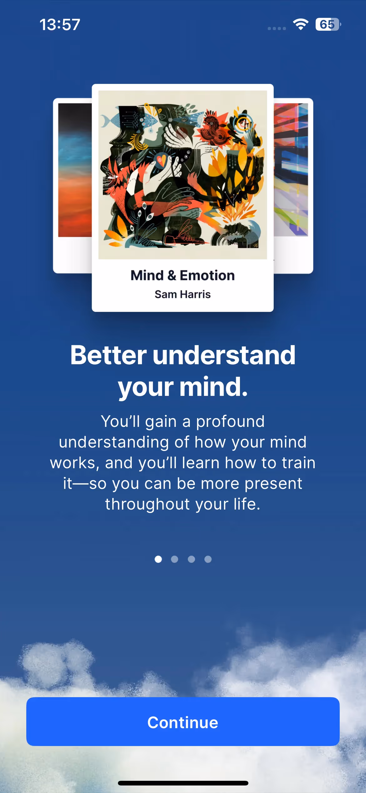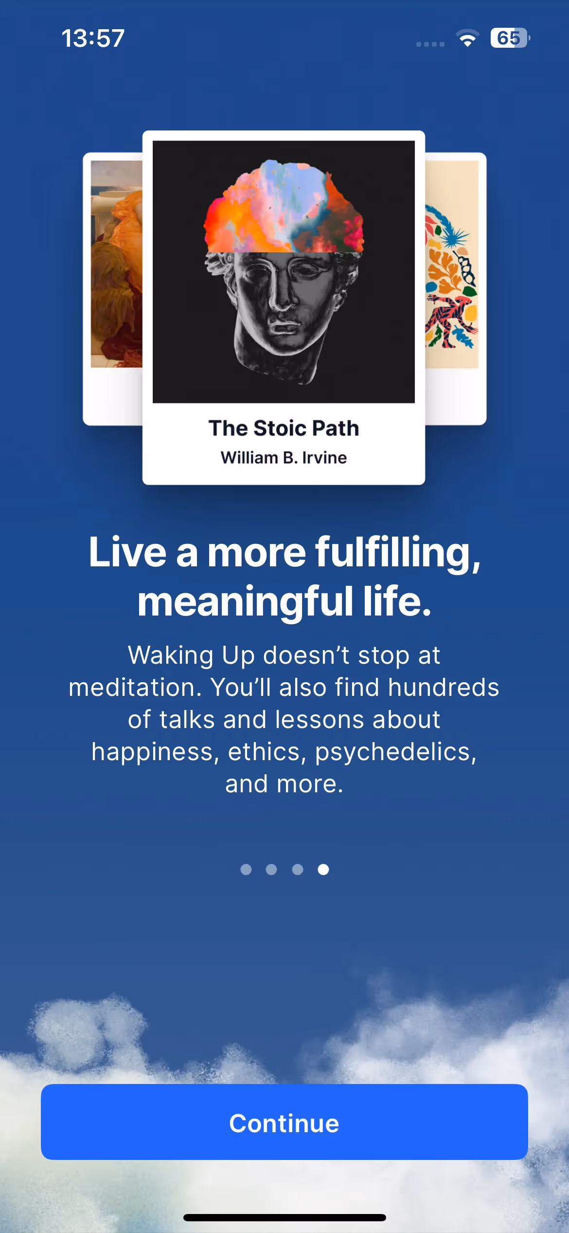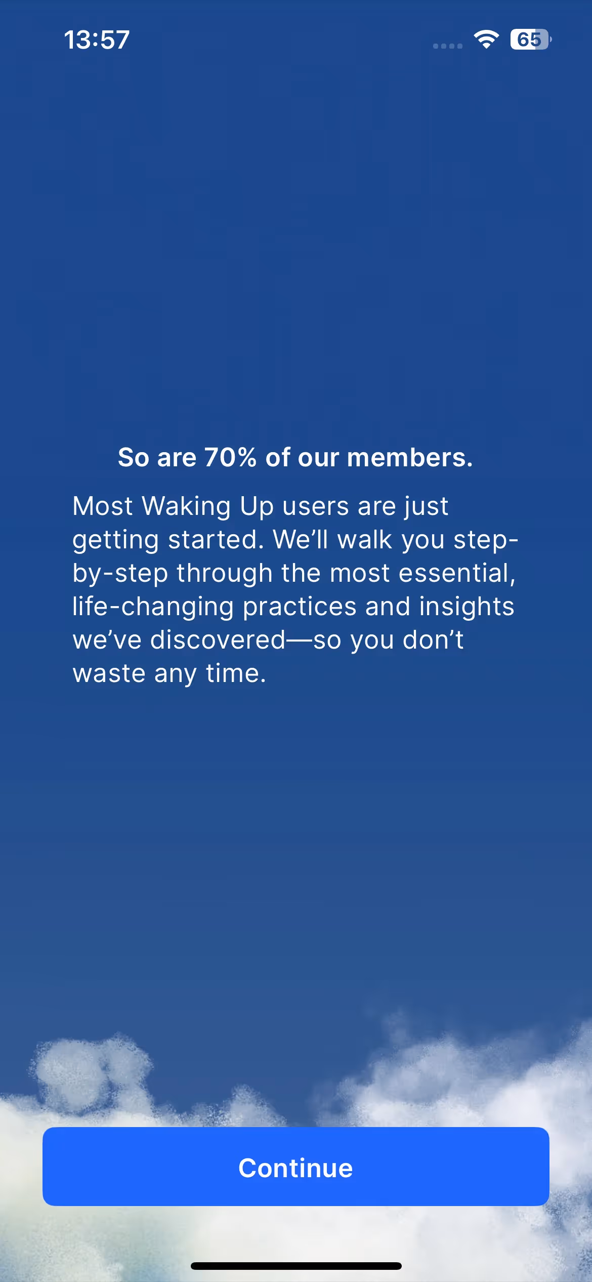 How does a philosophy-driven meditation app differentiate itself from mindfulness competitors? Waking Up's onboarding showcases how intellectual rigor and contemplative depth can appeal to users seeking more than stress relief from meditation practice.
