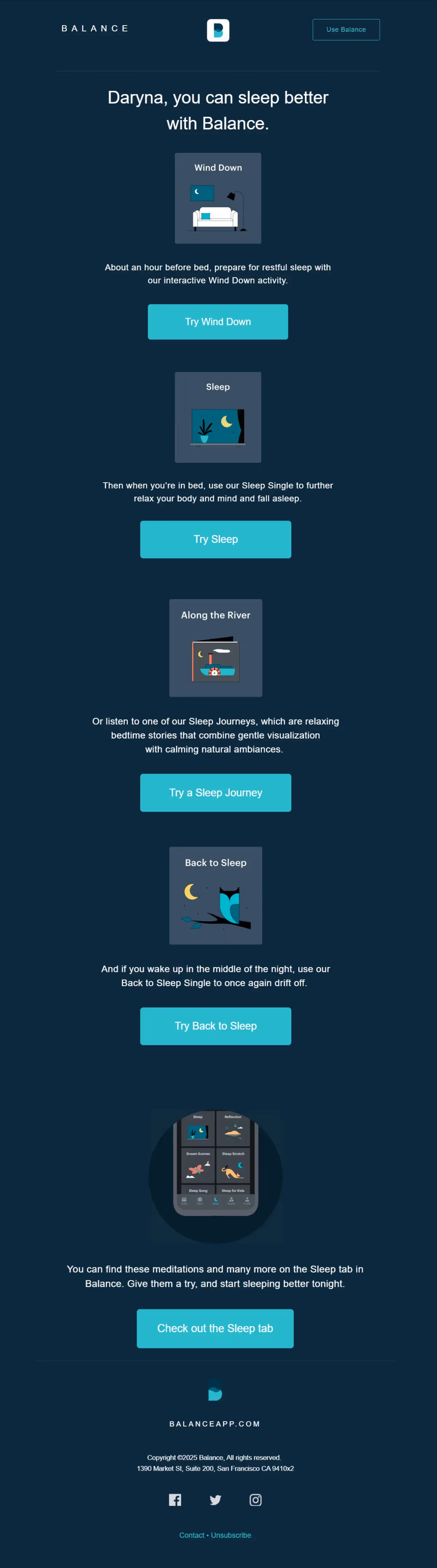 Balance: Meditation & Sleep Email Flow Screens