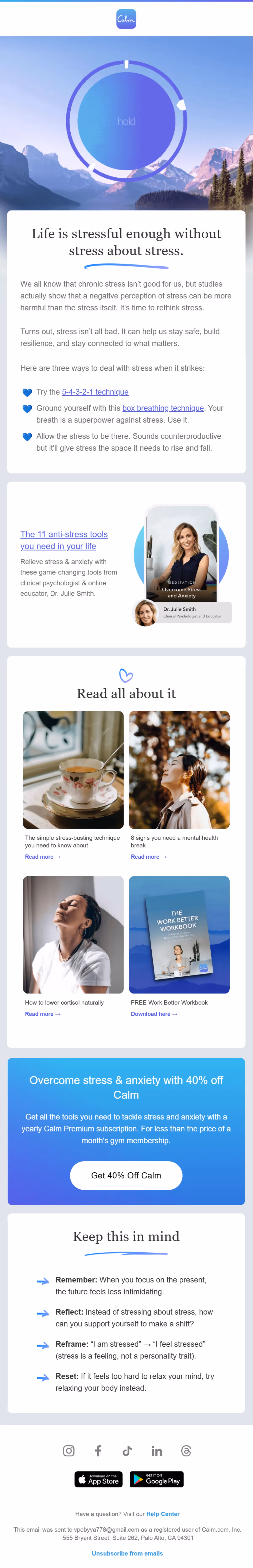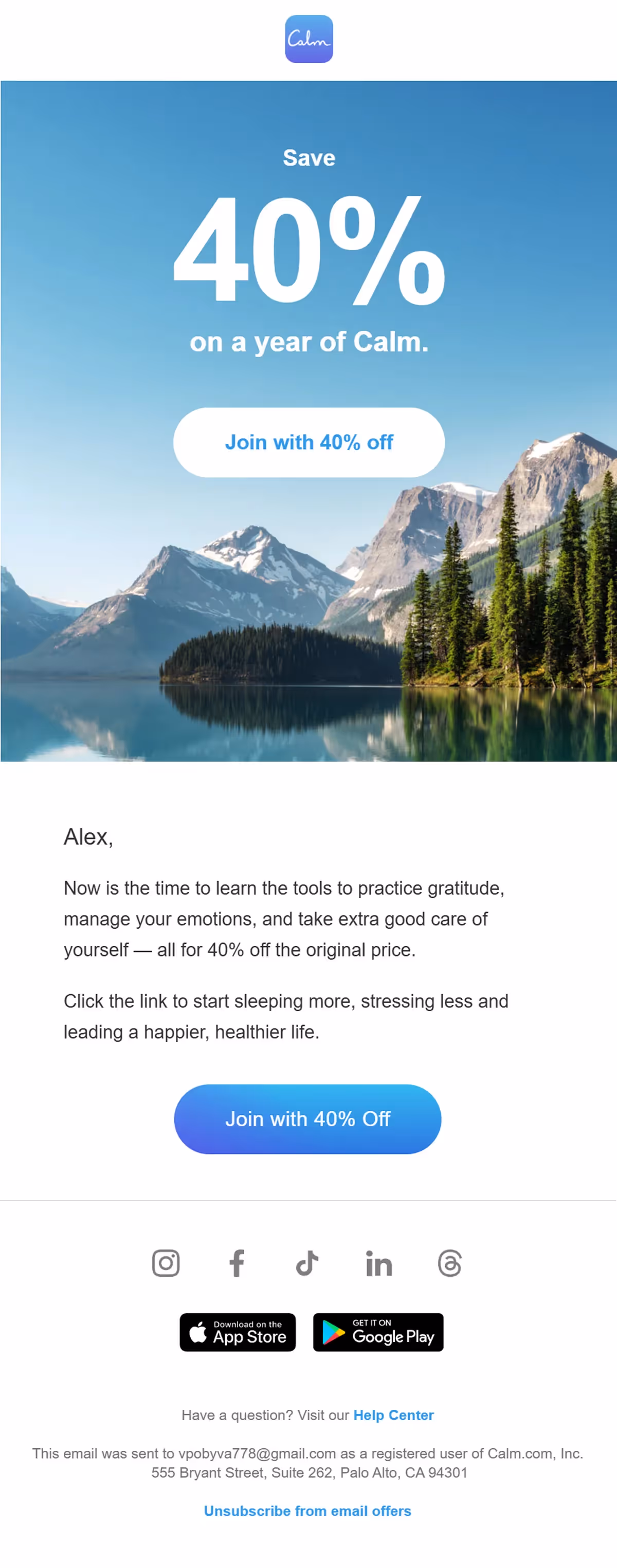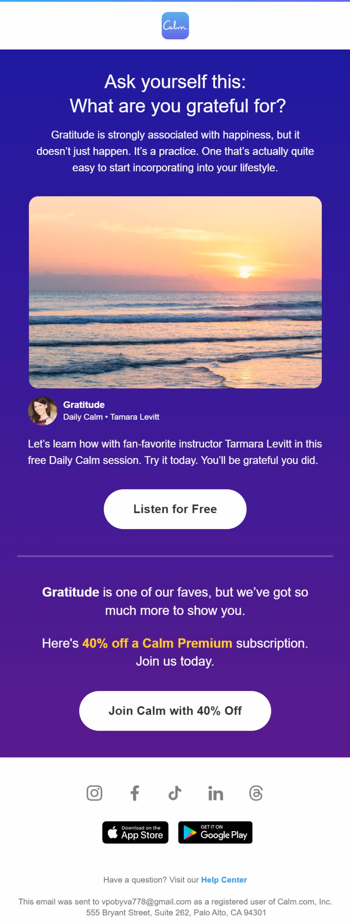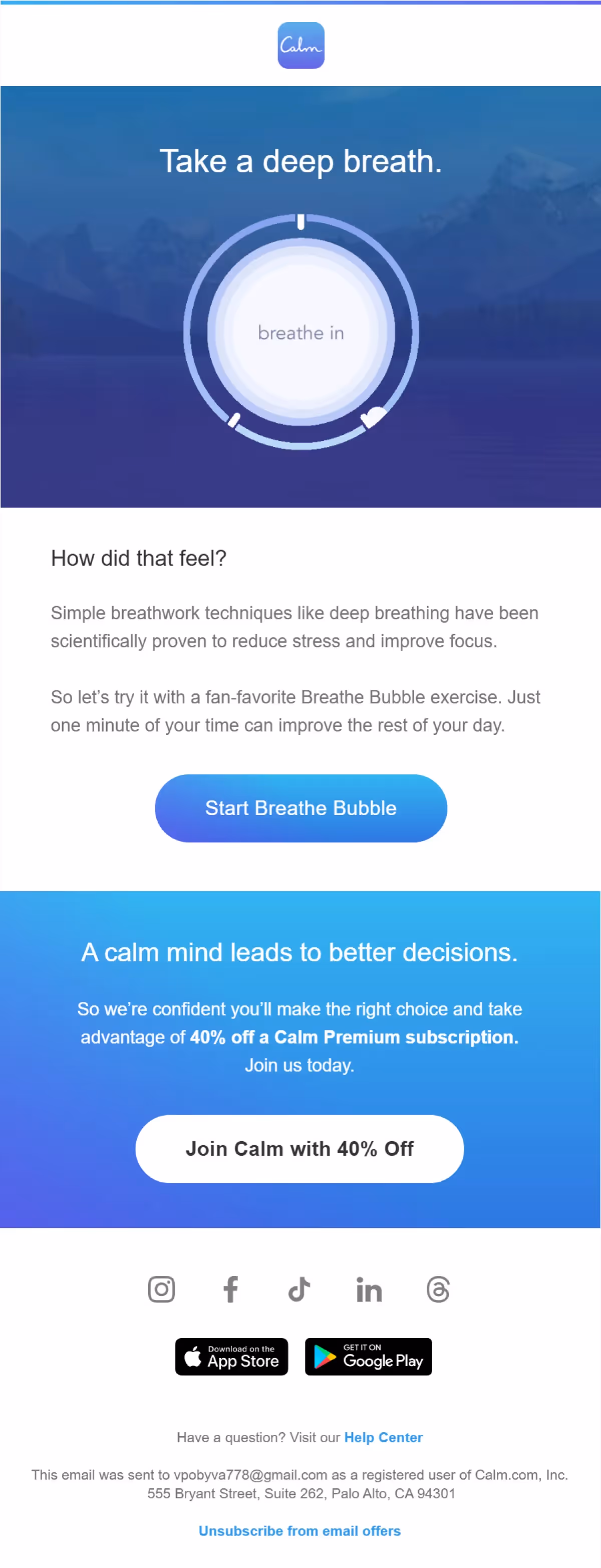 What makes a meditation app create peace through its email communication strategy? Calm's email approach demonstrates how gentle wisdom and atmospheric content can support mindfulness practice without creating pressure.