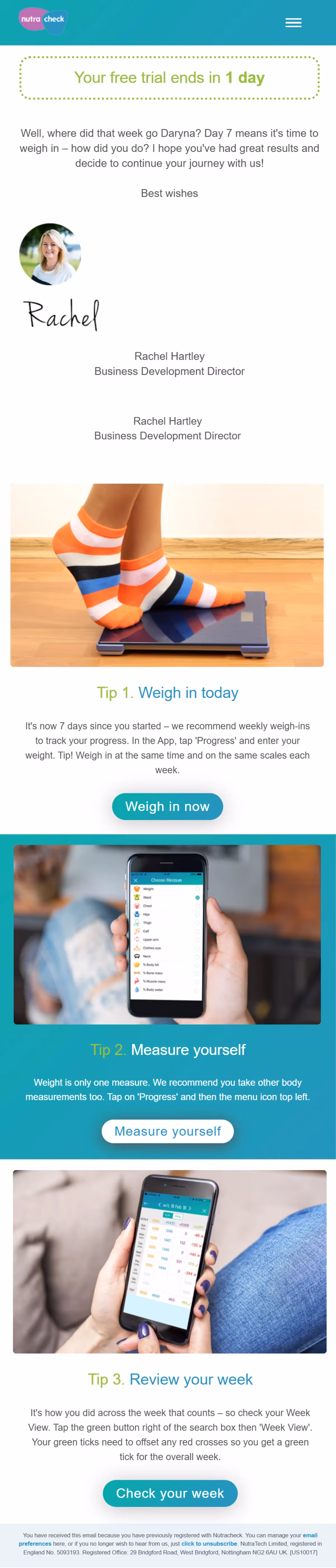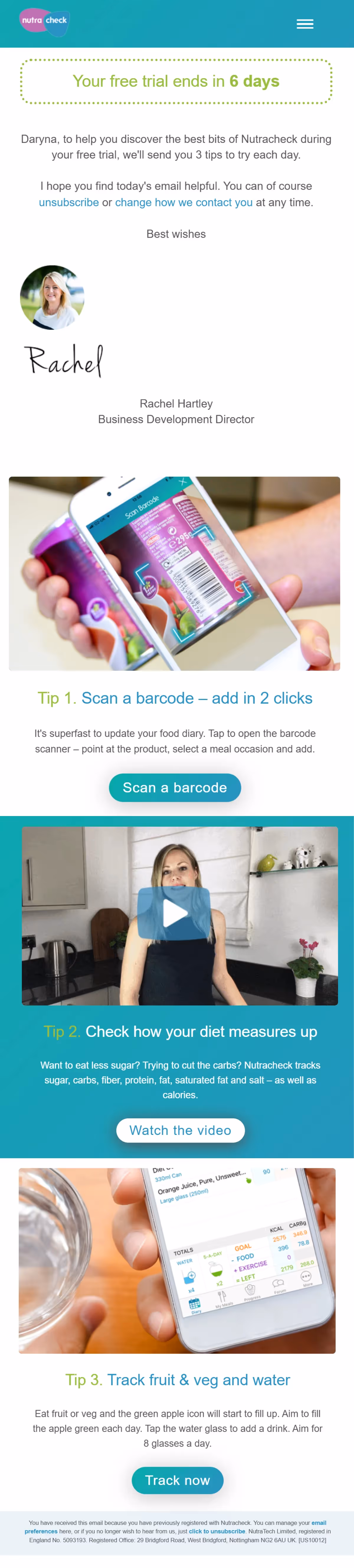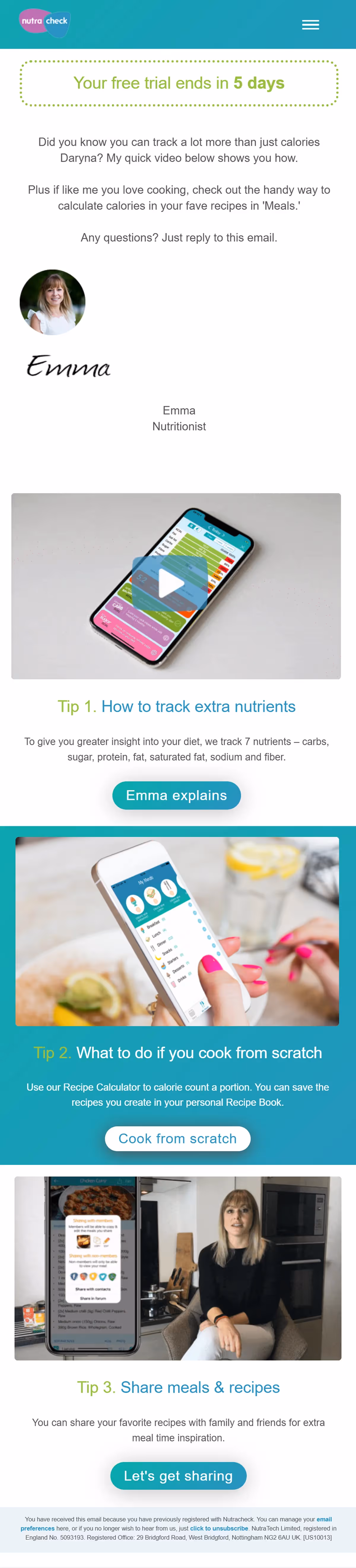 Their approach prioritizes practical tracking tips over complex nutritional theory. Weekly emails focus on logging efficiency and barcode scanning benefits, helping users maintain consistent tracking habits.
