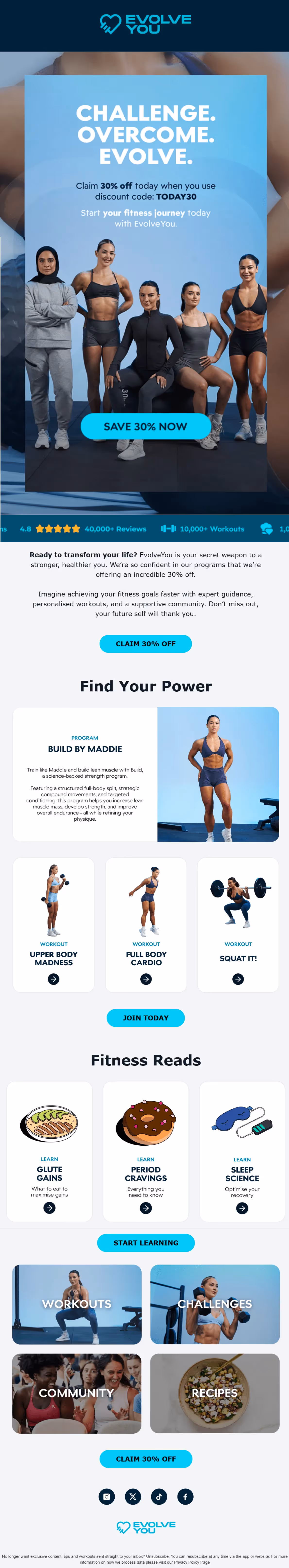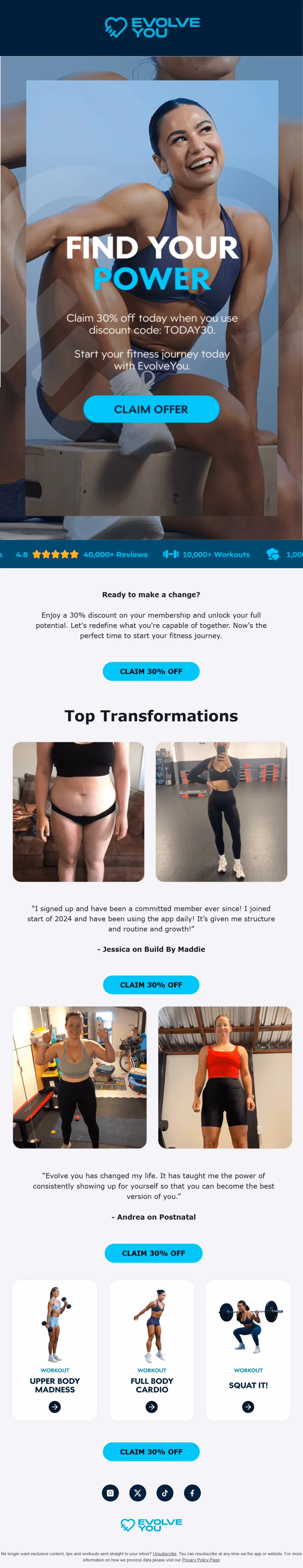 Our comprehensive gallery shows how EvolveYou creates email experiences that empower women to embrace strength training through supportive community and specialized programming.