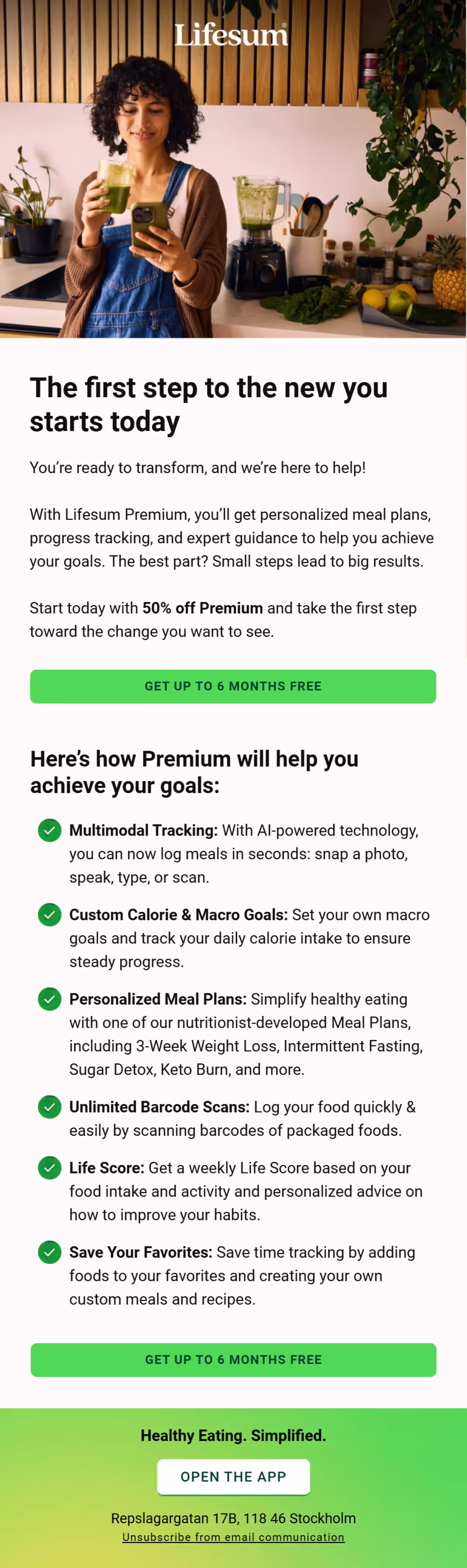 Our detailed screenshots reveal how Lifesum uses aesthetic design and positive language to make nutrition education feel inspiring through beautiful email experiences.