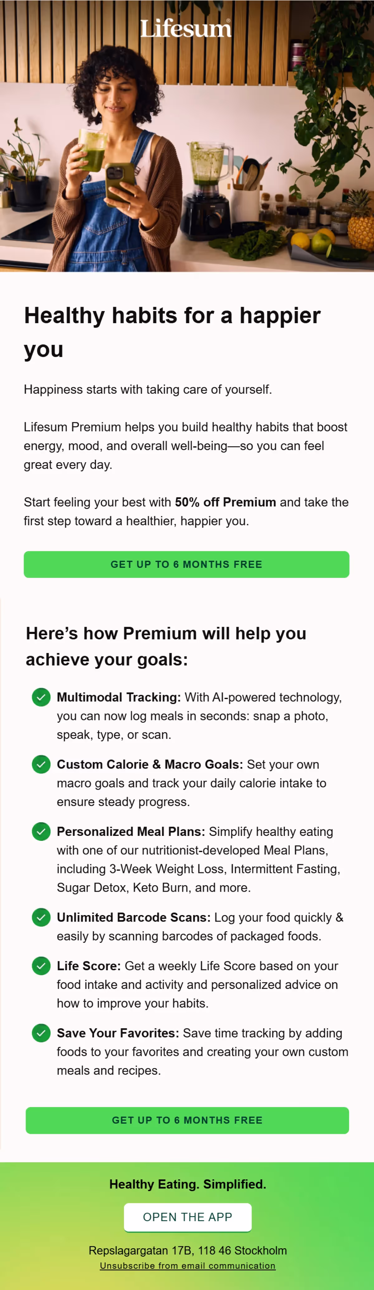 Lifesum's strength lies in lifestyle integration rather than restrictive dieting. Email content about seasonal eating and mindful nutrition creates sustainable approaches to health that feel inspiring rather than demanding.