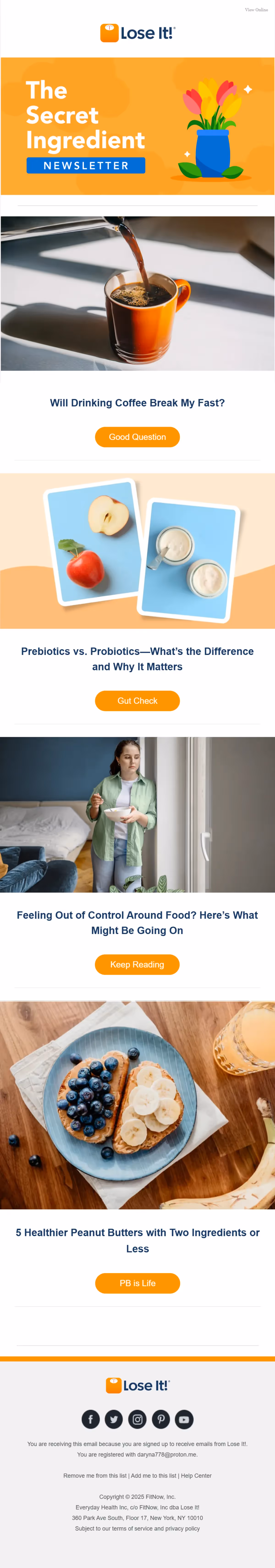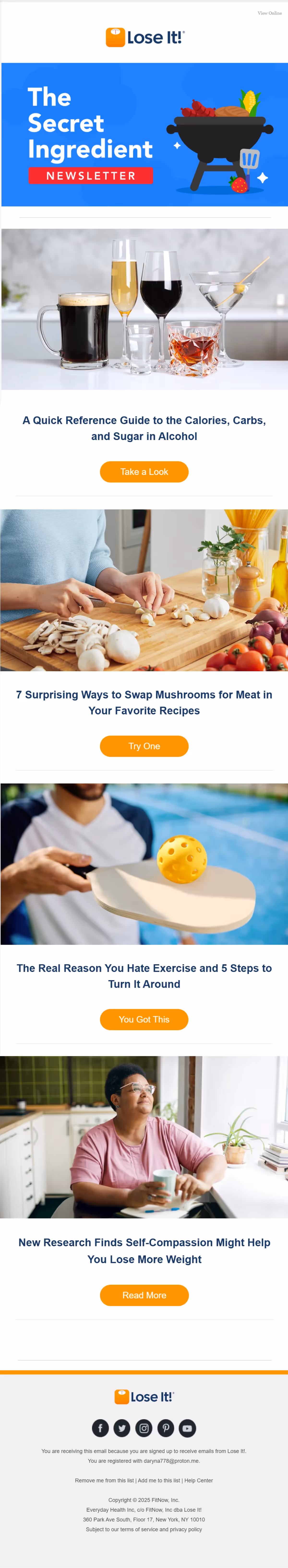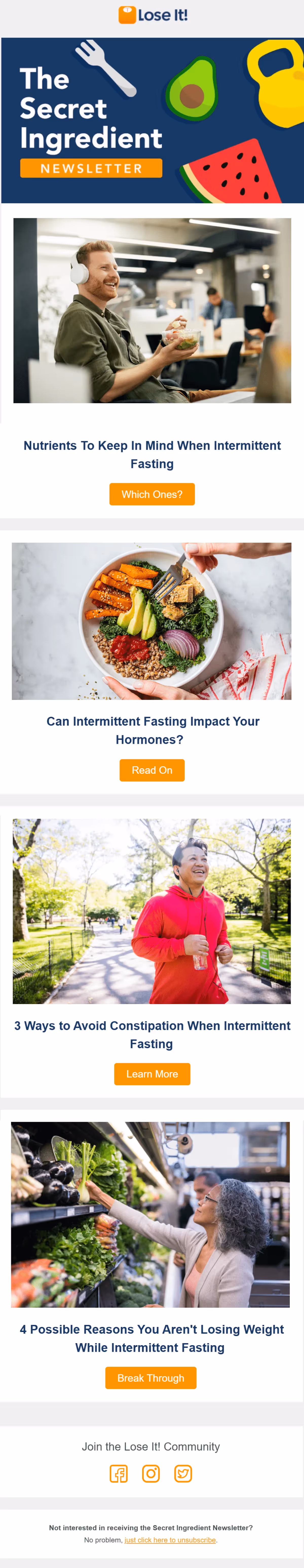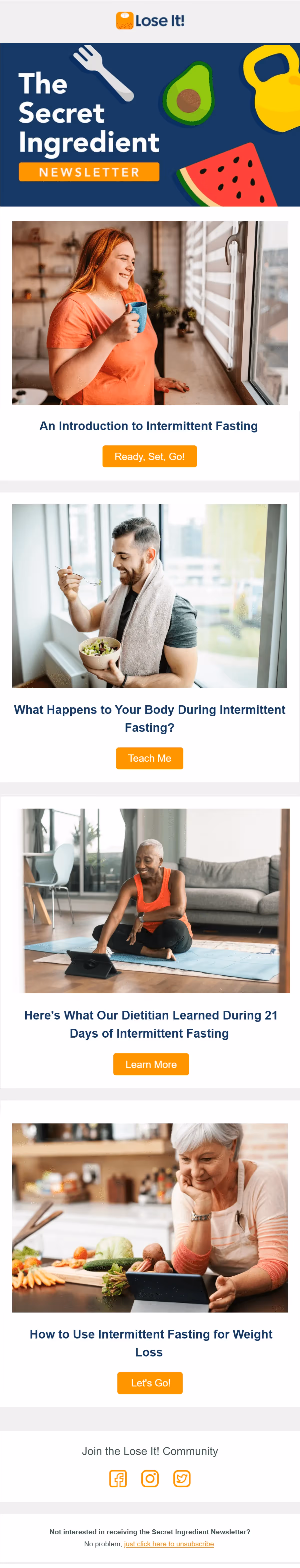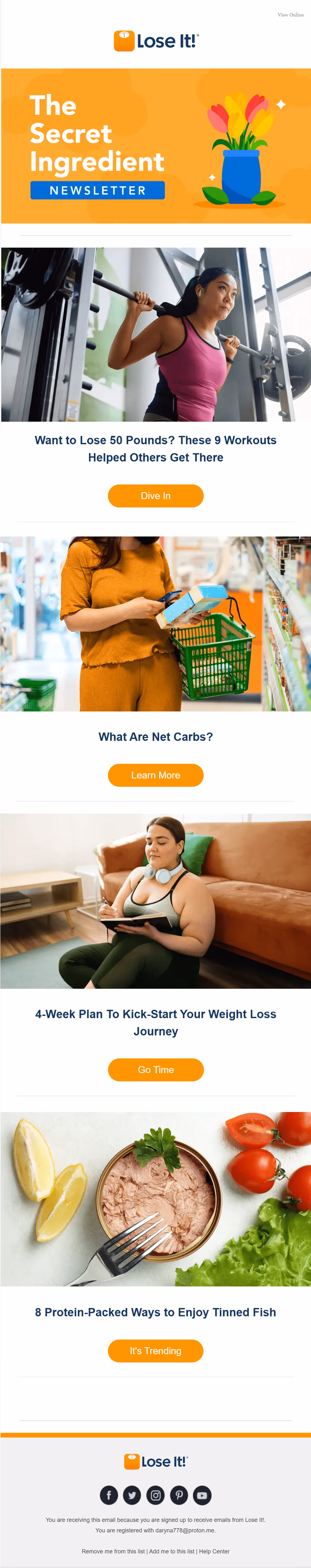 Our comprehensive gallery shows how Lose It! creates email experiences that support realistic weight loss through community motivation and practical education.