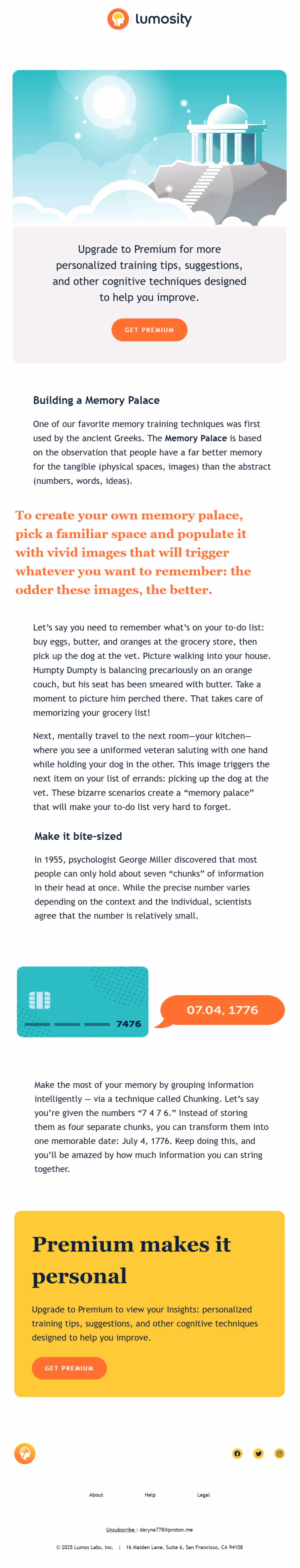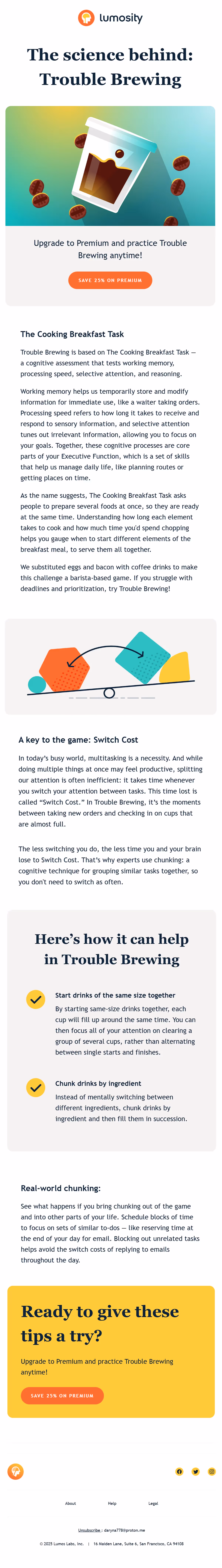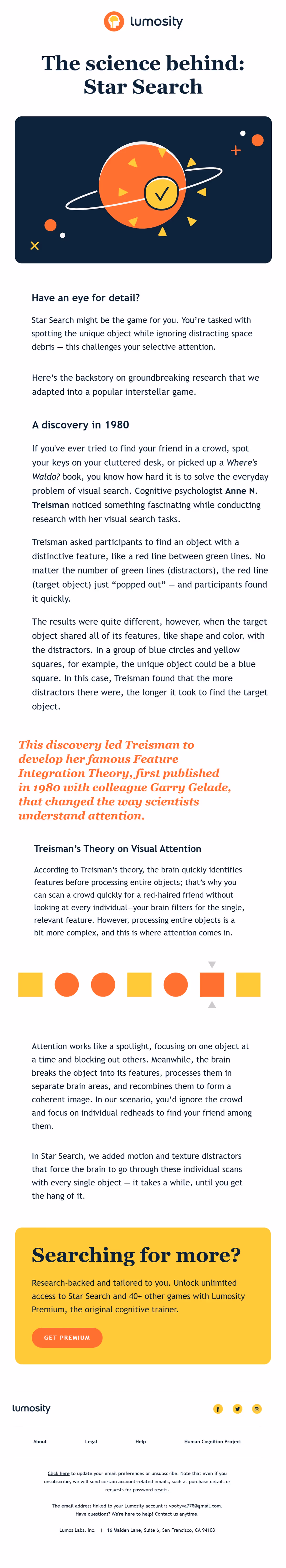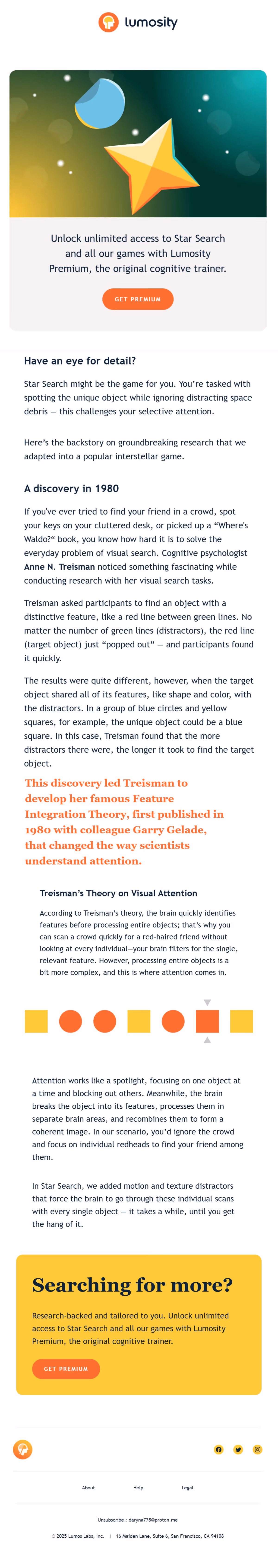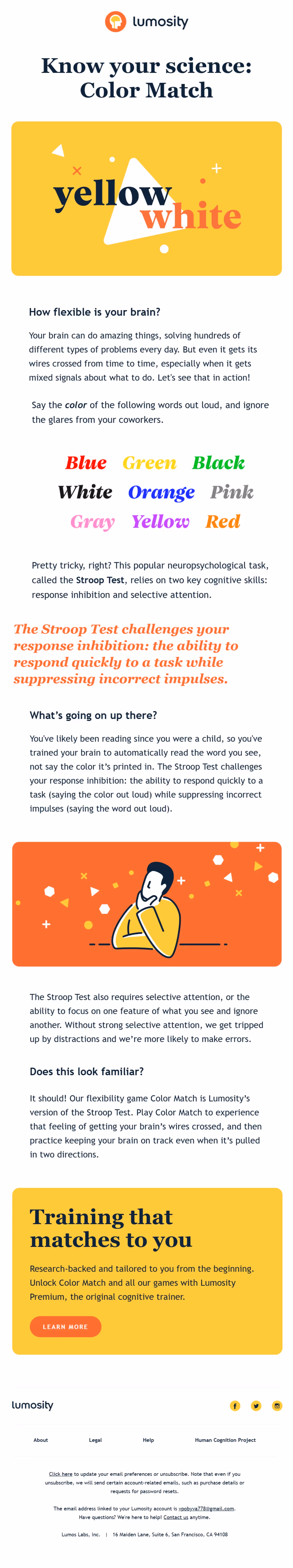 Lumosity's strength lies in scientific foundation emphasis through email content that builds credibility. Weekly insights about research backing and cognitive science principles create trust in brain training effectiveness through academic rigor.