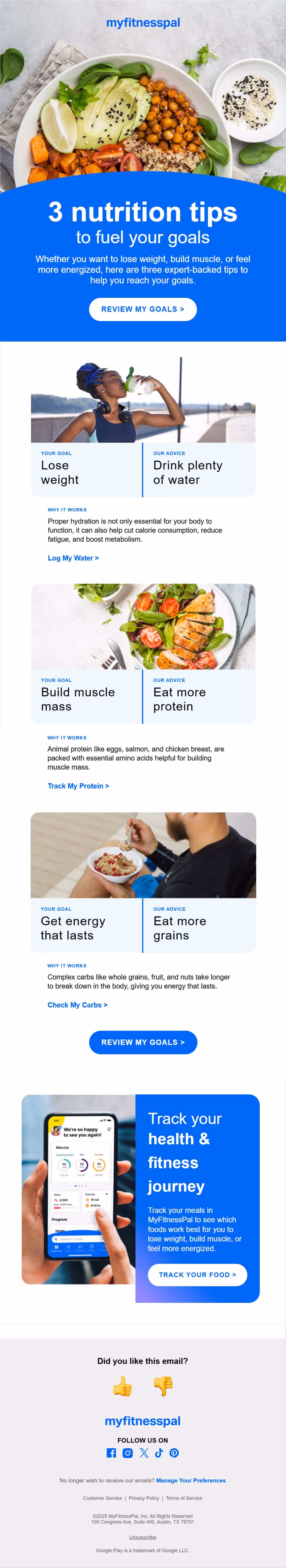 What sets MyFitnessPal apart is their data-driven personalization. Progress summaries and goal adjustments arrive based on individual tracking patterns, making each email feel personally relevant.