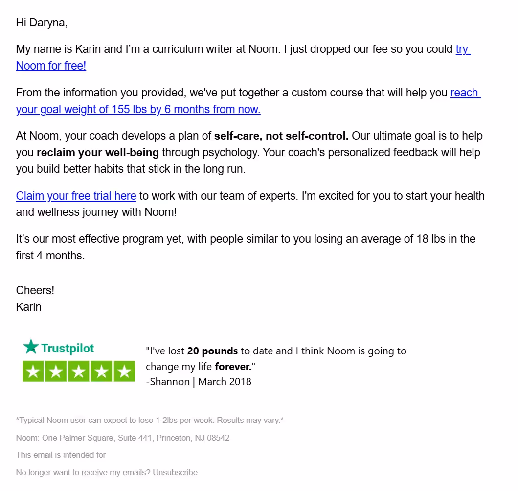 Noom excels at psychological insight delivery through emails that feel like educational newsletters rather than marketing messages. Weekly lessons about emotional eating and motivation help users understand weight loss psychology.