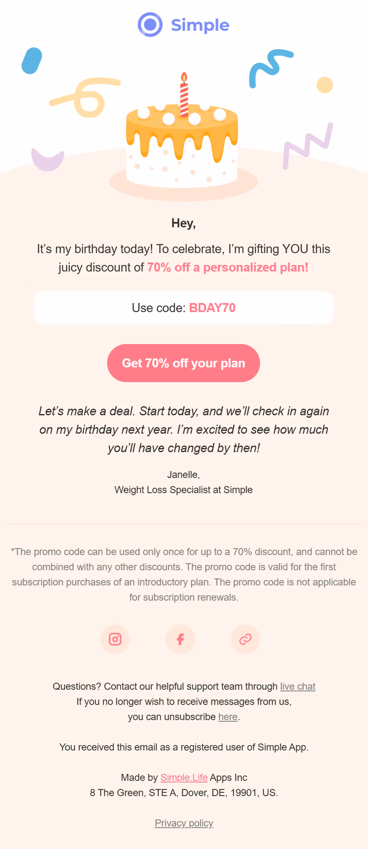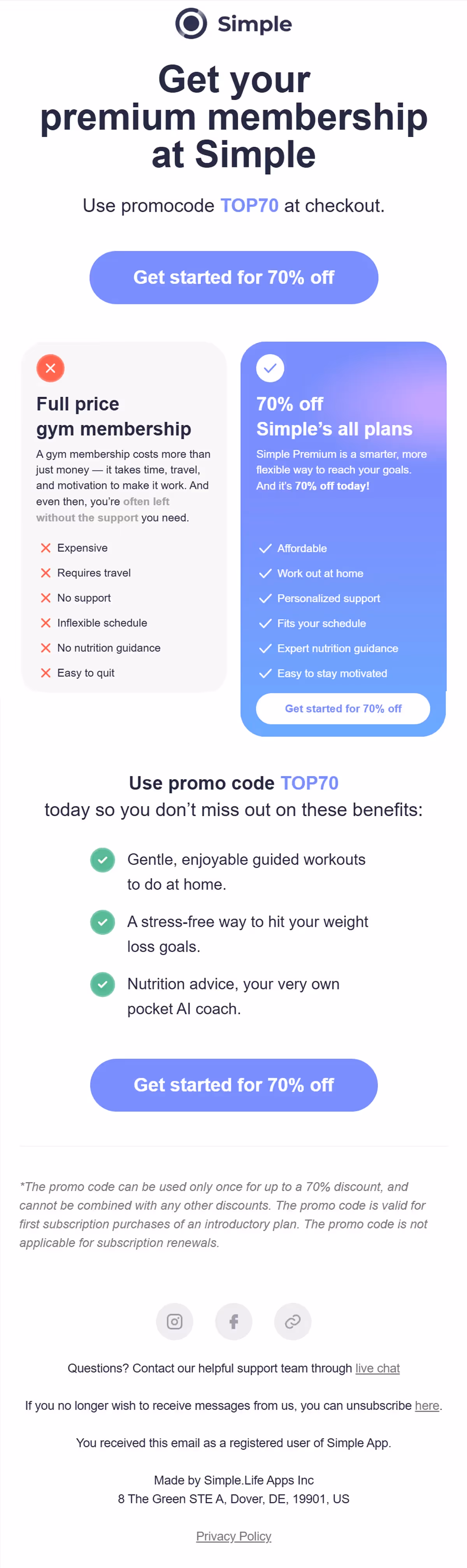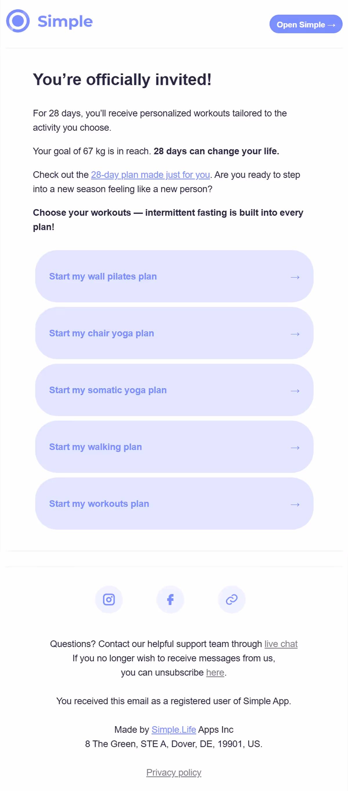 The email flow for Simple: Weight Loss Coach begins immediately after a user registers with an email. The first message delivers a six-digit verification code—or a “Confirm Email” button—to verify the user’s identity and enable access to the app’s tailored experience. Once authenticated, the sequence consists of structured emails that validate user information, introduce Avo, and detail how the coaching system personalizes daily plans, meal tracking, hydration, fasting features, and educational content. Each email is clear and purposeful: establishing trust, explaining key tools like Avo Vision and Nutrition Scores, and guiding users to engage with core functionality. The flow strikes a balanced tone—professional, evidence-informed, and supportive—designed for clarity rather than hype. Explore this email flow to understand how Simple transitions new users from sign-up to sustained engagement. Then, examine their related onboarding screens and push notifications for a comprehensive view of lifecycle communication.