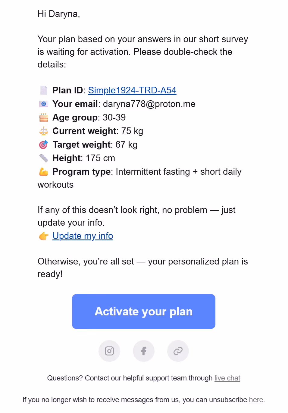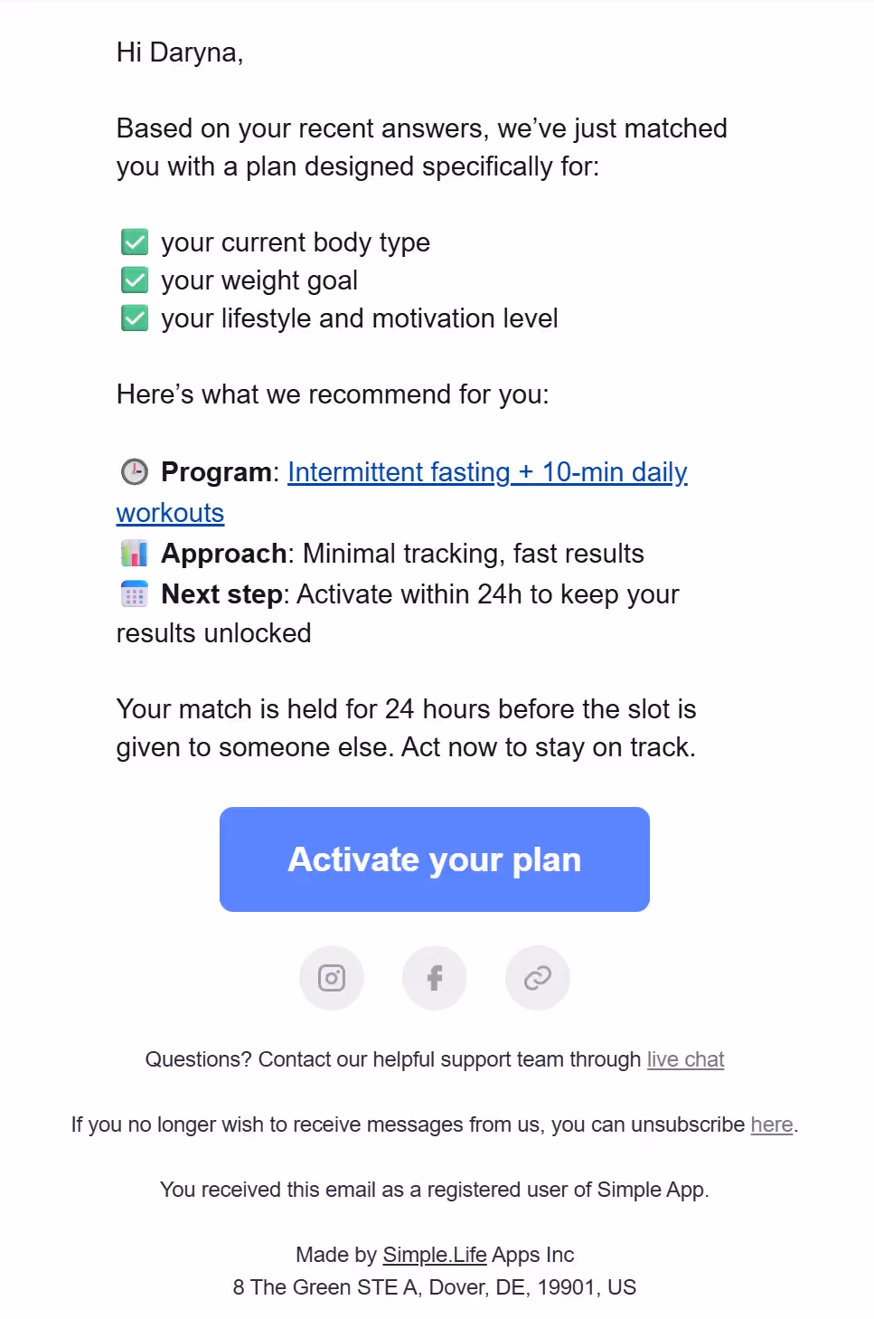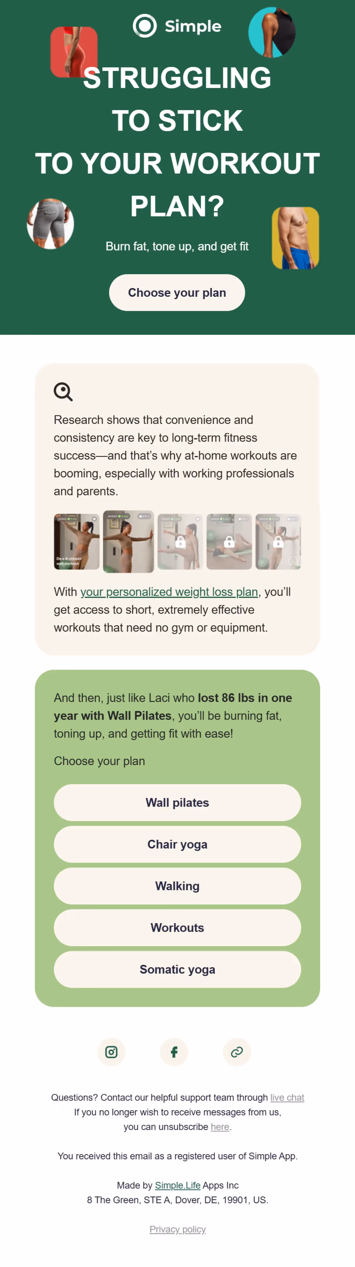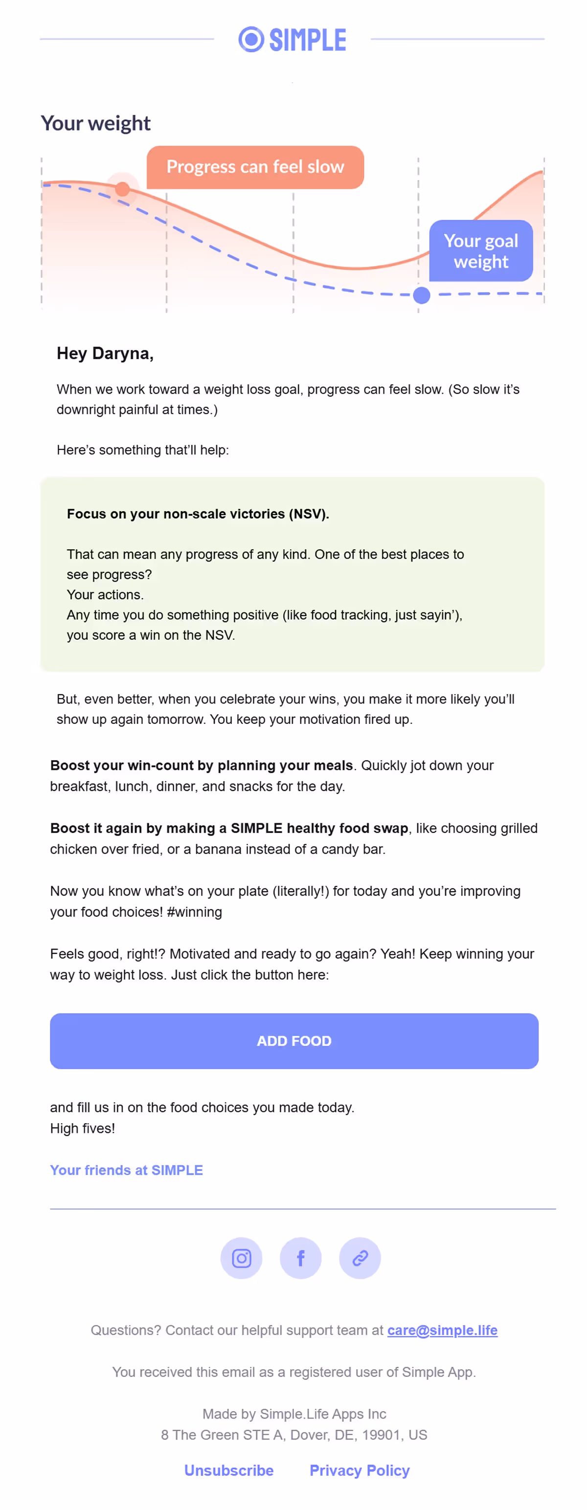 The email flow for Simple: Weight Loss Coach begins immediately after a user registers with an email. The first message delivers a six-digit verification code—or a “Confirm Email” button—to verify the user’s identity and enable access to the app’s tailored experience. Once authenticated, the sequence consists of structured emails that validate user information, introduce Avo, and detail how the coaching system personalizes daily plans, meal tracking, hydration, fasting features, and educational content. Each email is clear and purposeful: establishing trust, explaining key tools like Avo Vision and Nutrition Scores, and guiding users to engage with core functionality. The flow strikes a balanced tone—professional, evidence-informed, and supportive—designed for clarity rather than hype. Explore this email flow to understand how Simple transitions new users from sign-up to sustained engagement. Then, examine their related onboarding screens and push notifications for a comprehensive view of lifecycle communication.