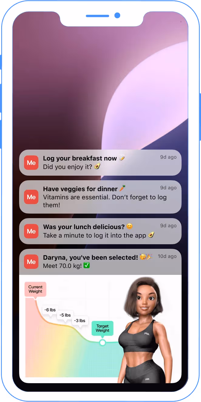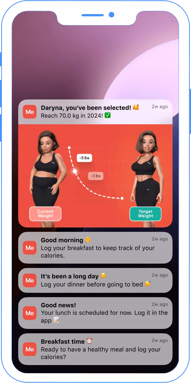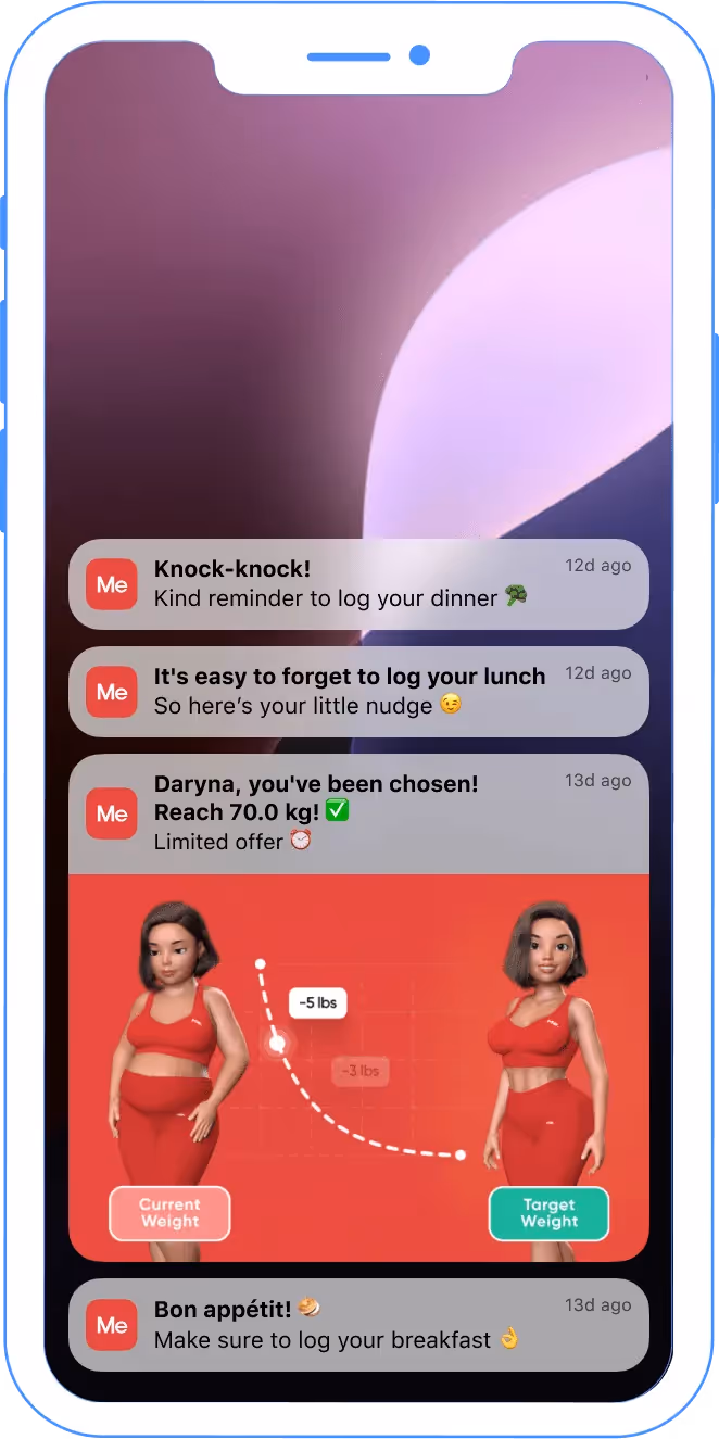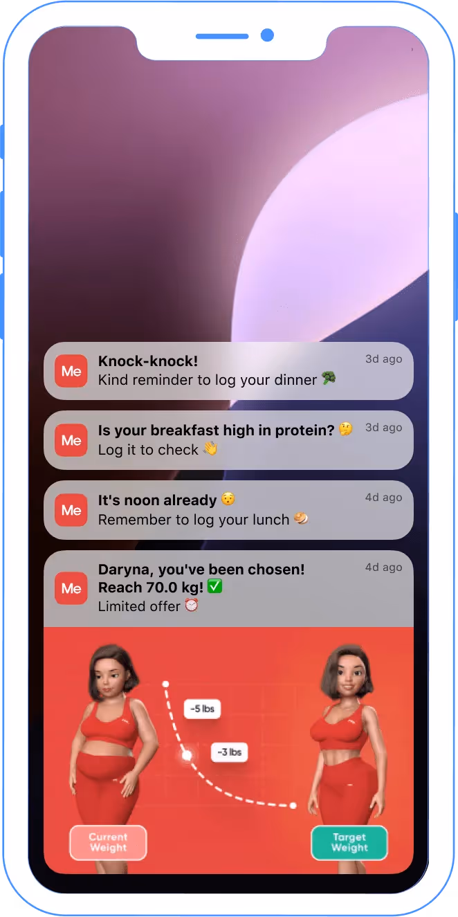 Their human coaching integration provides personalized support through push notifications. Professional guidance and accountability check-ins arrive at strategic moments when users need additional motivation.