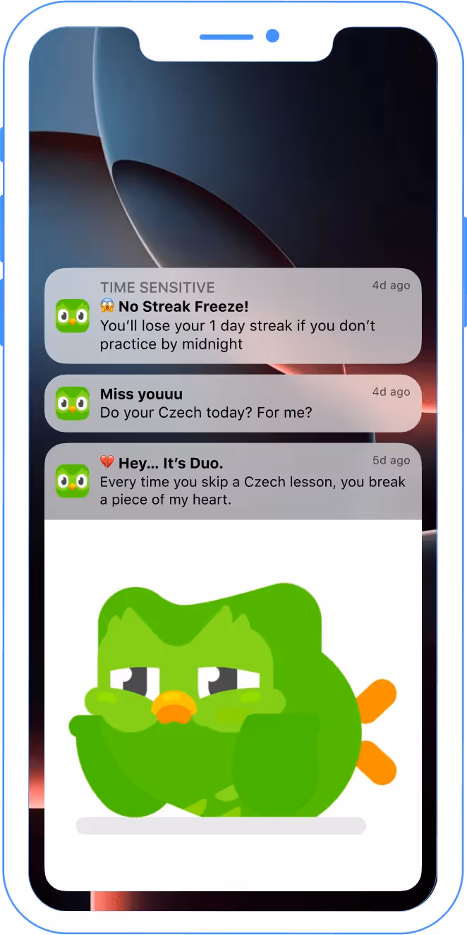 How does gamification transform language learning motivation through strategic communication? Duolingo's push notification strategy showcases how achievement systems and playful competition can create addictive educational experiences through engaging messaging.