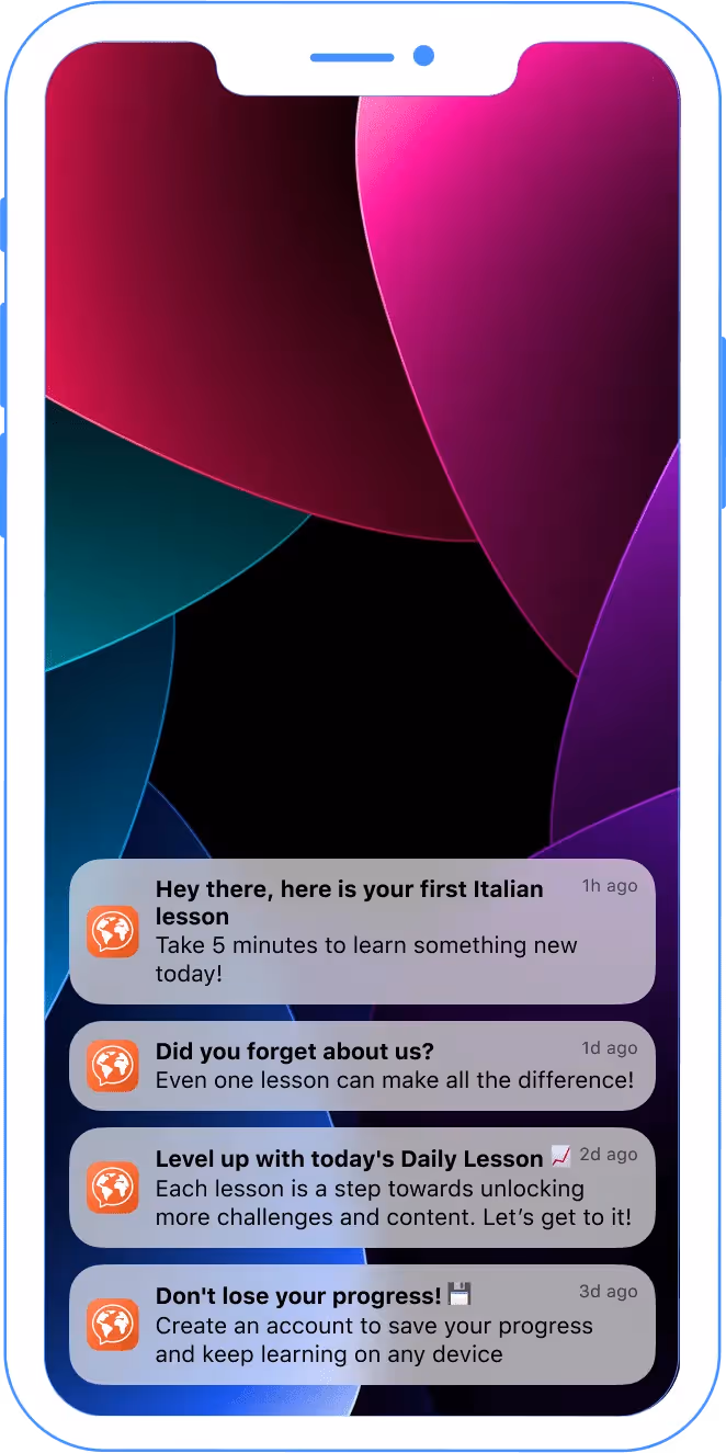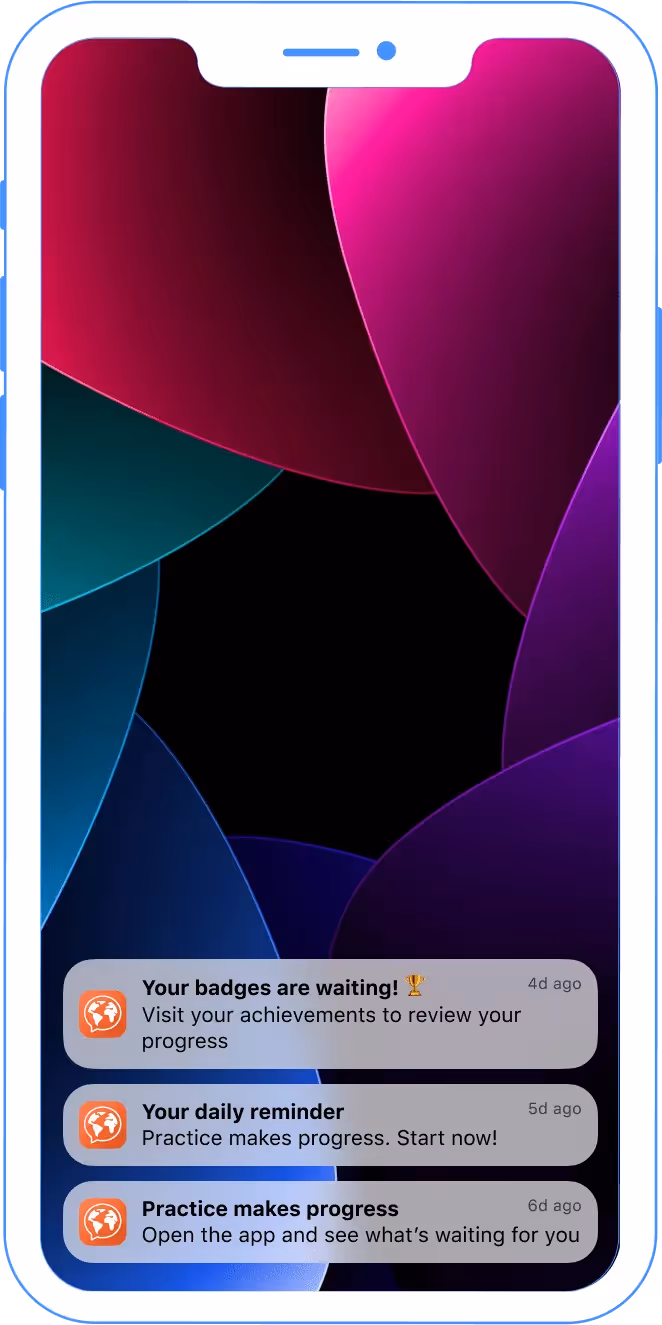 Their multi-language support gets highlighted through notifications that appeal to polyglot ambitions. Messages about language switching and comparative learning create value for users interested in multiple languages.