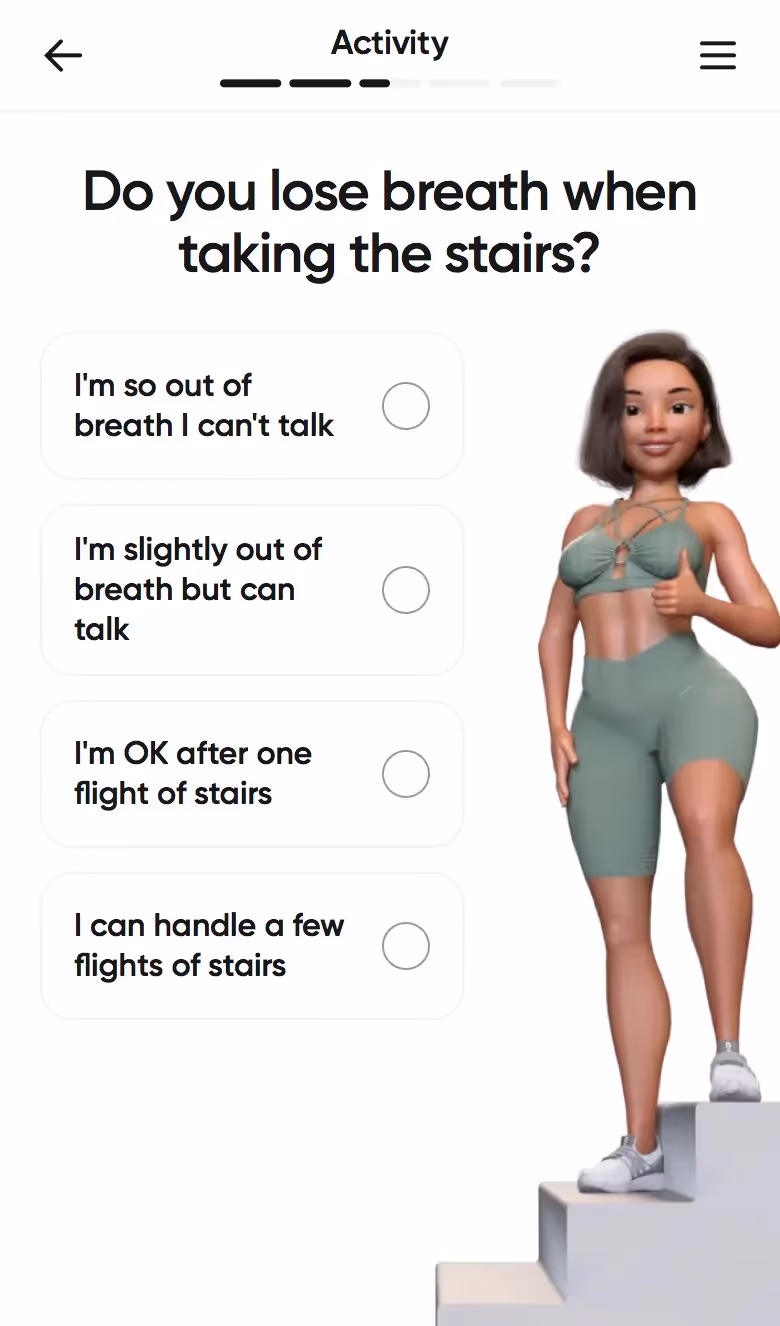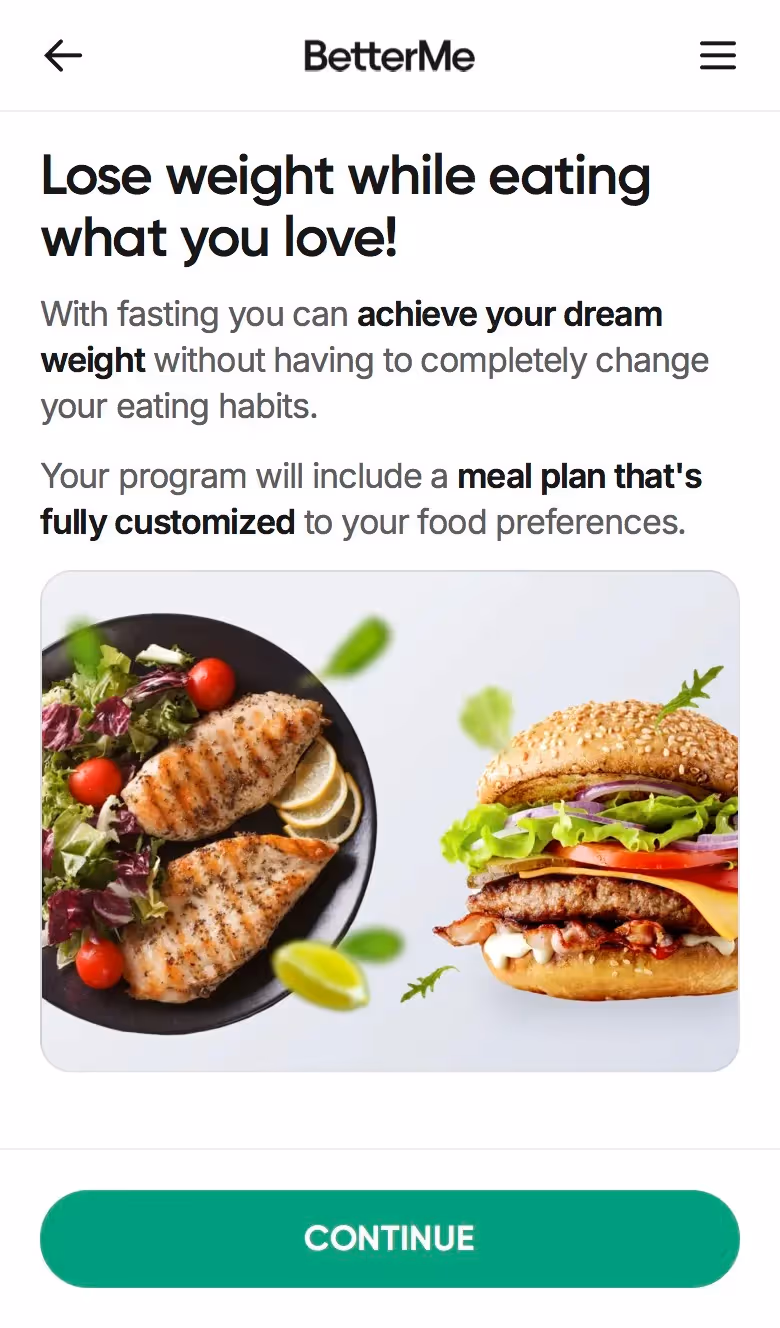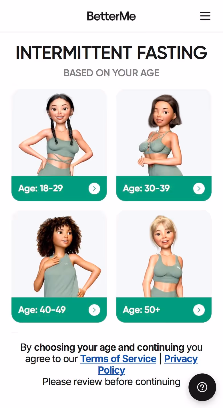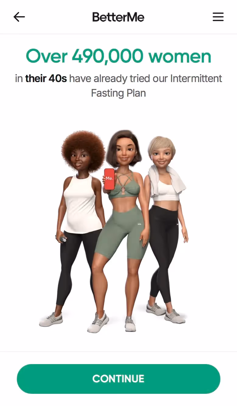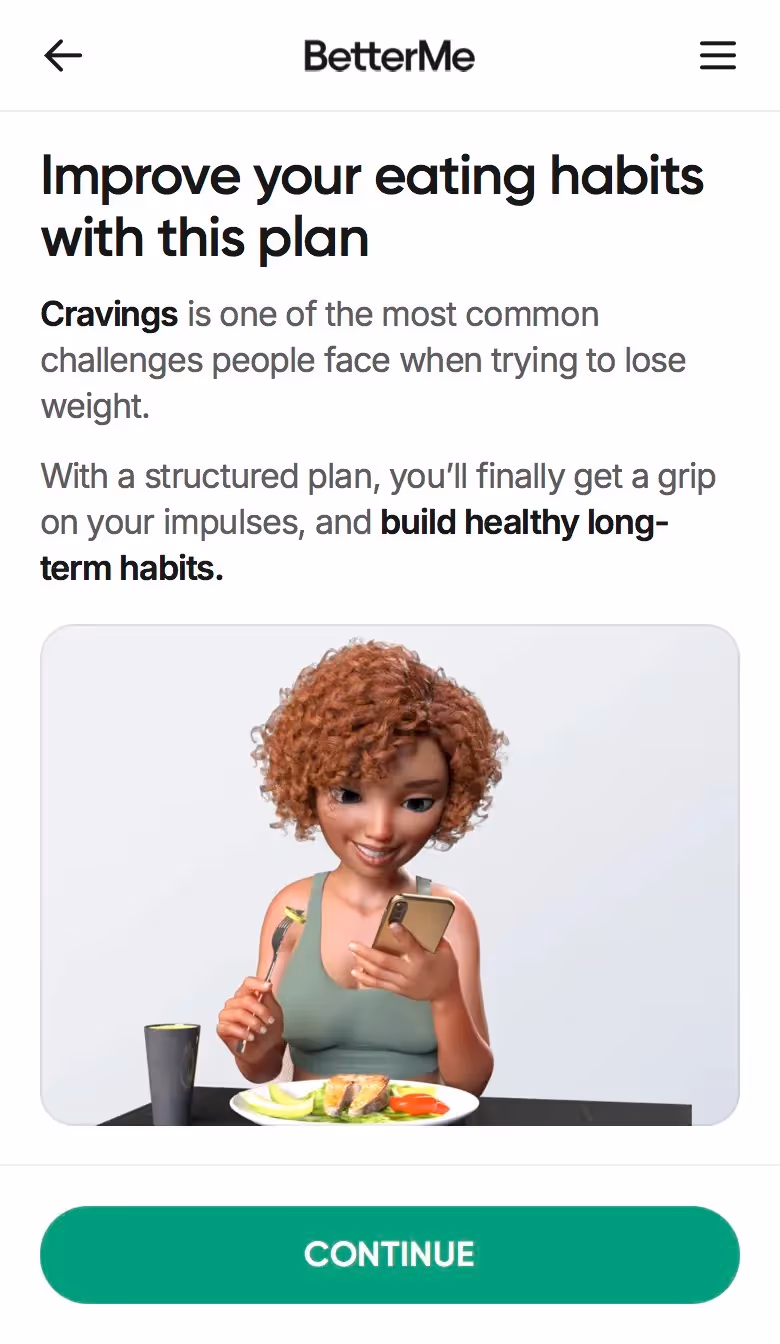 BetterMe's web onboarding addresses total lifestyle transformation. Their flow explores fitness goals alongside nutrition, mental health, and daily habits, setting expectations for comprehensive coaching.