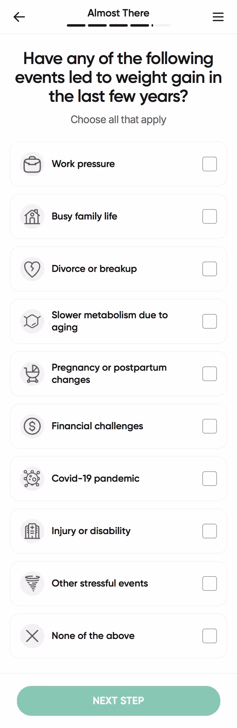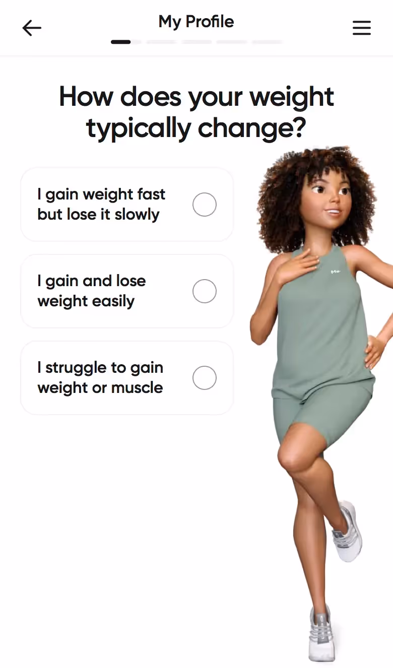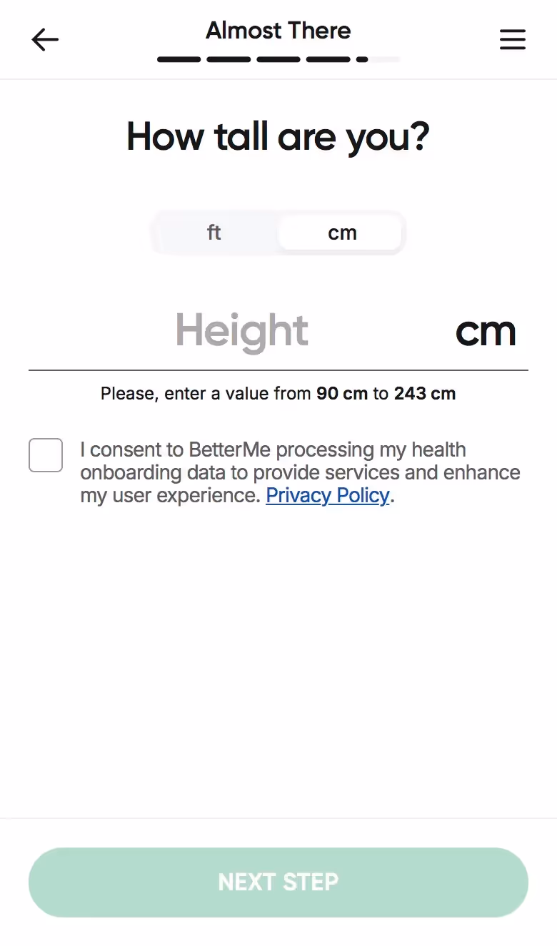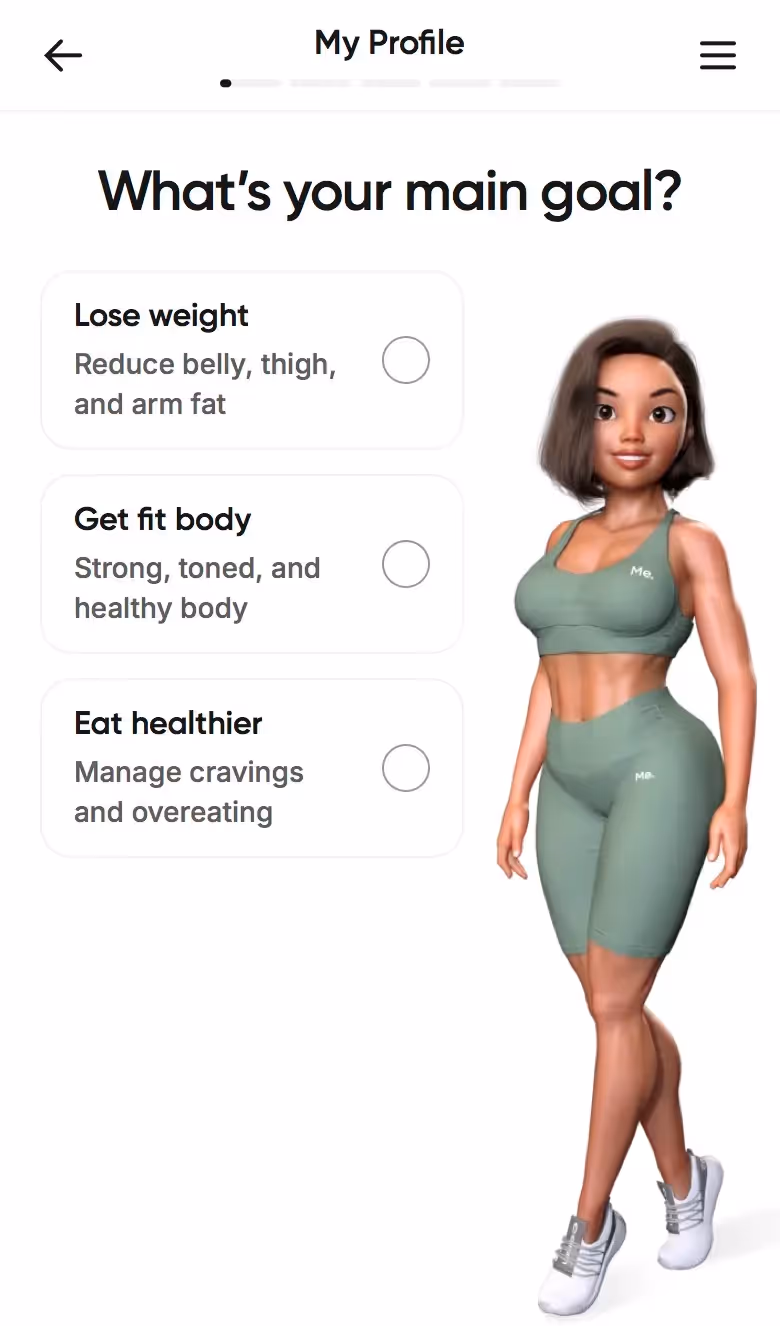 BetterMe's web onboarding addresses total lifestyle transformation. Their flow explores fitness goals alongside nutrition, mental health, and daily habits, setting expectations for comprehensive coaching.