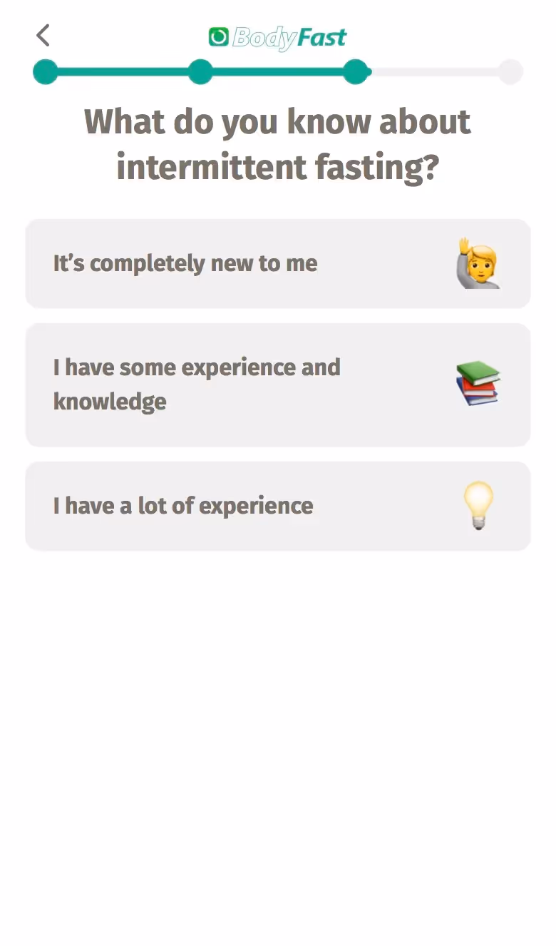 BodyFast's web onboarding educates newcomers about intermittent fasting while accommodating experienced practitioners. Their flow begins with fasting method selection, offering clear explanations for each protocol.