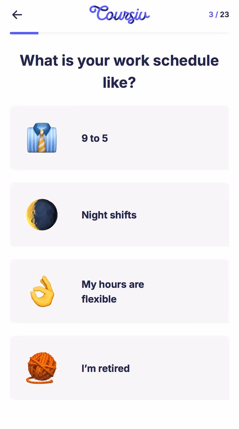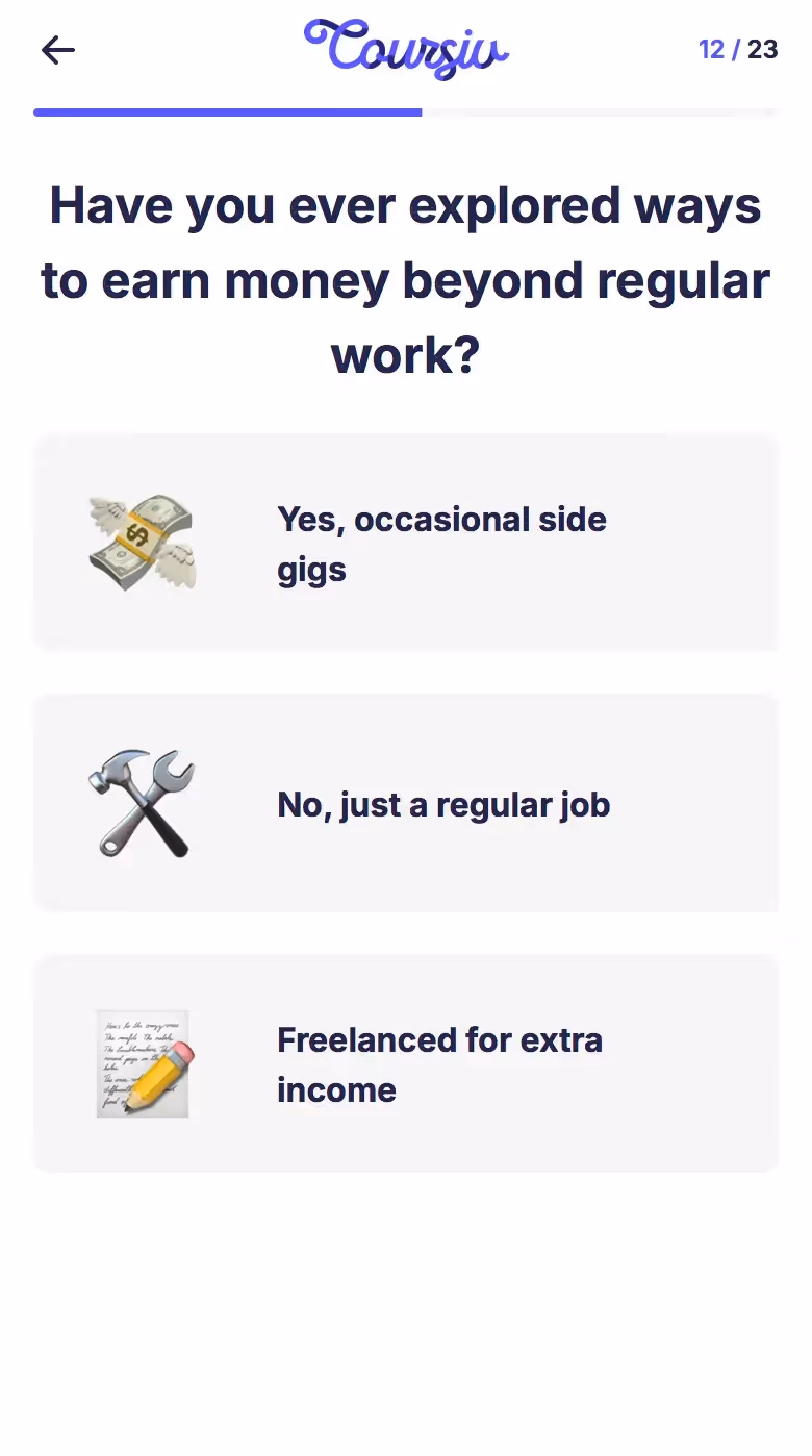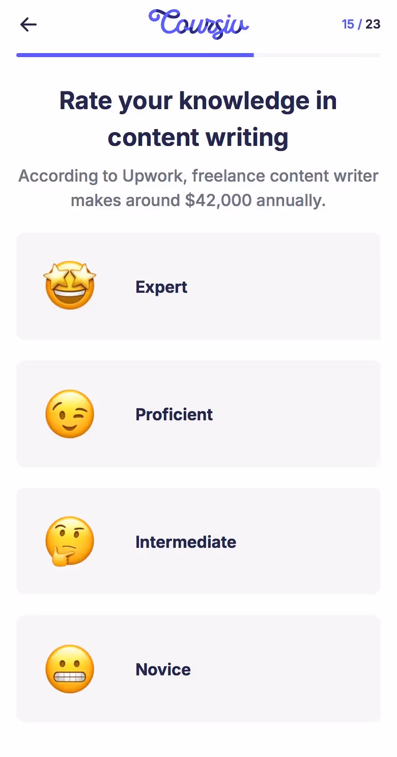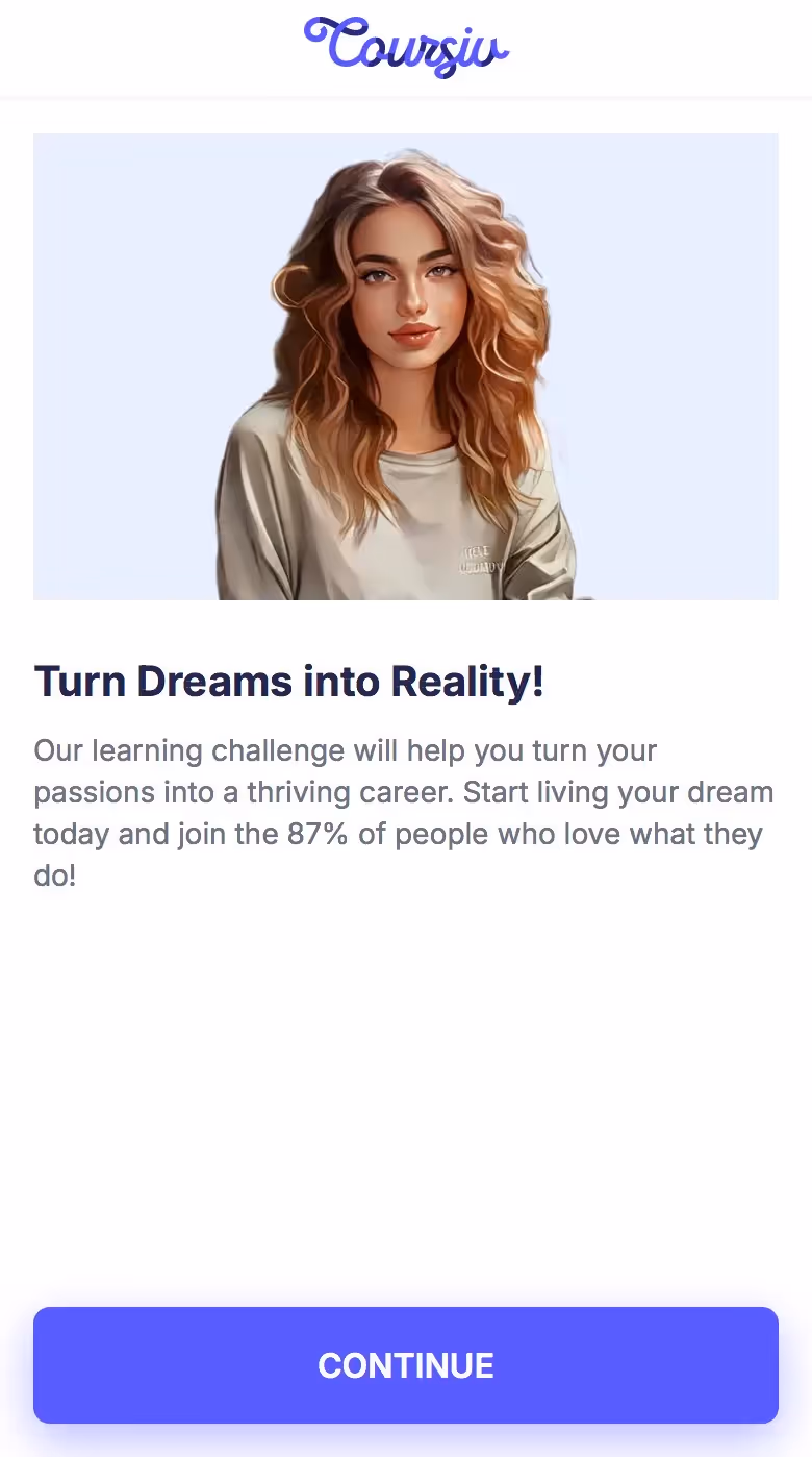 Study how Coursiv establishes clarity about value early, aligning content with user goals. Also compare to its web push, email, and app onboarding flows to see how they maintain momentum and user commitment. Insightful for developers or designers working in learning, micro-courses, or education technology.