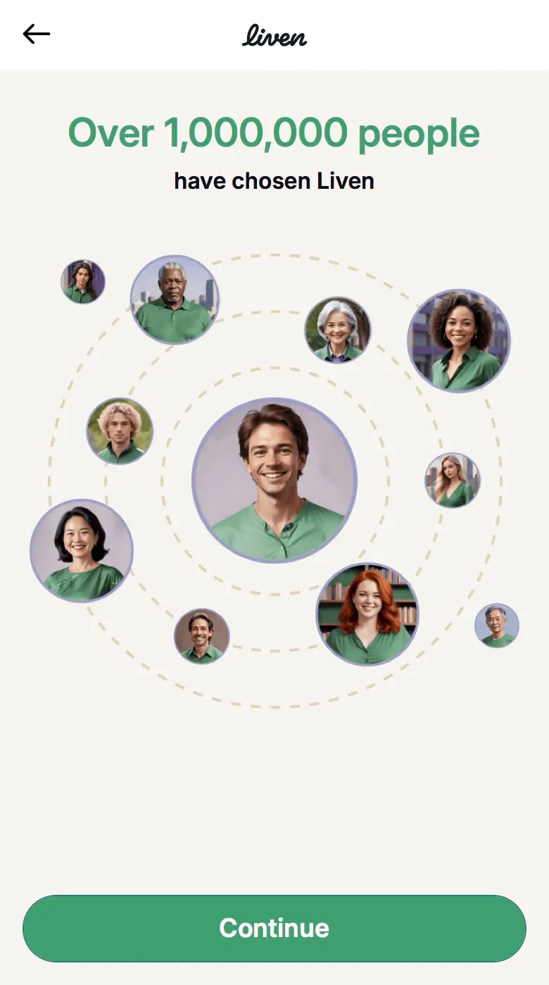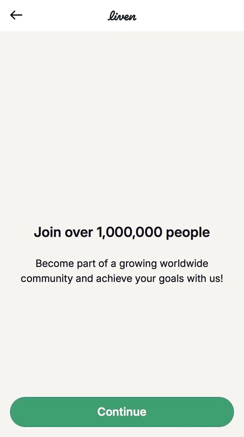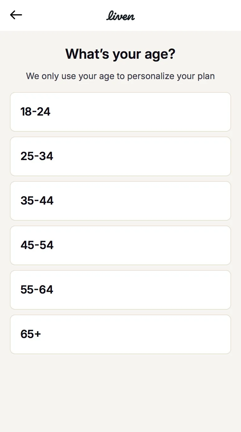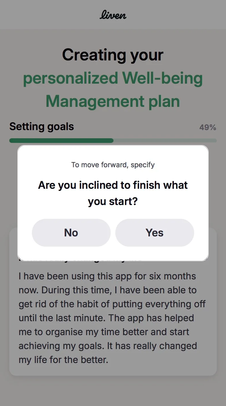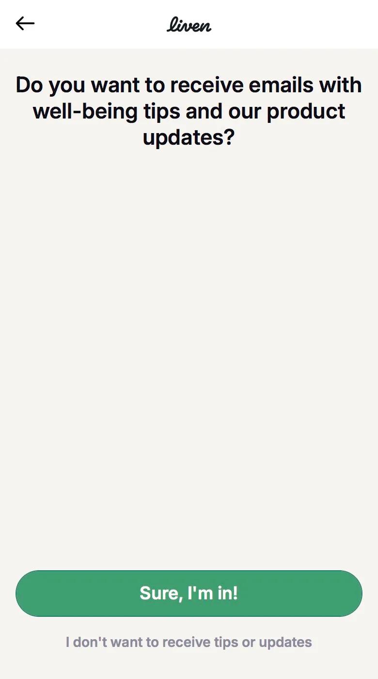 Examining these screens reveals how Liven balances gathering personal insight with demonstrating value from the start. Also view their other flows — push notifications, email, and app onboarding — to observe how consistent messaging supports user trust and engagement. Useful for apps focused on mental health or wellbeing.