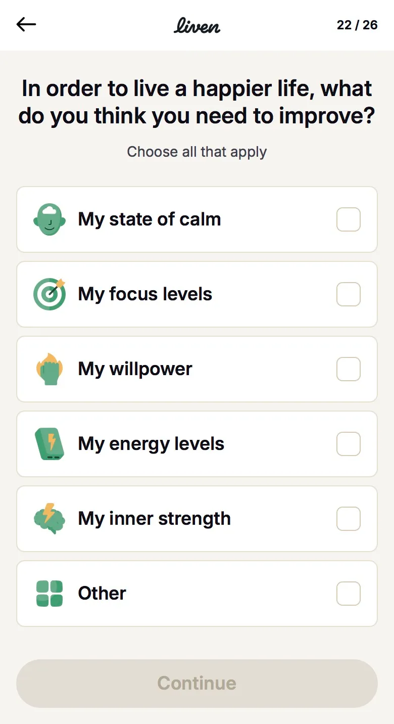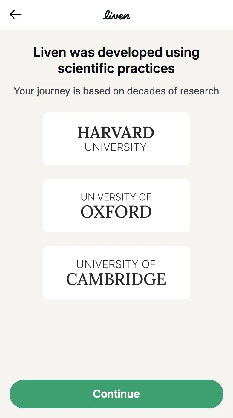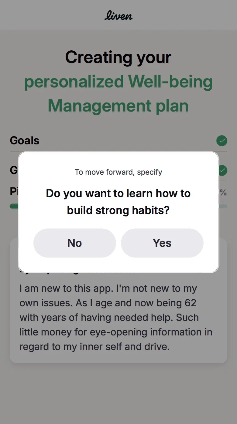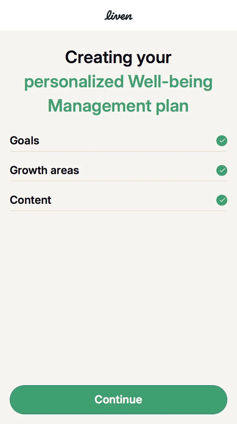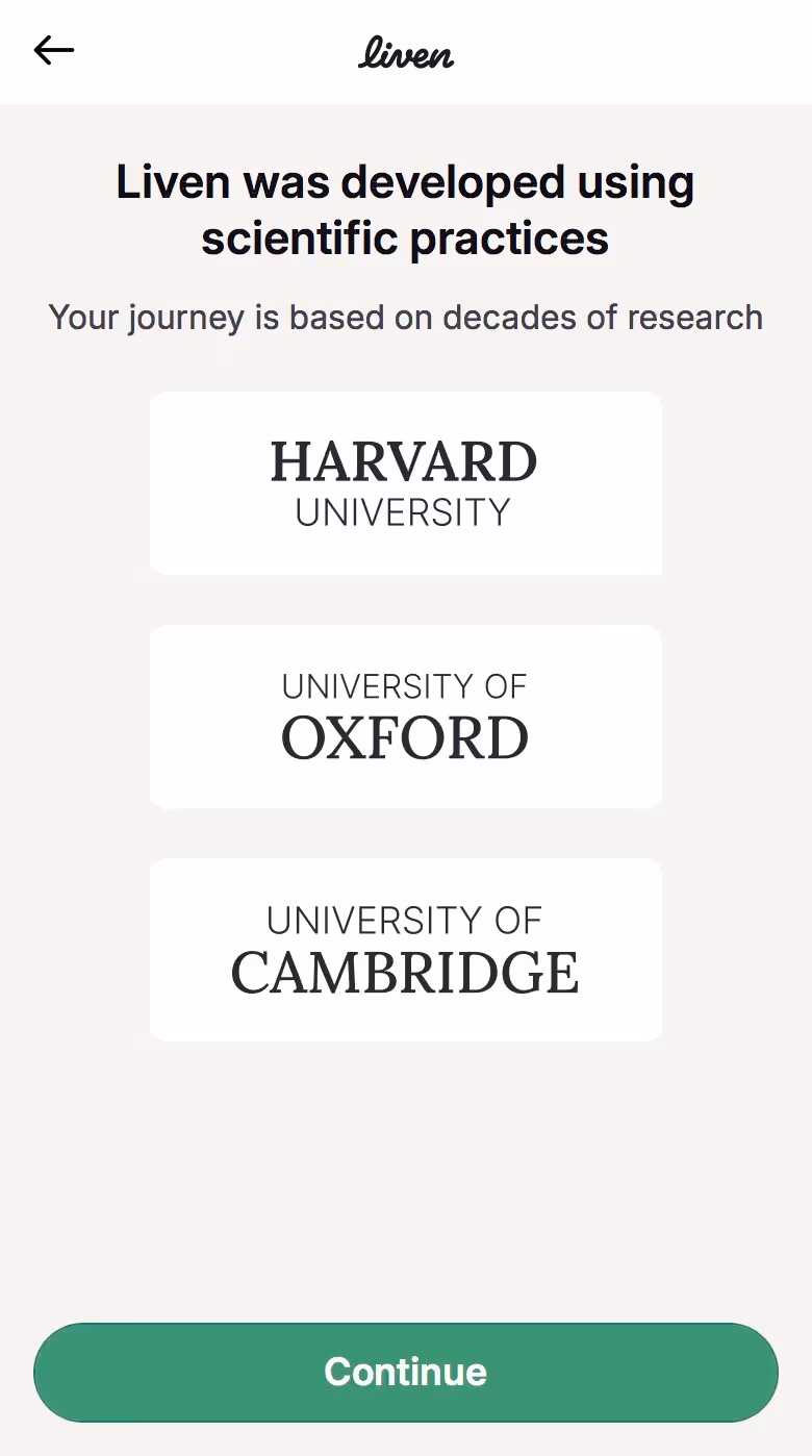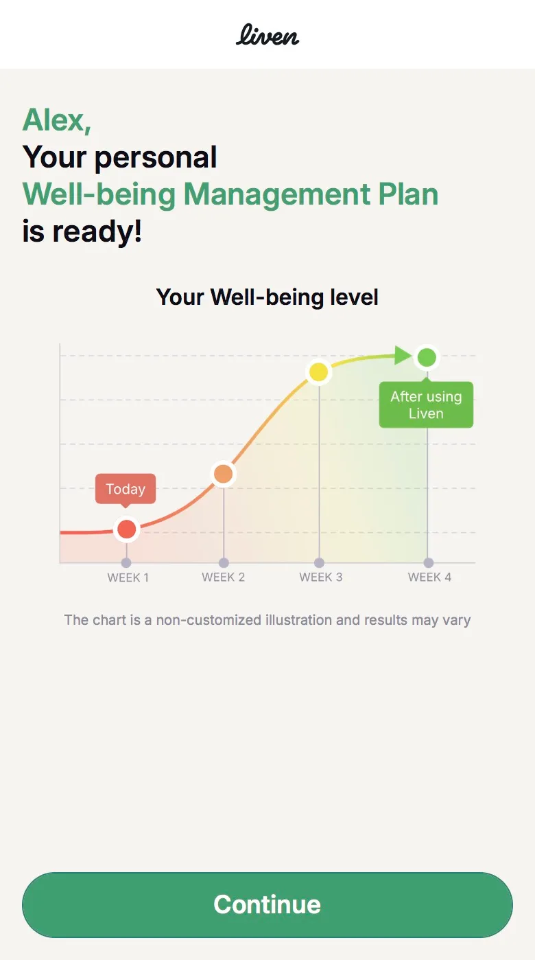 Examining these screens reveals how Liven balances gathering personal insight with demonstrating value from the start. Also view their other flows — push notifications, email, and app onboarding — to observe how consistent messaging supports user trust and engagement. Useful for apps focused on mental health or wellbeing.