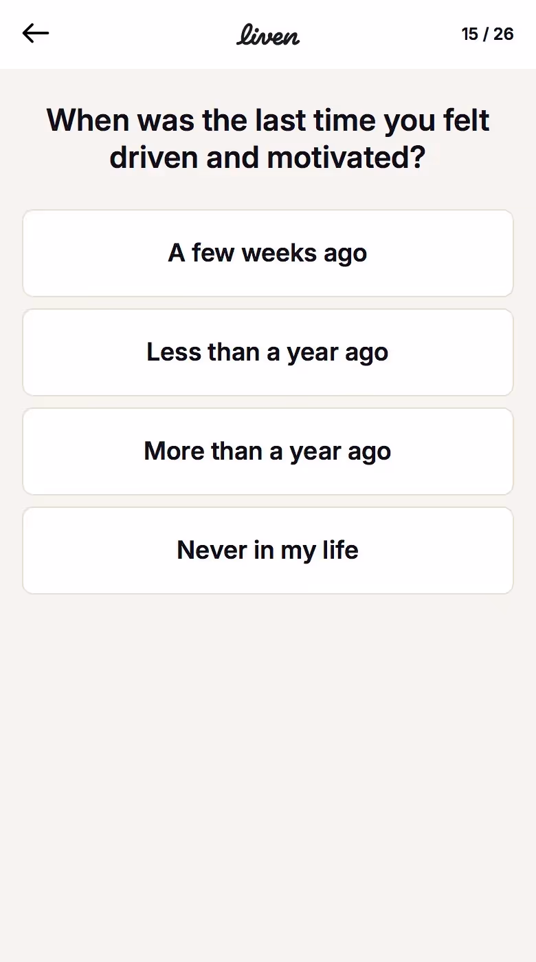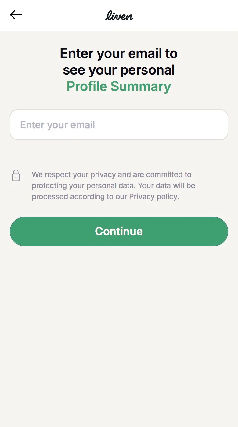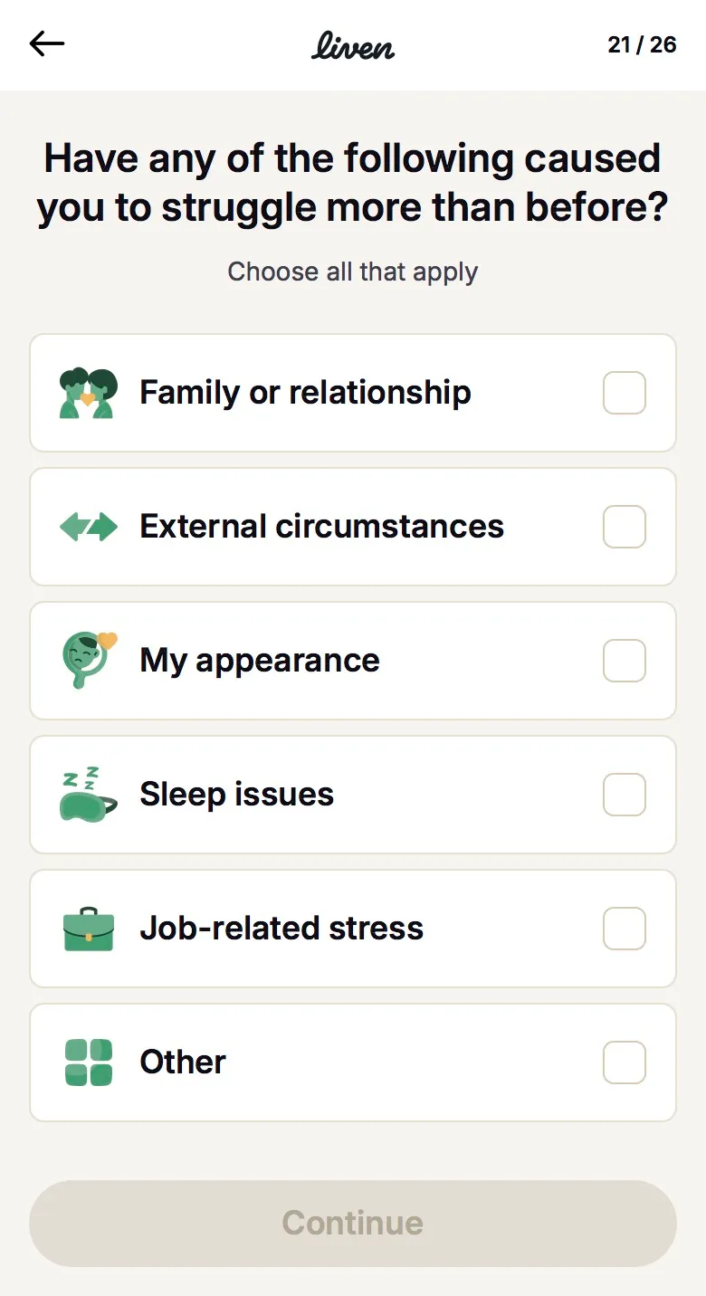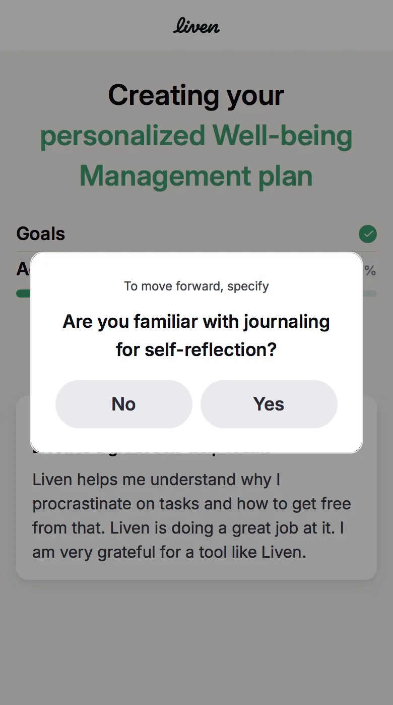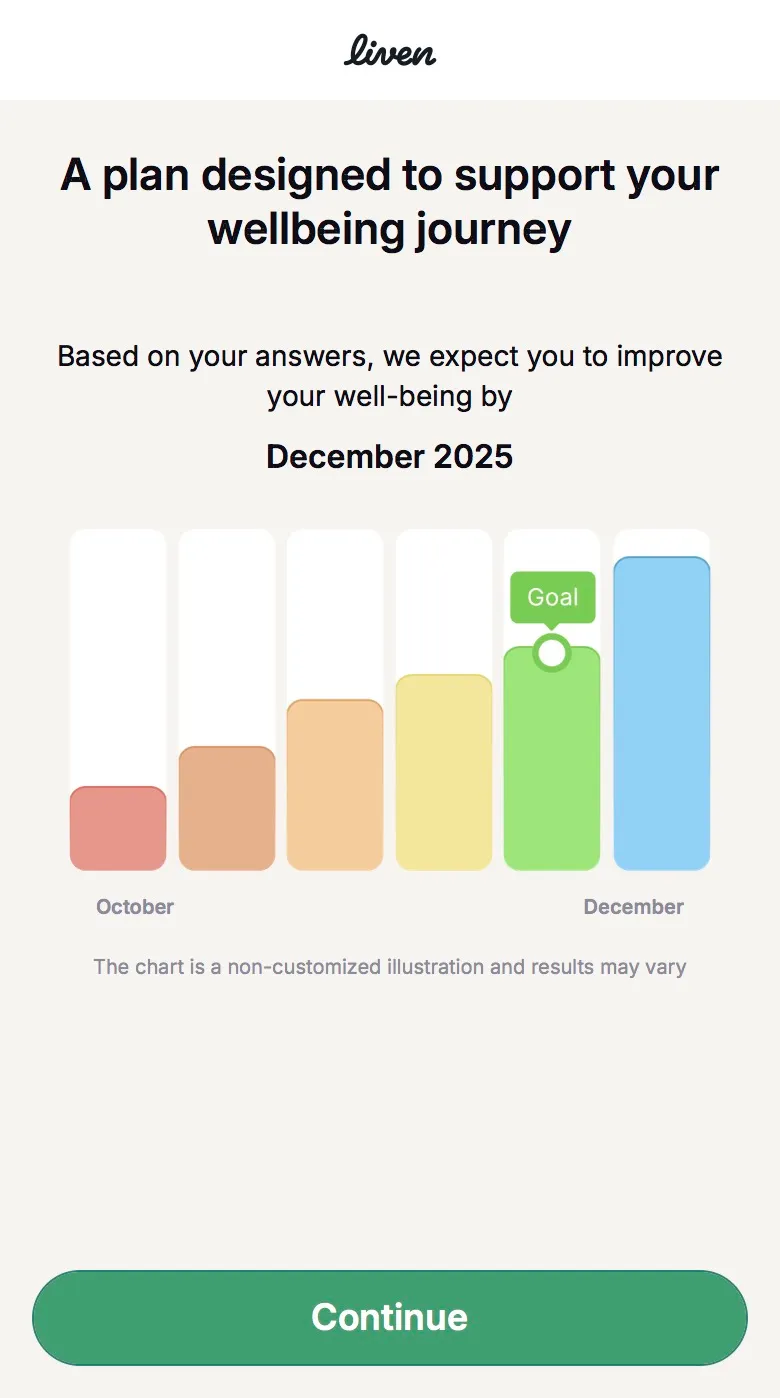Examining these screens reveals how Liven balances gathering personal insight with demonstrating value from the start. Also view their other flows — push notifications, email, and app onboarding — to observe how consistent messaging supports user trust and engagement. Useful for apps focused on mental health or wellbeing.