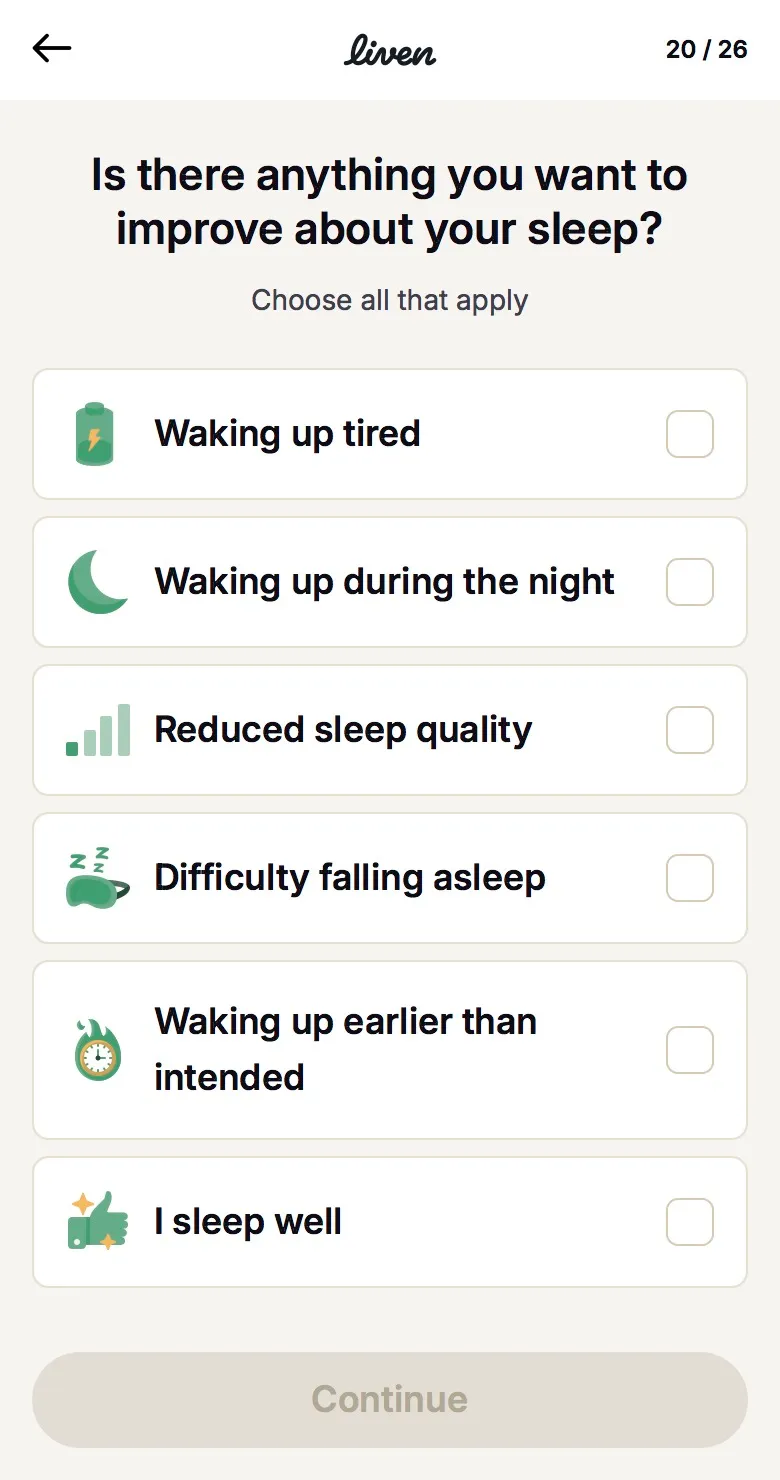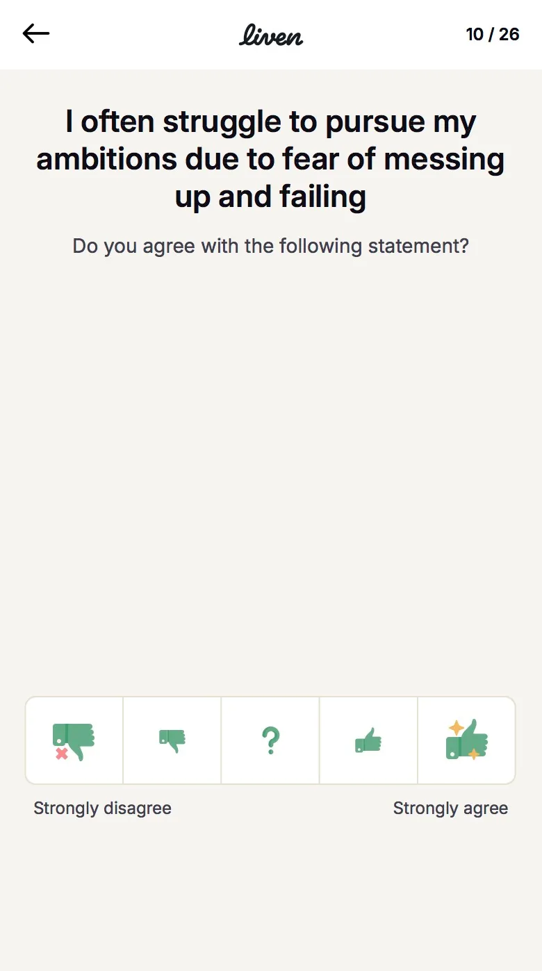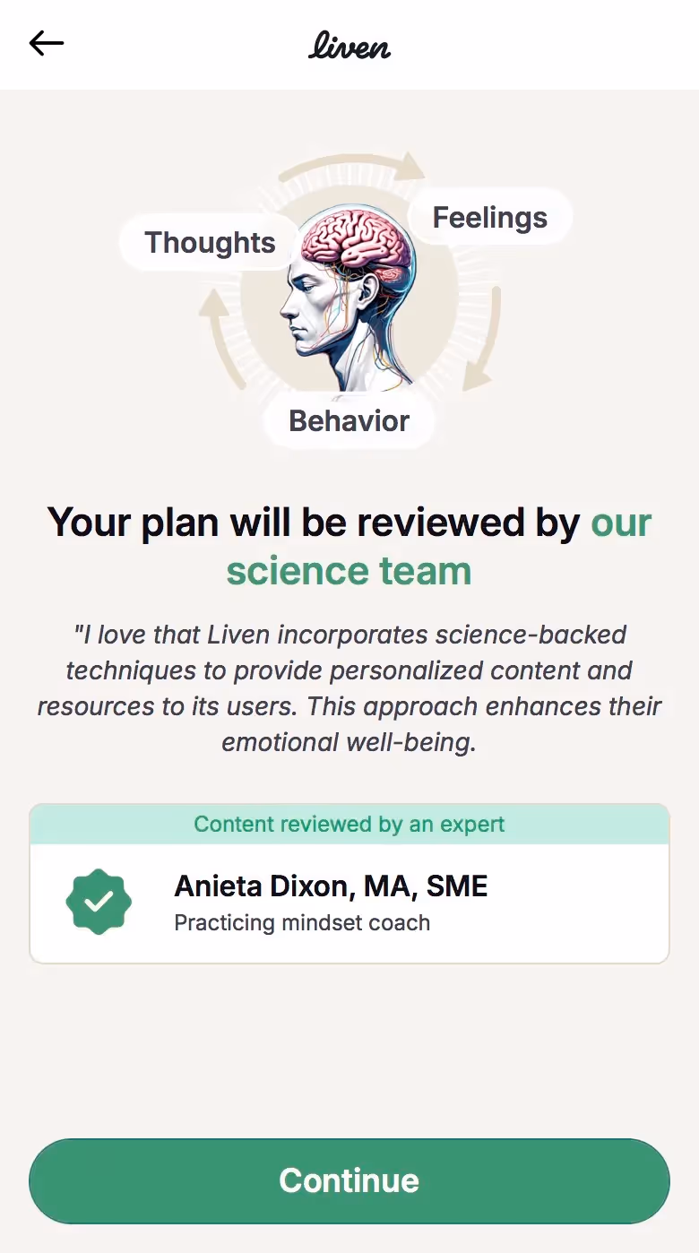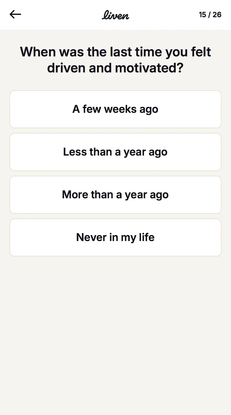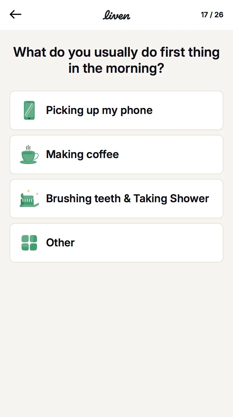 Examining these screens reveals how Liven balances gathering personal insight with demonstrating value from the start. Also view their other flows — push notifications, email, and app onboarding — to observe how consistent messaging supports user trust and engagement. Useful for apps focused on mental health or wellbeing.