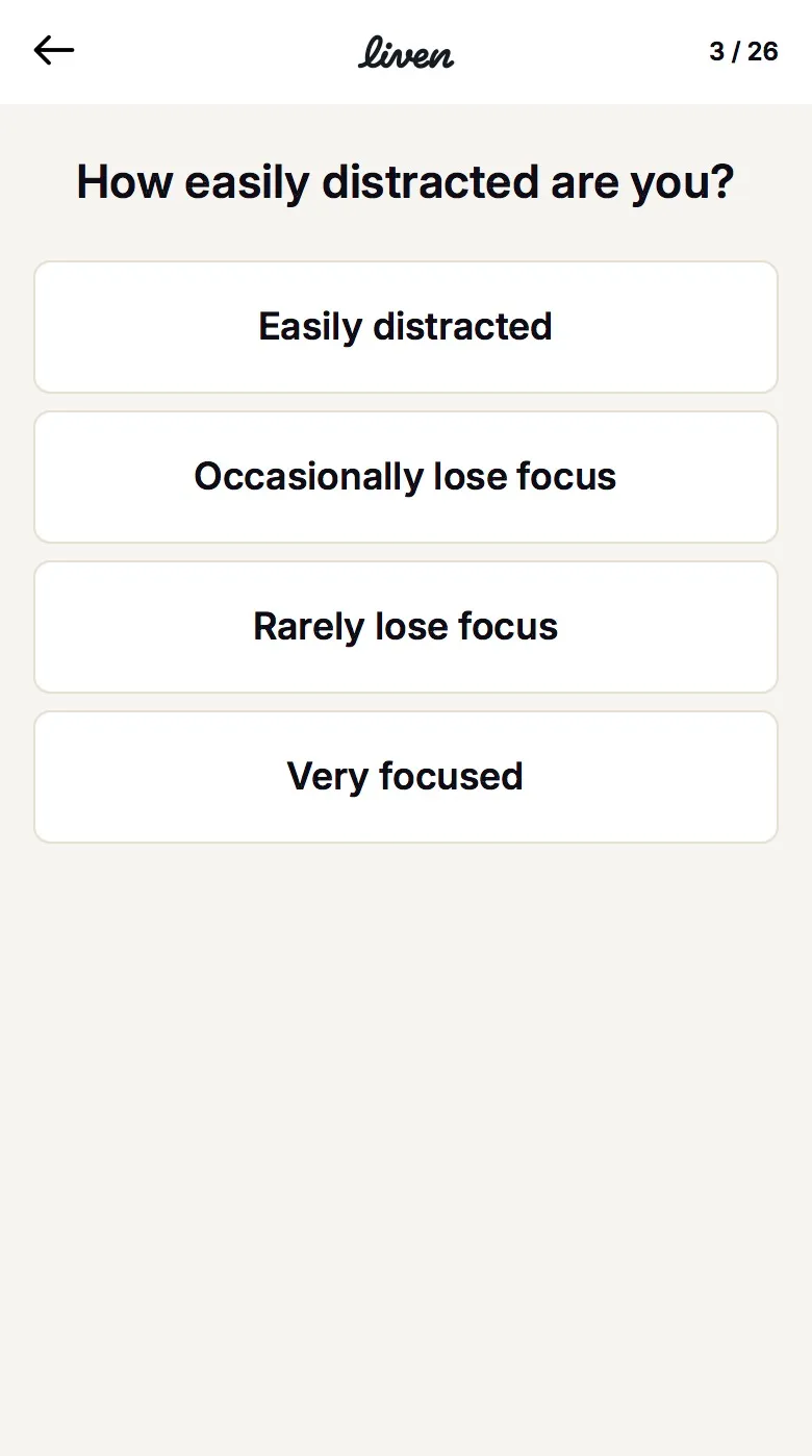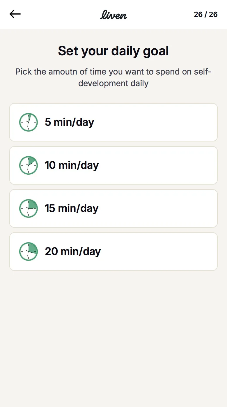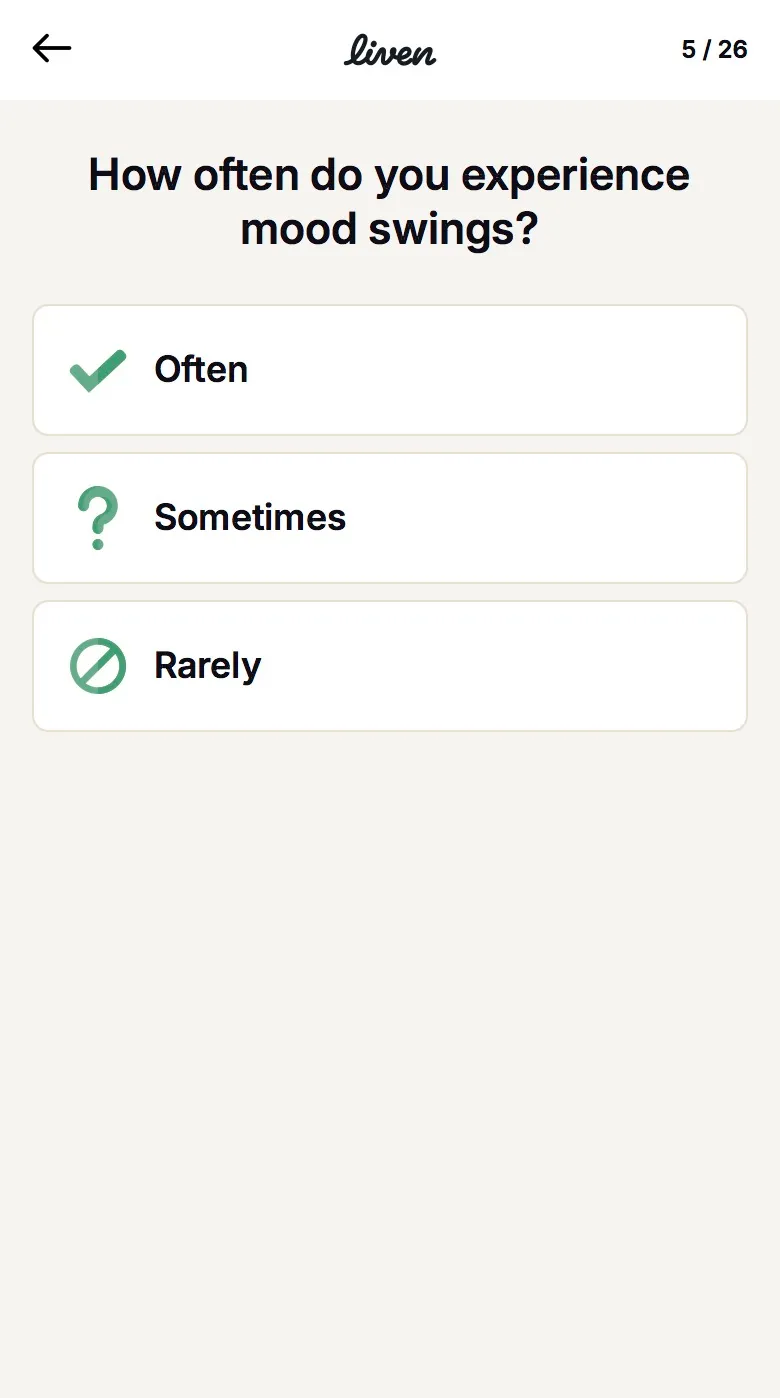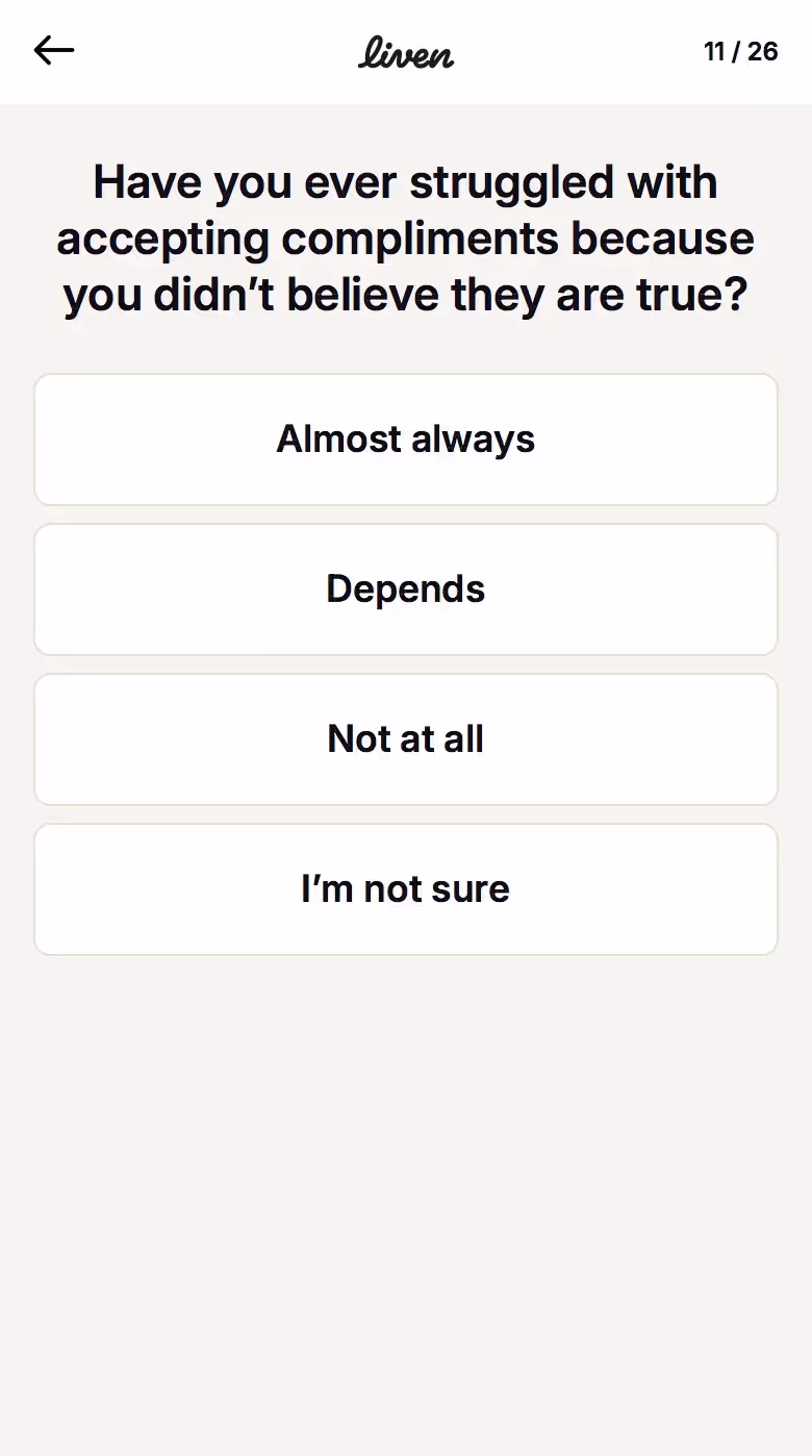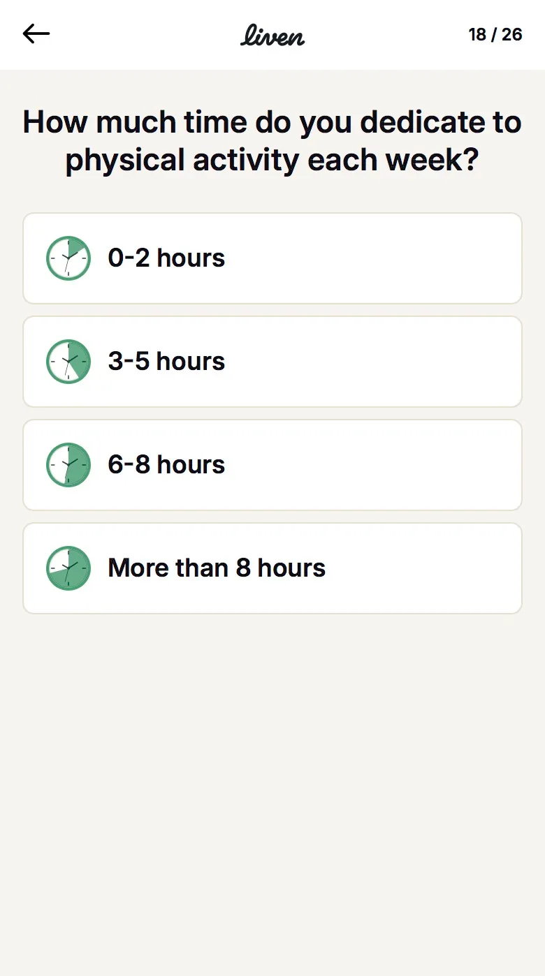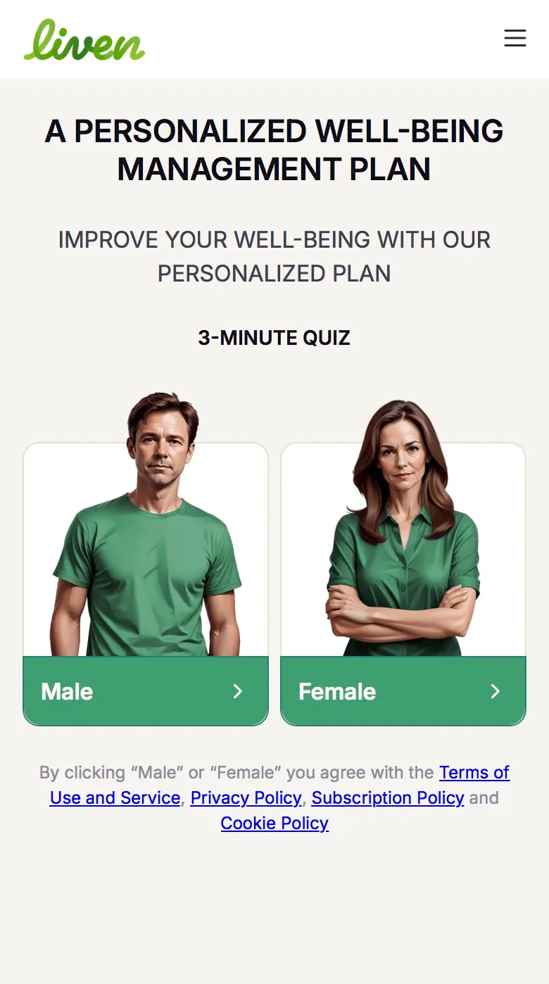 Examining these screens reveals how Liven balances gathering personal insight with demonstrating value from the start. Also view their other flows — push notifications, email, and app onboarding — to observe how consistent messaging supports user trust and engagement. Useful for apps focused on mental health or wellbeing.