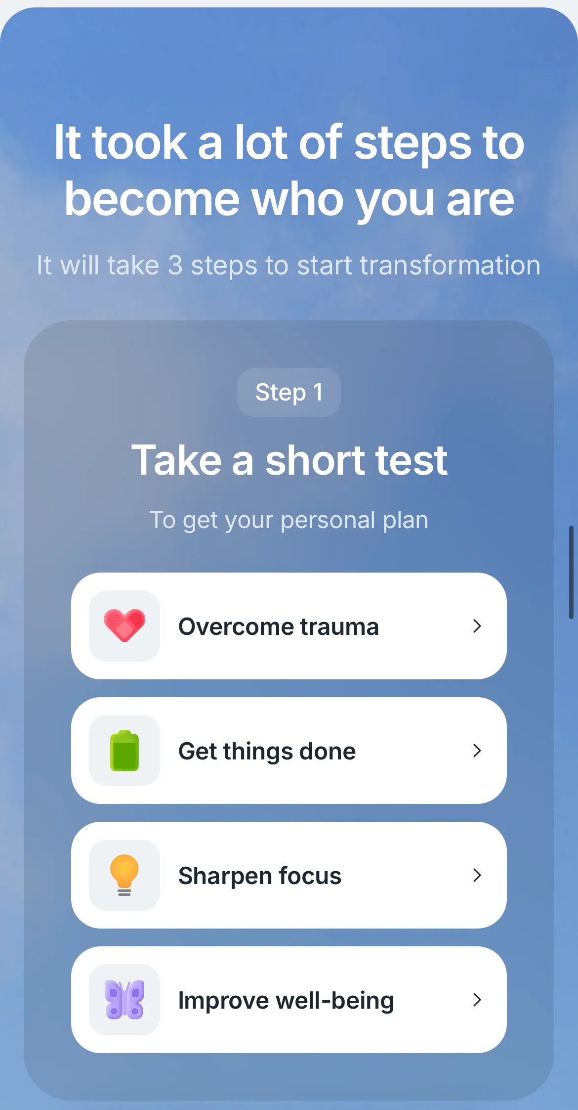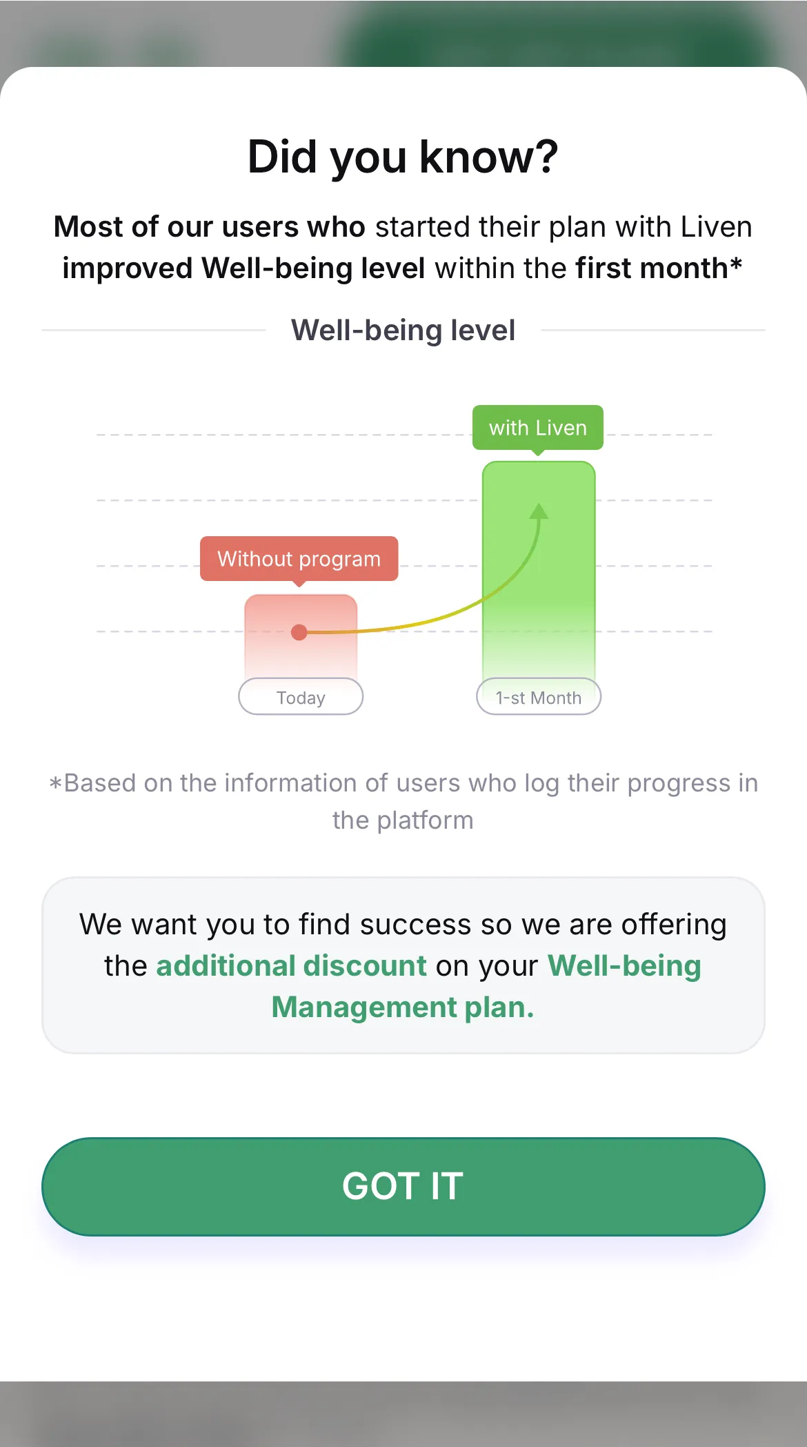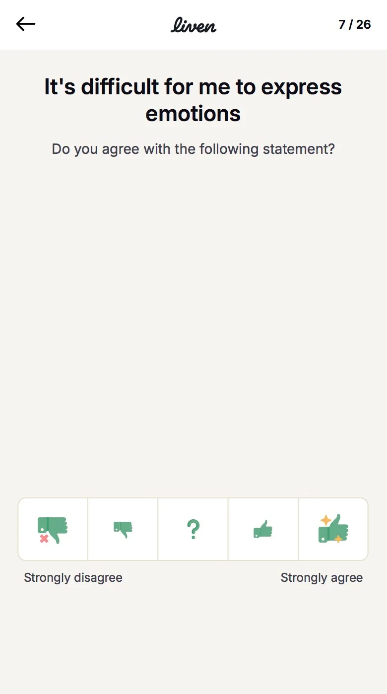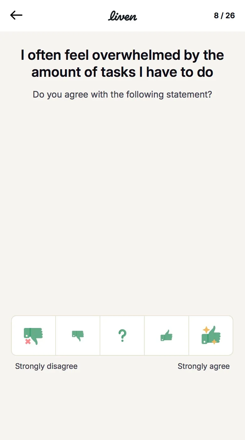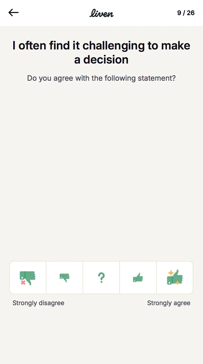 Examining these screens reveals how Liven balances gathering personal insight with demonstrating value from the start. Also view their other flows — push notifications, email, and app onboarding — to observe how consistent messaging supports user trust and engagement. Useful for apps focused on mental health or wellbeing.