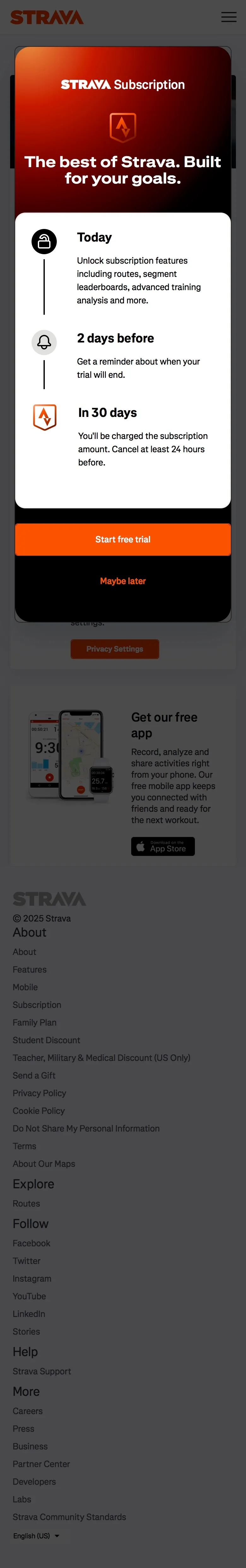 Examine each screenshot to see how Strava structures onboarding to reduce friction, build trust, and motivate first activity. Also review Strava’s email and mobile push notification flows to see how they reinforce new user engagement. This flow is useful for designers, marketers, and developers working on community-oriented or fitness tracking web products.