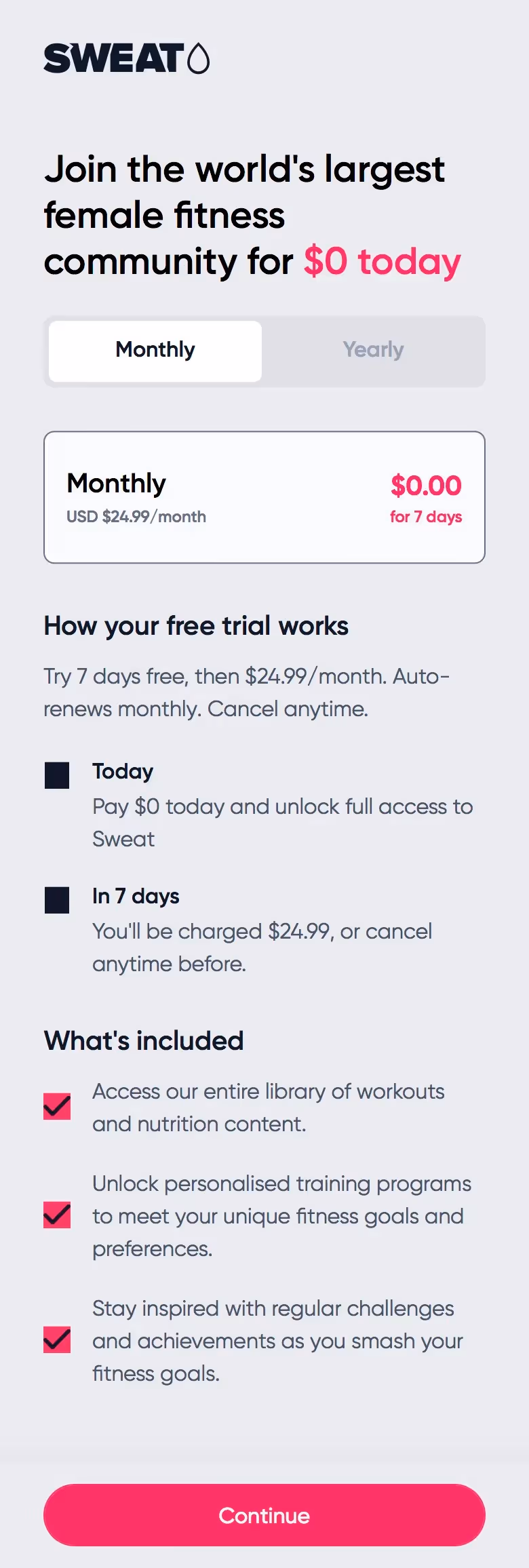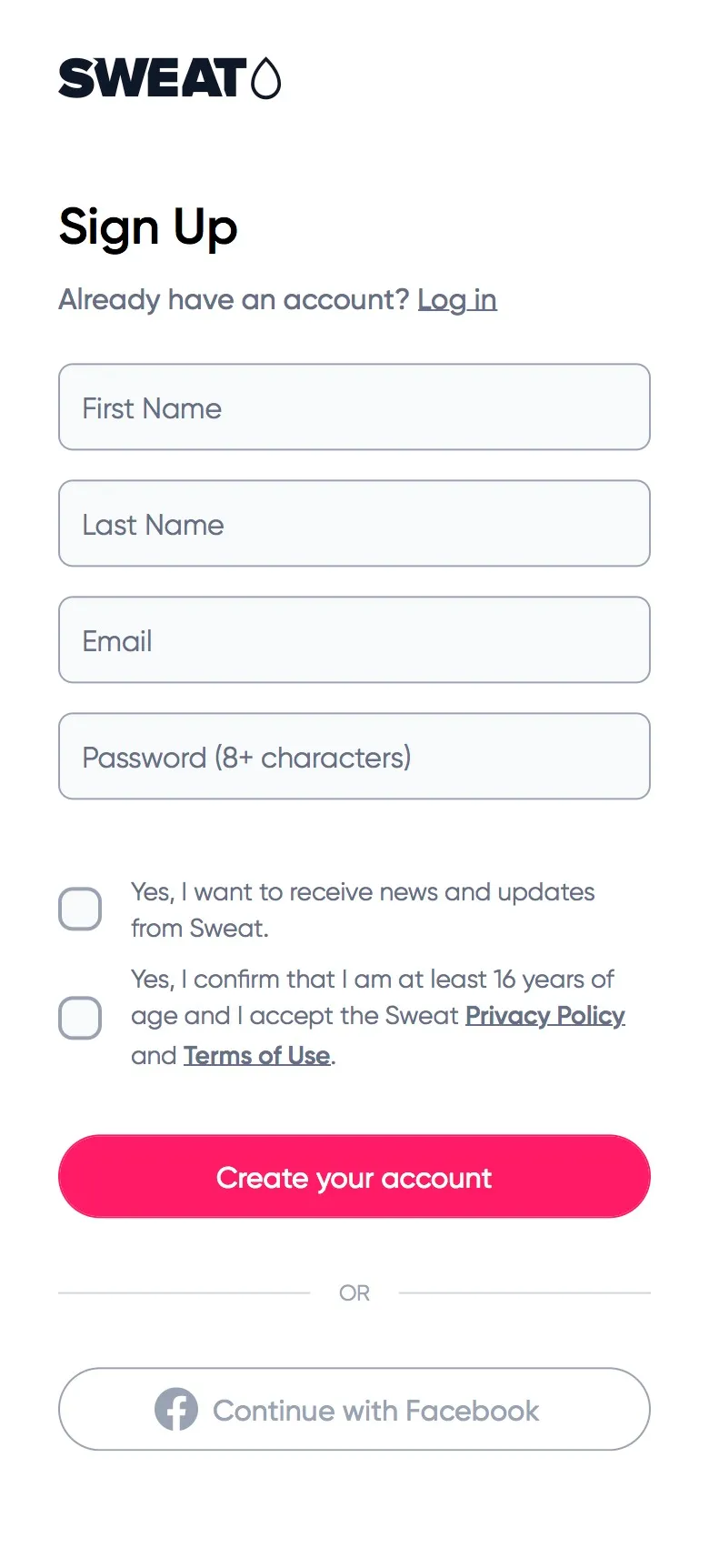Inspect the screenshots to understand how Sweat ensures relevance early, avoiding generic onboarding by collecting user data that drives personalization. Also compare with their mobile push and email flows, and their app onboarding flow, to see how cross-channel messaging supports consistency. Valuable reference for fitness or wellness platforms.